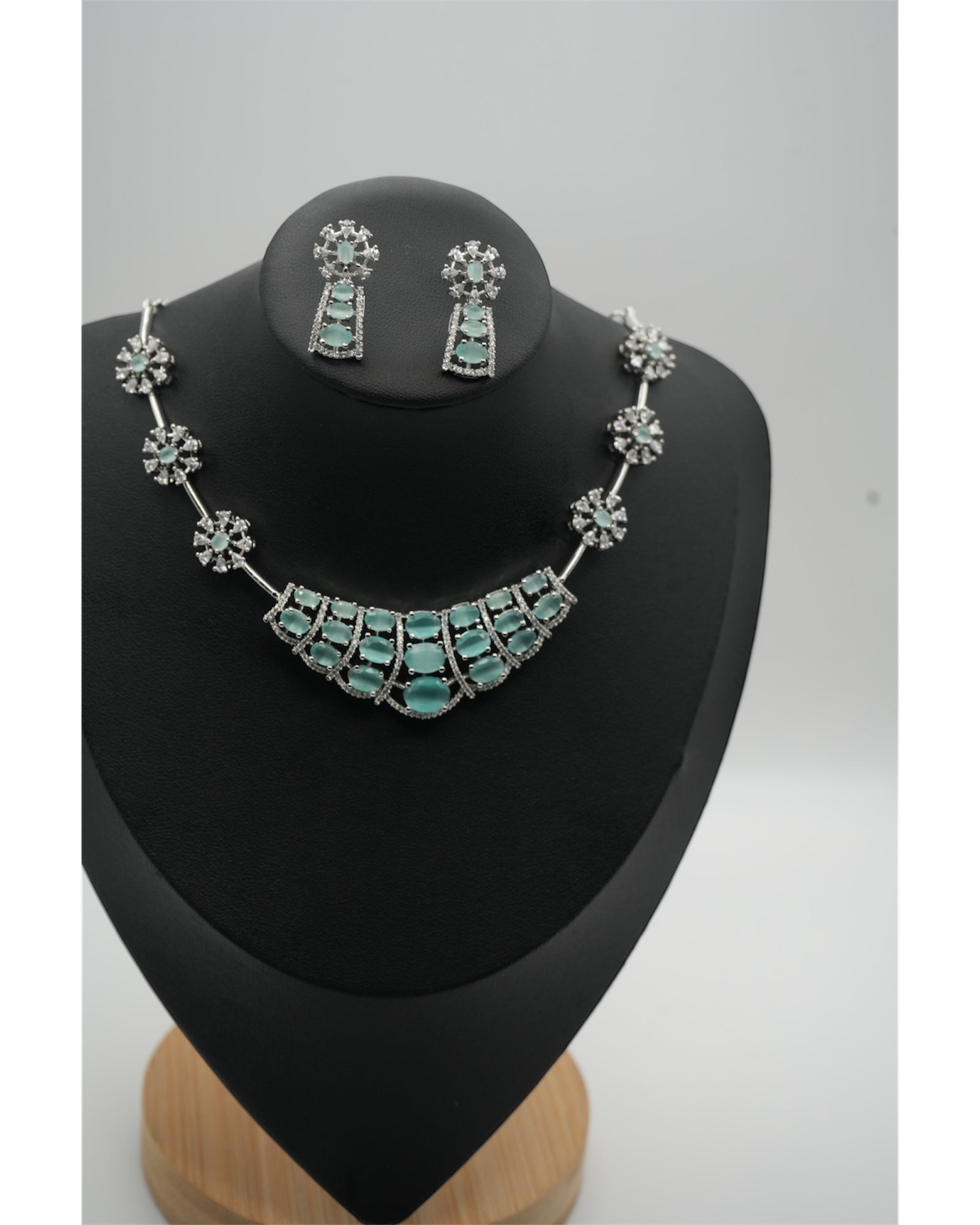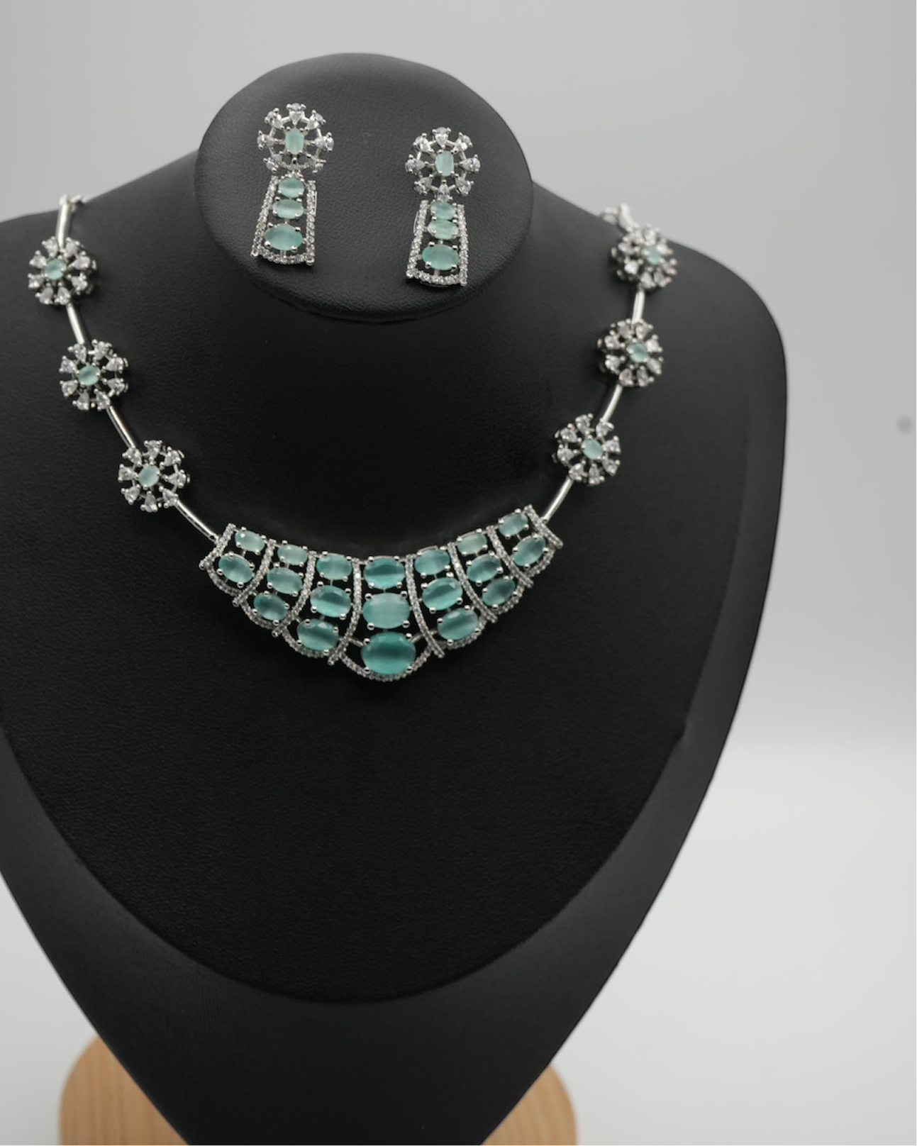 This captivating necklace features a striking central design of multiple rows of elegant aqua-toned stones, framed by sparkling clear accents. The necklace chain is adorned with delicate, flower-like clusters of matching aqua and clear stones. Completing the look are coordinating stud earrings, mimicking the floral motifs with their aqua gems and shimmering surrounds. This set offers a refreshing pop of color and sophisticated sparkle, perfect for enhancing any ensemble.