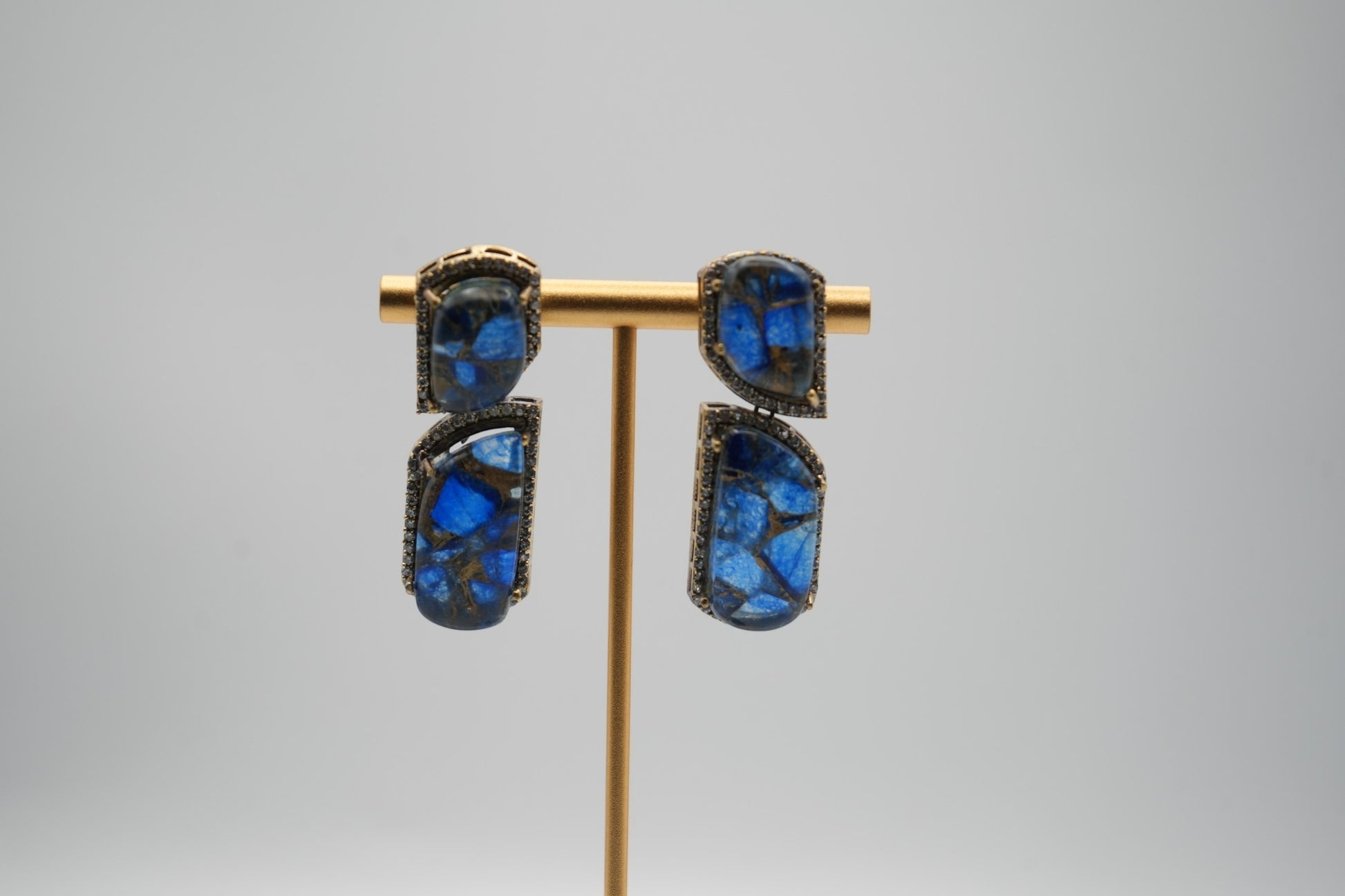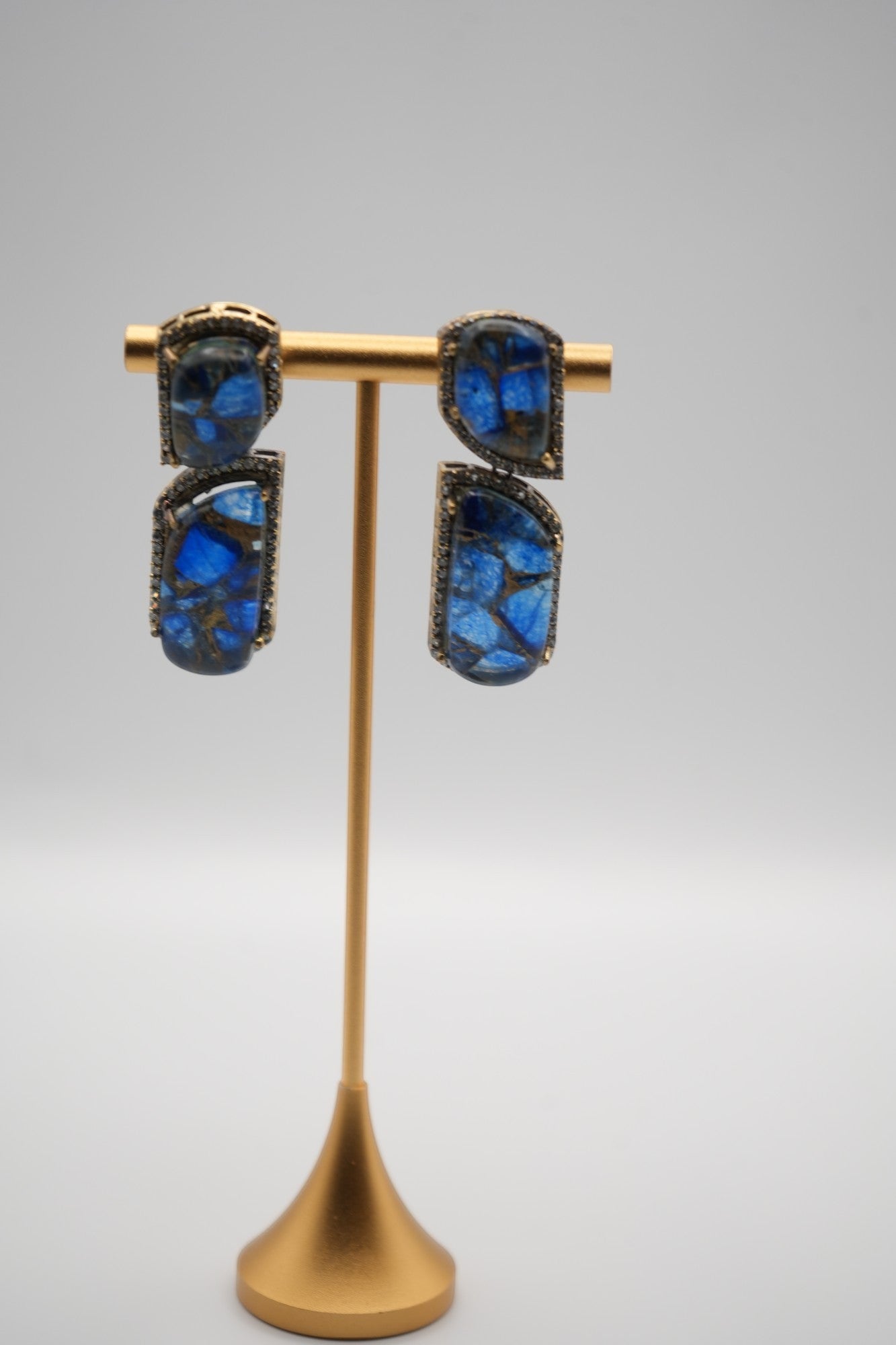 Dive into the mesmerizing beauty of the "Azure Depths" Labradorite Drop Earrings. Each earring showcases a unique, freeform labradorite gemstone, celebrated for its captivating play of color known as labradorescence. Encased in an intricately textured, antique gold-toned setting, these earrings exude an earthy elegance with a touch of bohemian sophistication. Perfect for adding a subtle yet enchanting statement to your everyday style or special occasions.