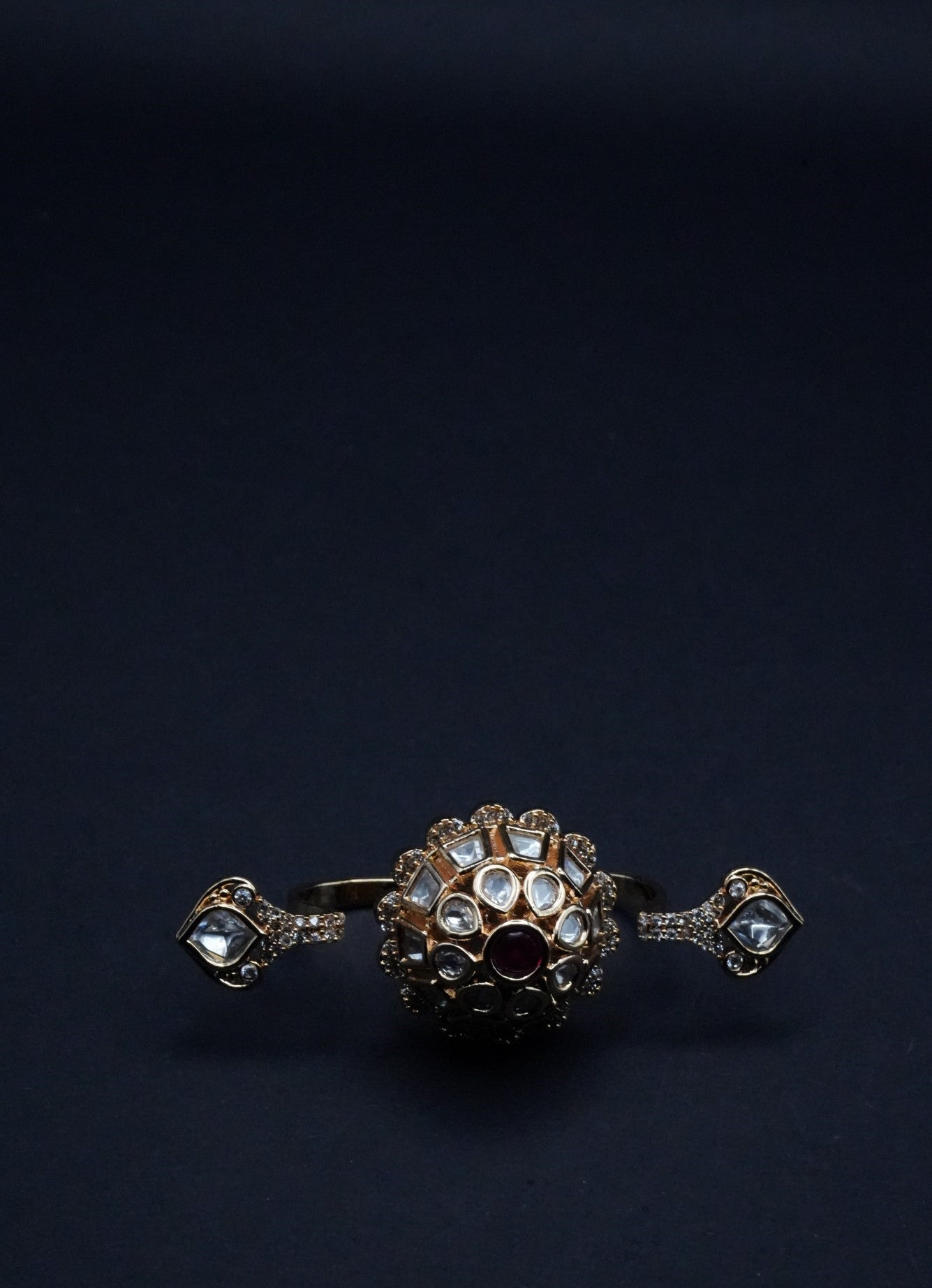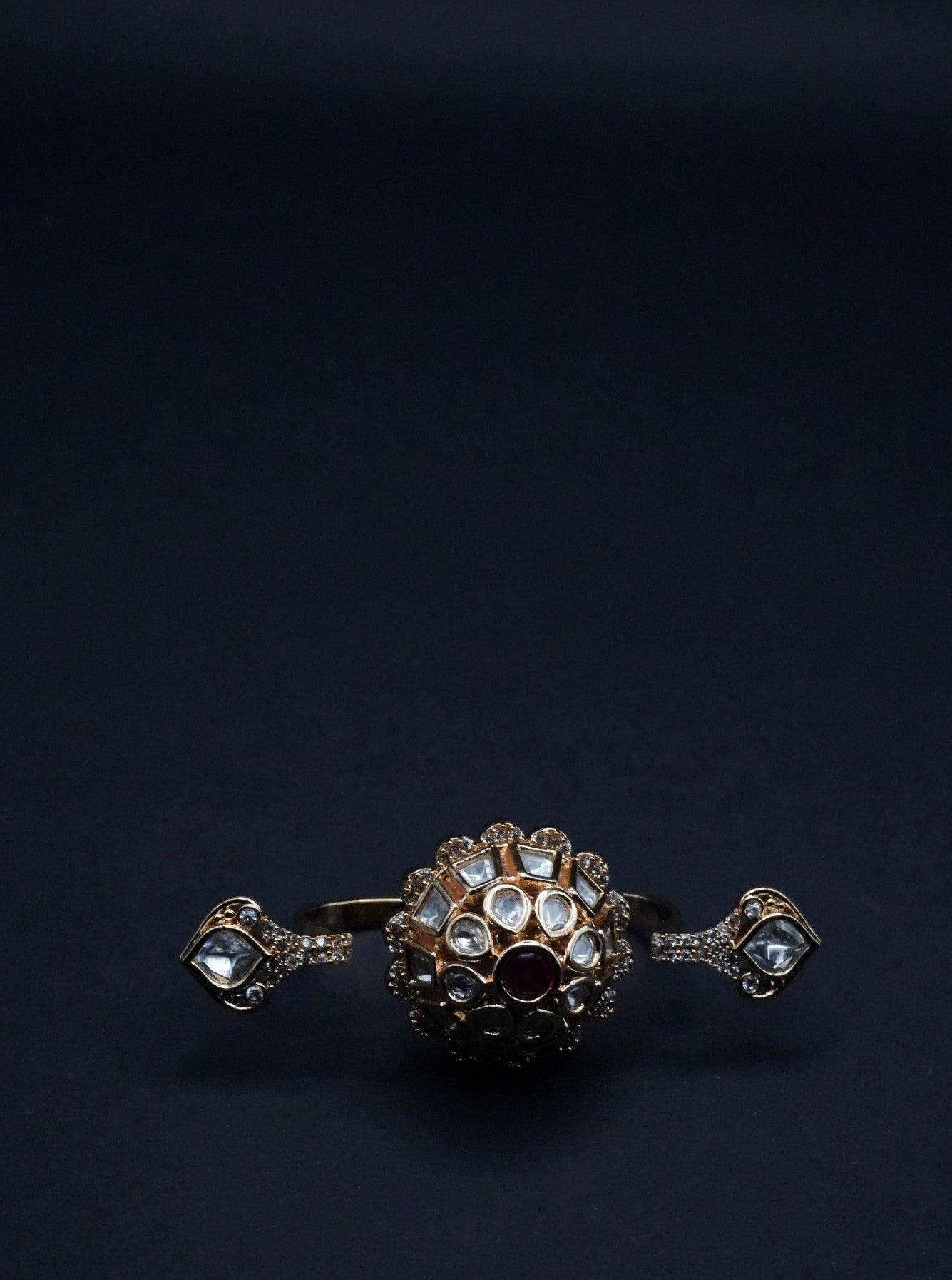 This exquisite piece from Lustrous Jewels features a unique dome-shaped design adorned with beautifully cut Cubic Zirconia (CZ) stones. The center is highlighted by a stunning ruby-colored gemstone, adding a pop of vibrant color to the intricate structure. The delicate band is also embellished with CZ stones, creating a perfect balance of sparkle and elegance. This ring is ideal for anyone looking to make a bold statement with an artistic, luxurious design.