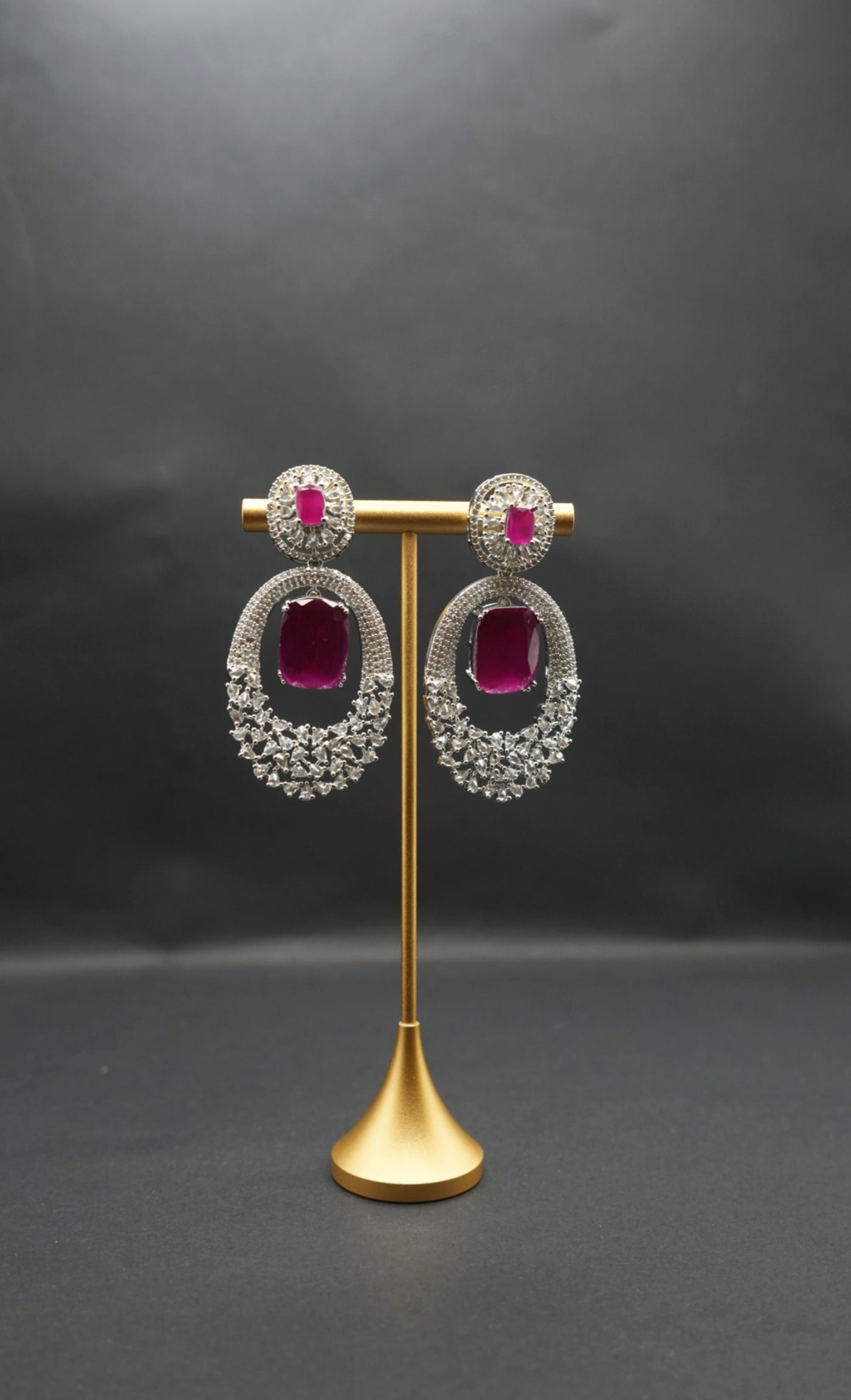 These stunning earrings are adorned with shimmering cubic zirconia (CZ) stones, set in an intricate crescent Round design. The centerpiece of each earring showcases a bold Pink gemstone, elegantly suspended within CZ stones, adding a dazzling sparkle. These earrings are perfect for making a statement at special events or parties😊