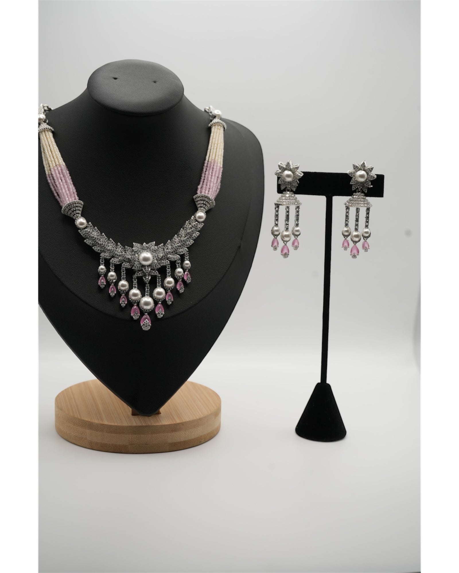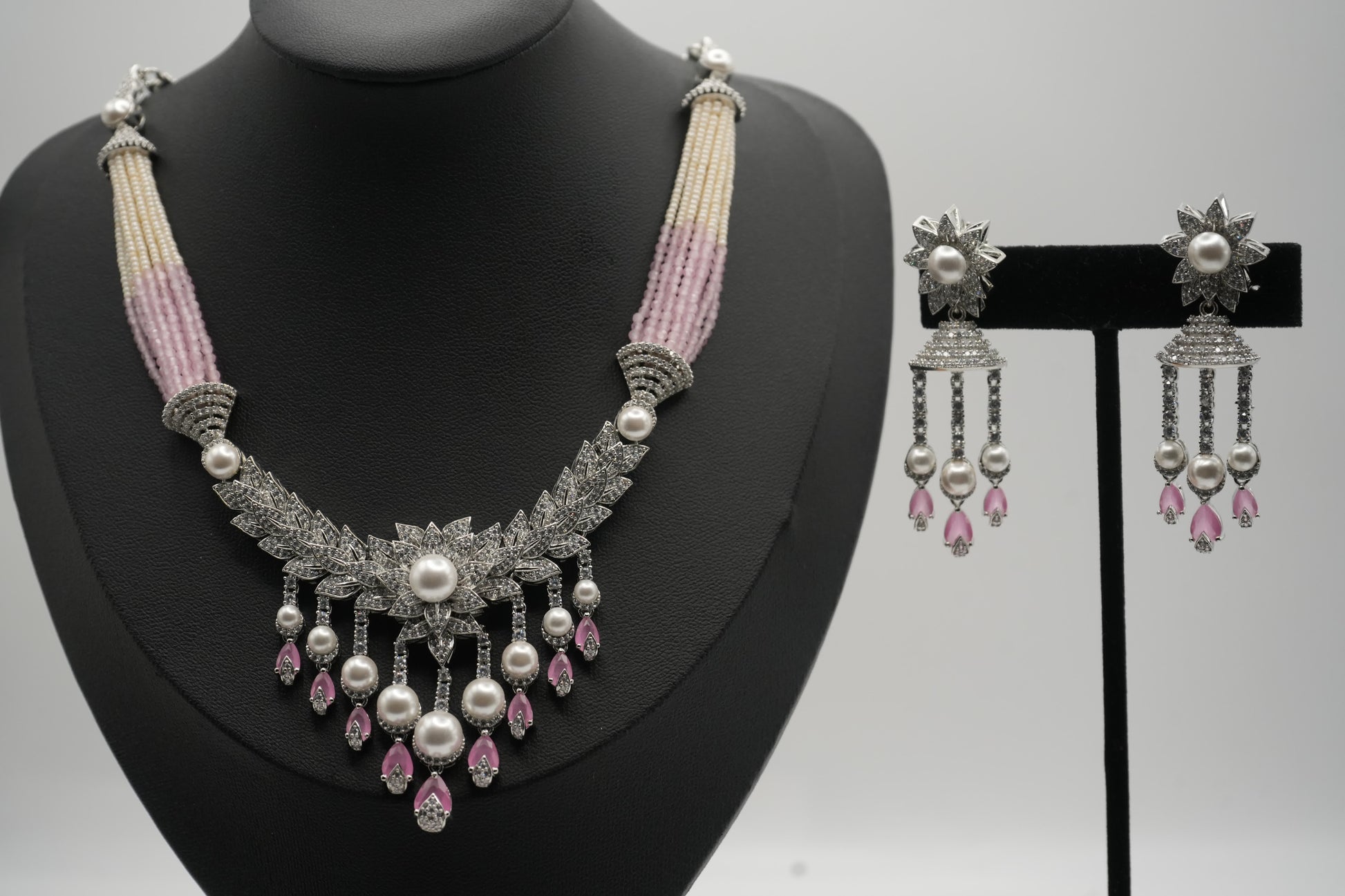 This exquisite necklace features a multi-strand design of delicate pink and white pearls, leading to an ornate, sparkling centerpiece adorned with clear stones and a prominent pearl drop. Cascading from the focal point are delicate pink and clear stone droplets, adding movement and sparkle. The matching chandelier earrings echo the intricate floral motifs and feature elegant pearl and pink stone drops. This set blends classic elegance with a touch of soft color, perfect for sophisticated occasions.