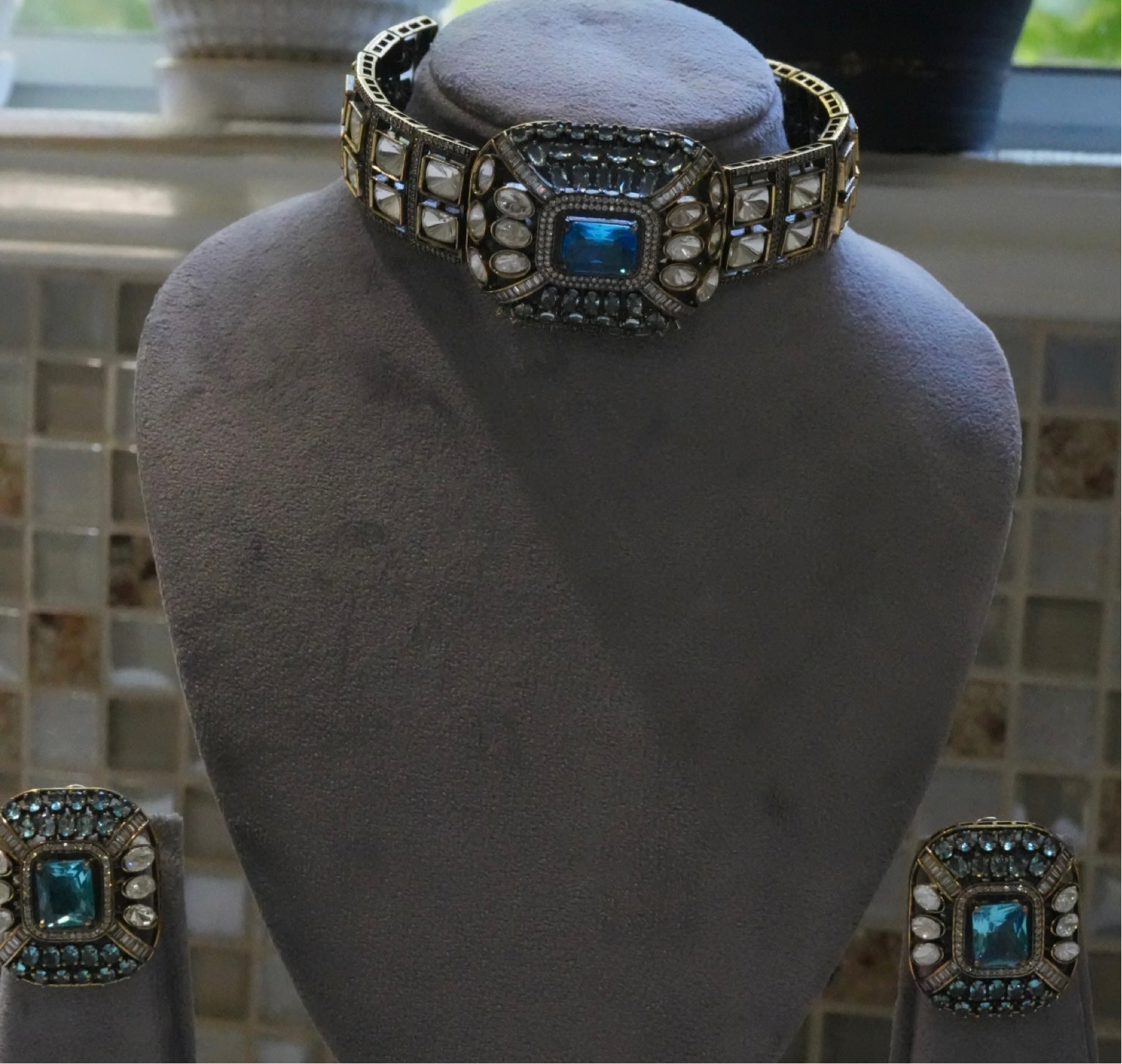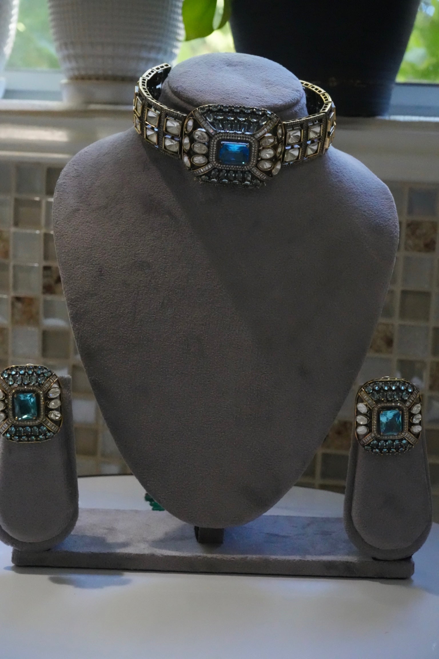 This striking choker set features an antique gold-tone band adorned with a prominent central square motif, showcasing a vibrant teal-colored stone surrounded by intricate detailing and small pearl-like accents. The chunky design of the choker makes a statement, while the matching stud earrings echo the central square and teal stone, creating a cohesive and eye-catching ensemble. Displayed on a grey jewelry bust, this set is perfect for adding a touch of dramatic elegance to any attire.