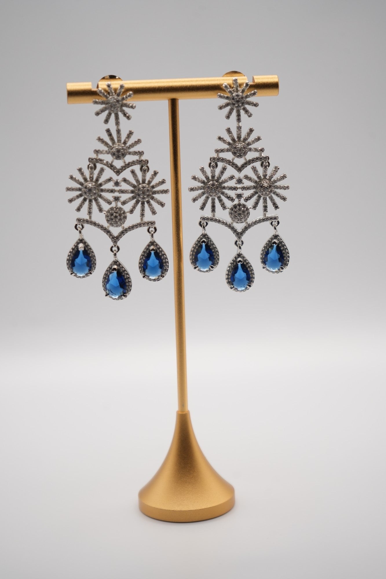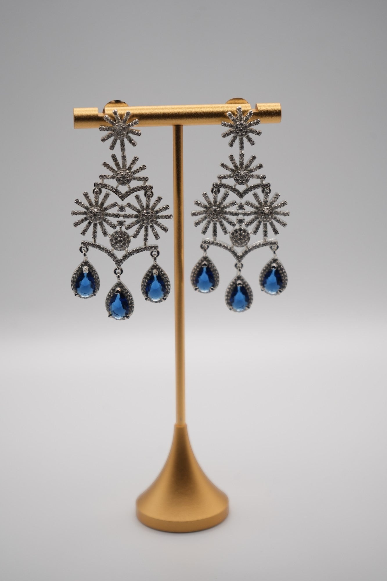 Evoke the dazzling beauty of a starlit night with the "Celestial Cascade" Drop Earrings. These glamorous earrings feature a multi-tiered, chandelier-inspired design adorned with sparkling crystals and captivating sapphire-blue gemstones. The intricate, starburst-like elements and the cascading arrangement of the blue drops create a sophisticated and eye-catching accessory, perfect for adding a touch of celestial elegance to any special occasion.