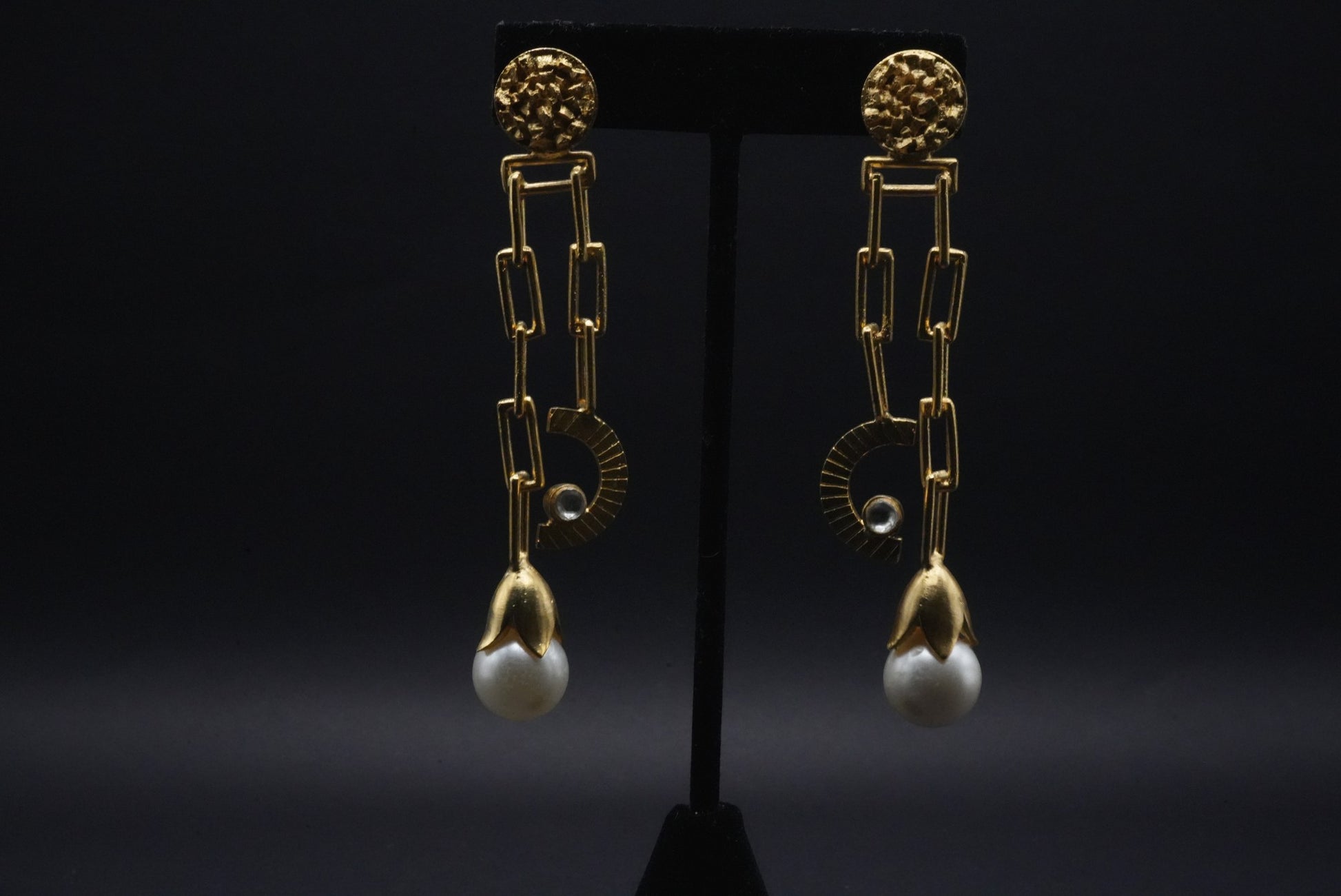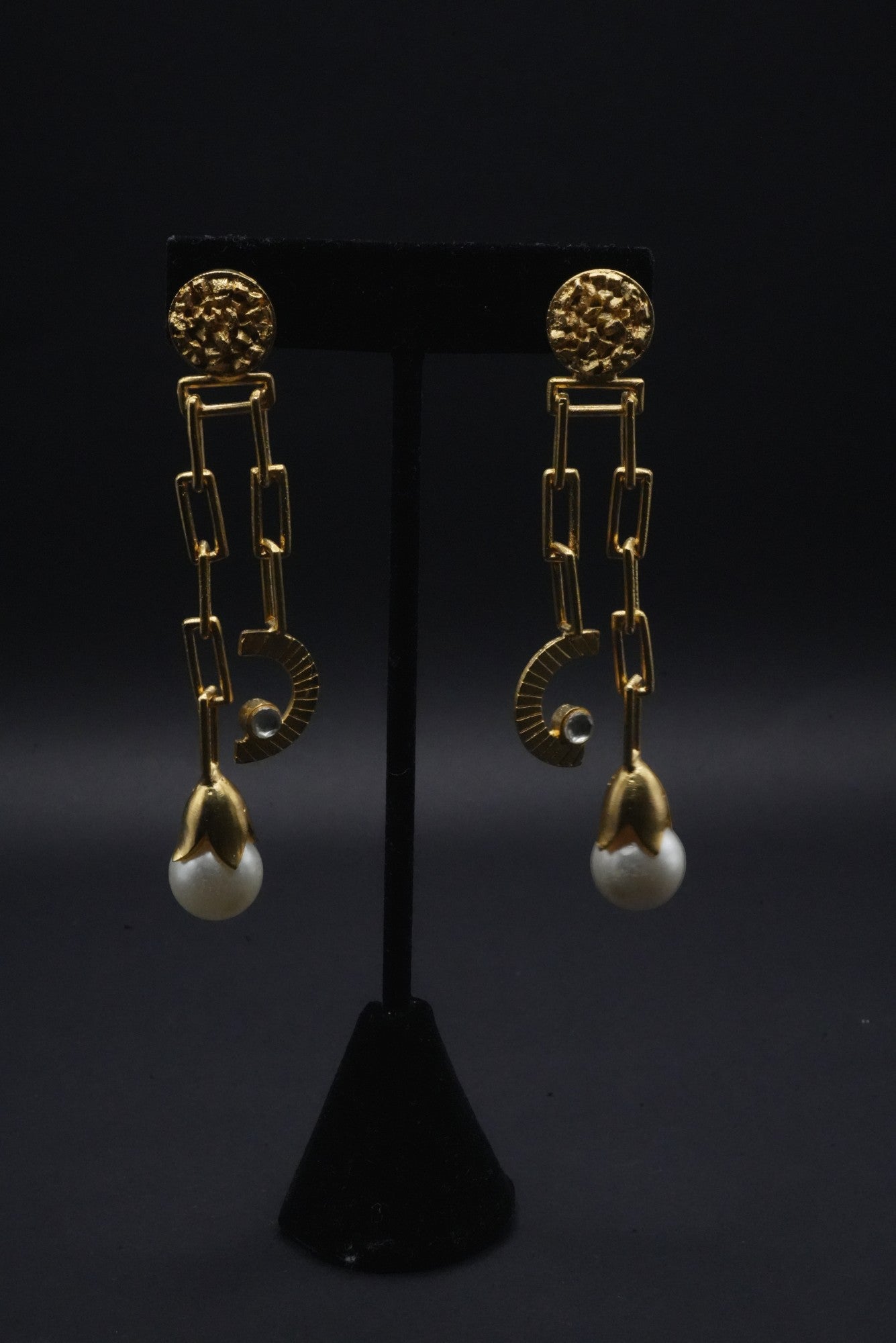 - Design: The earrings commence with a textured, hammered gold-toned disc symbolizing the sun, followed by a linear succession of chain links. A crescent moon adorned with a single opalescent stone nestles midway, leading to a lustrous pearl drop encased in a delicate gold-toned cap.