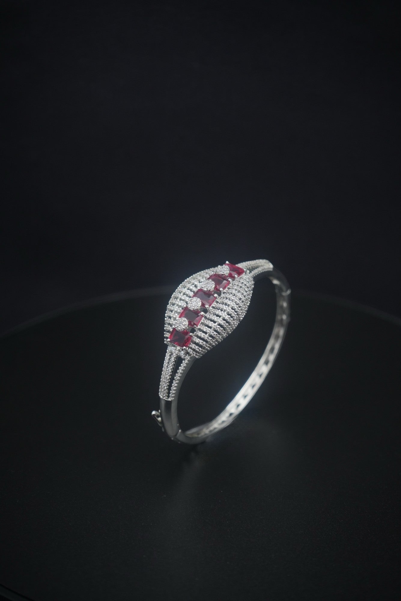 Introducing the "Crimson Allure" bangle, a captivating piece that combines the rich allure of ruby-red stones with the dazzling brilliance of zircons. This bracelet features a unique, eye-catching design, making it a perfect accessory for adding a touch of glamour and sophistication to any outfit.