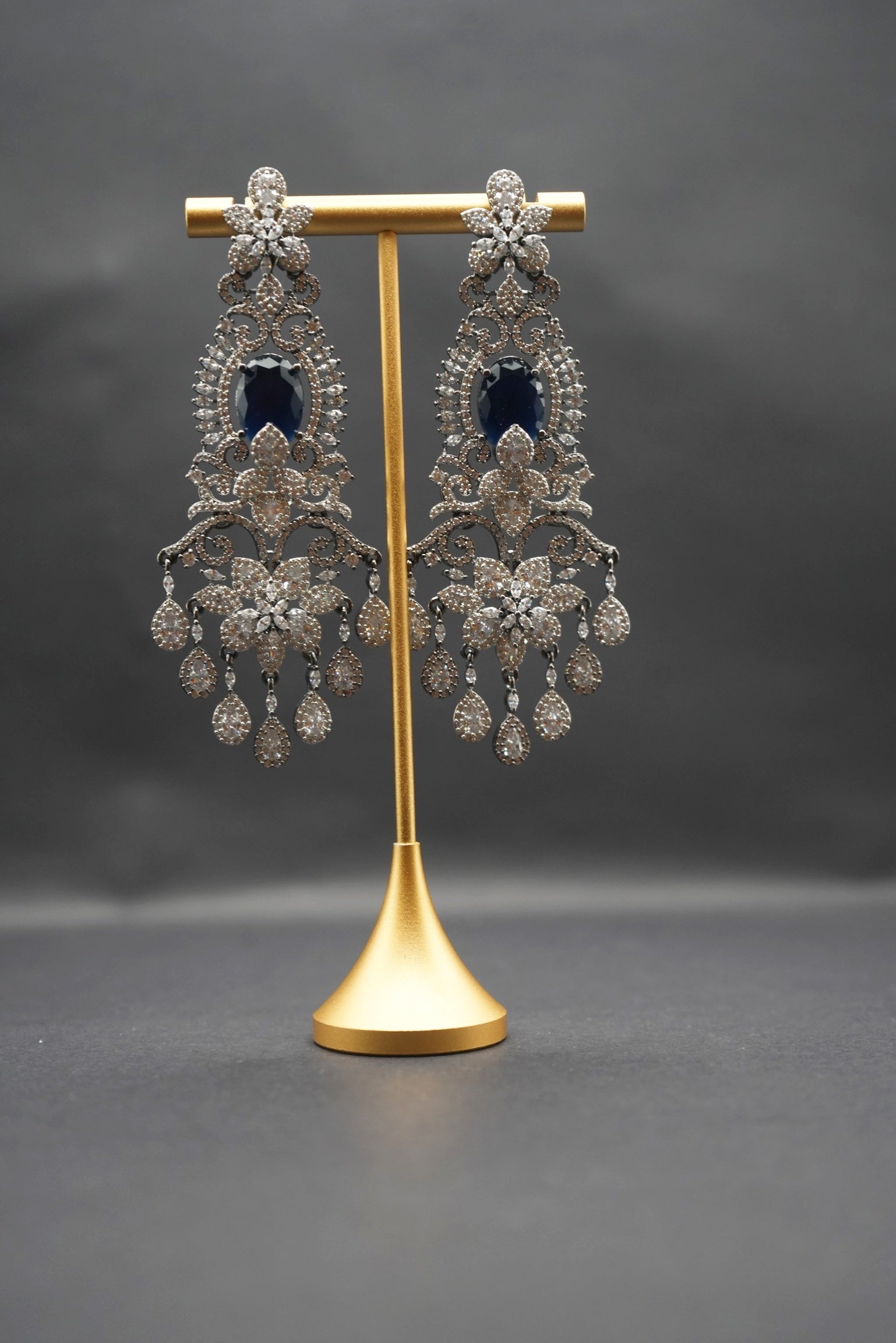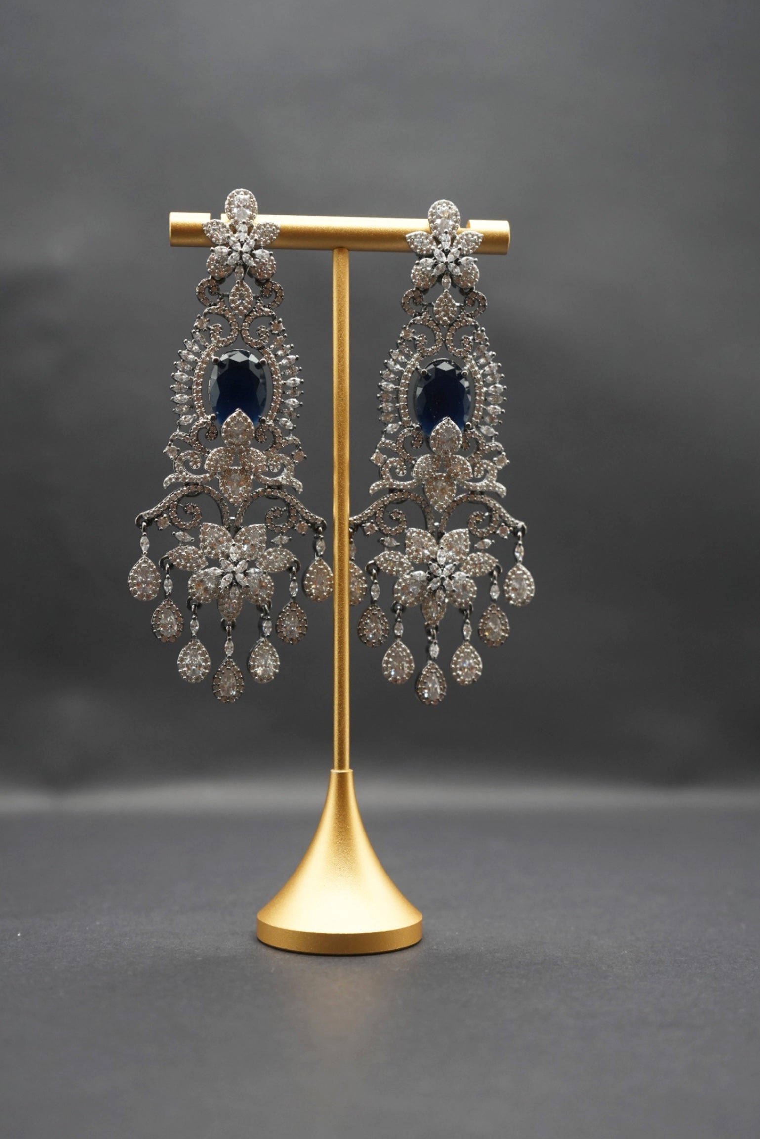 Indulge in the allure of these dazzling blue sapphire and crystal chandelier earrings. These earrings are a masterpiece of sparkle and elegance, featuring a captivating combination of deep blue sapphire-colored stones and shimmering clear crystals. The intricate design and cascading silhouette make them the perfect accessory for adding a touch of glamour to any special occasion.
