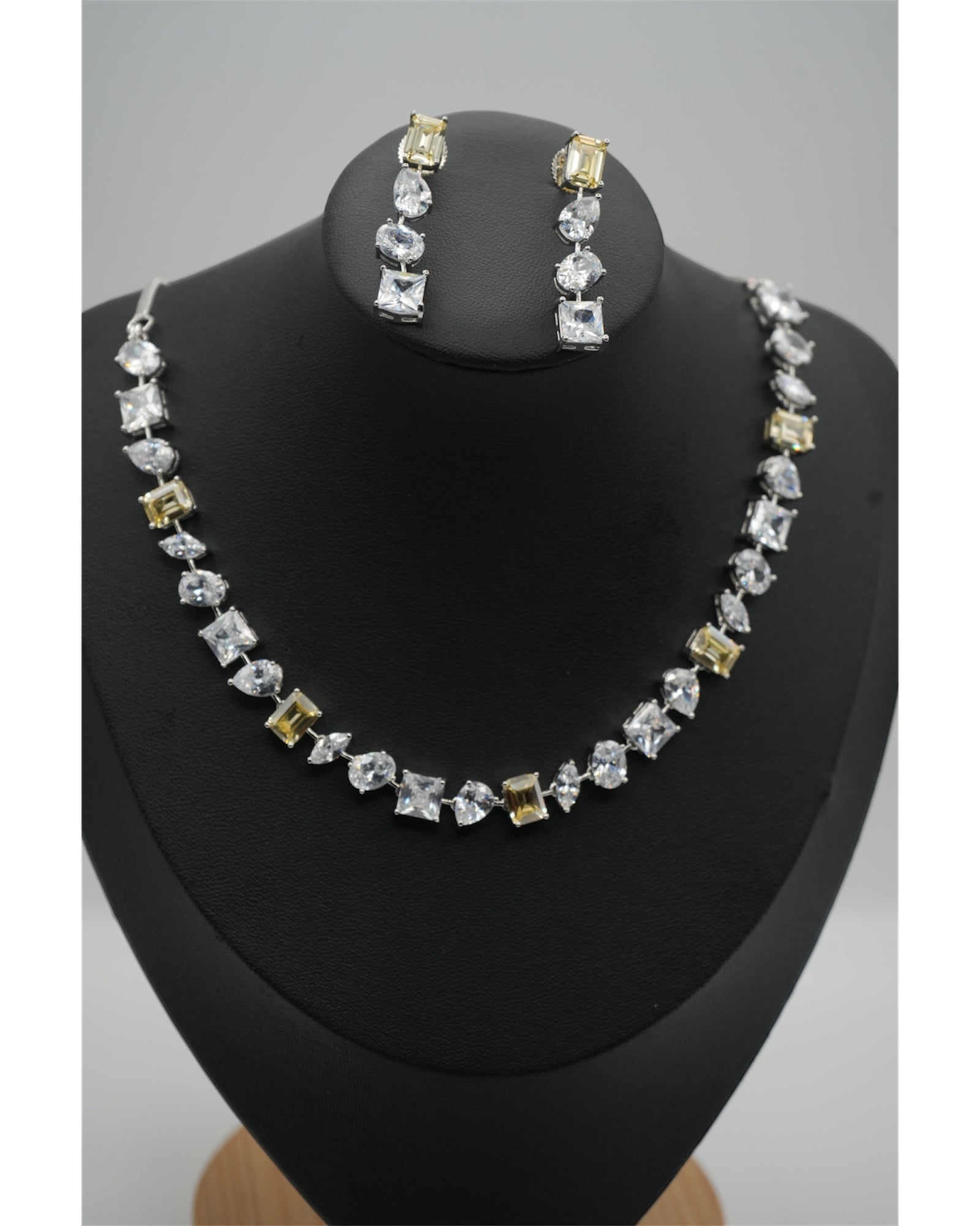 This captivating necklace set features a continuous line of sparkling clear and soft yellow stones in assorted geometric cuts. Each stone is individually set, creating a fluid and brilliant design that gracefully adorns the neckline. The coordinating drop earrings mirror the necklace's eclectic charm, showcasing both clear and yellow geometric gems. This versatile set adds a sophisticated touch of sparkle to any outfit, perfect for both special occasions and everyday elegance.