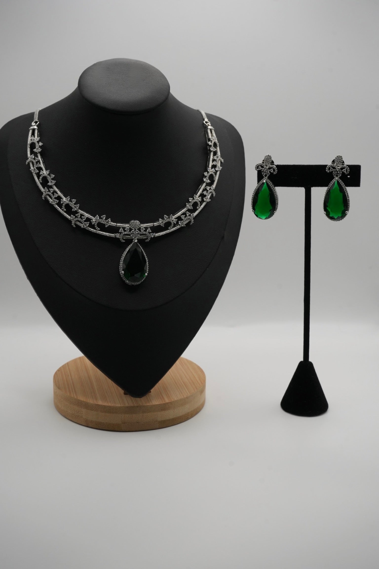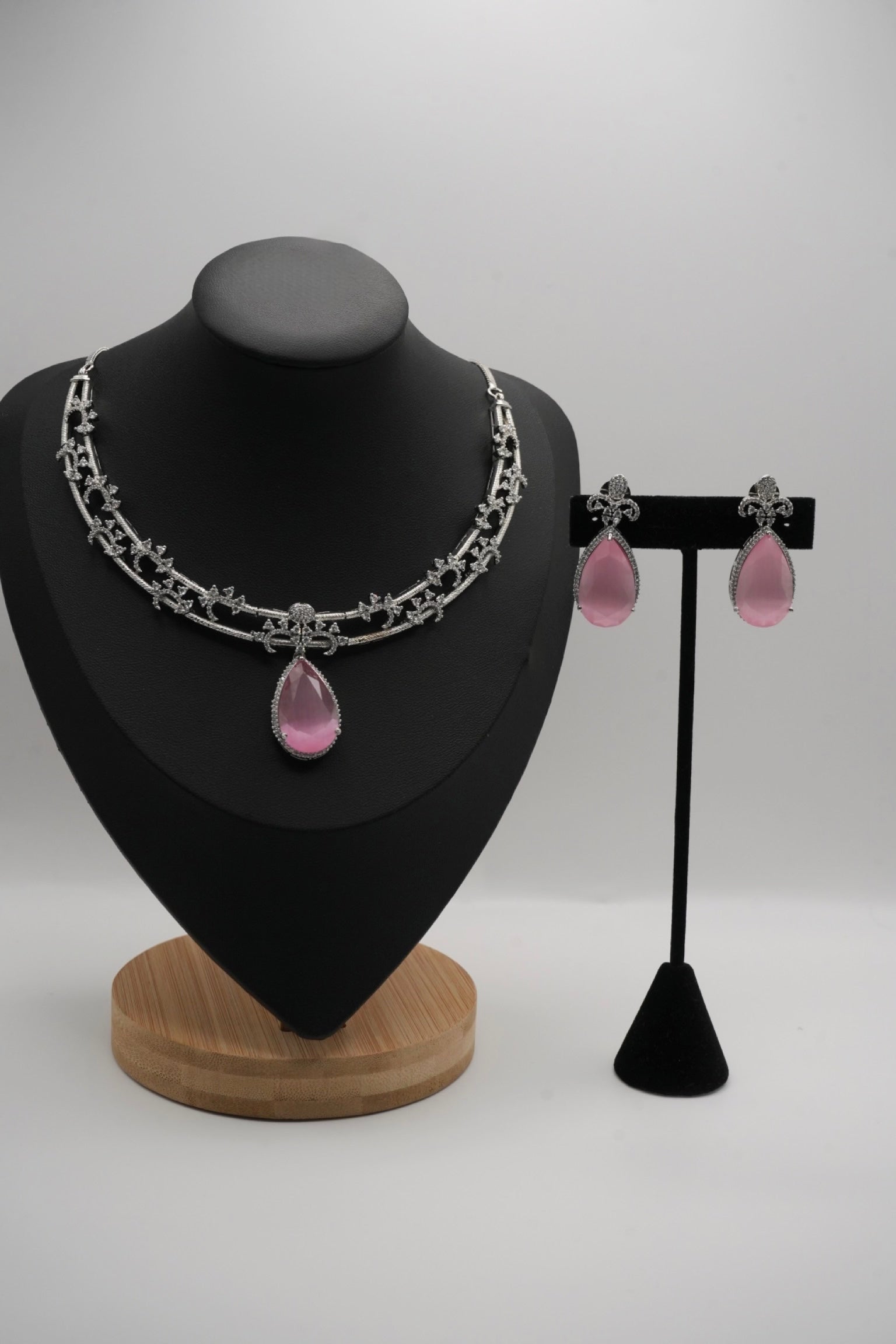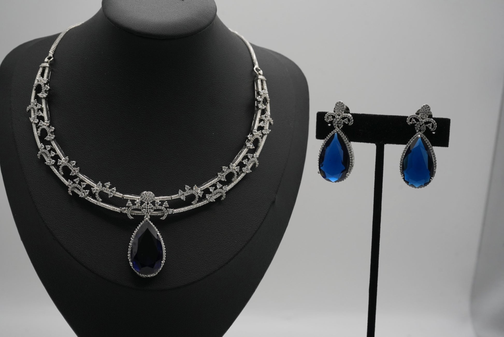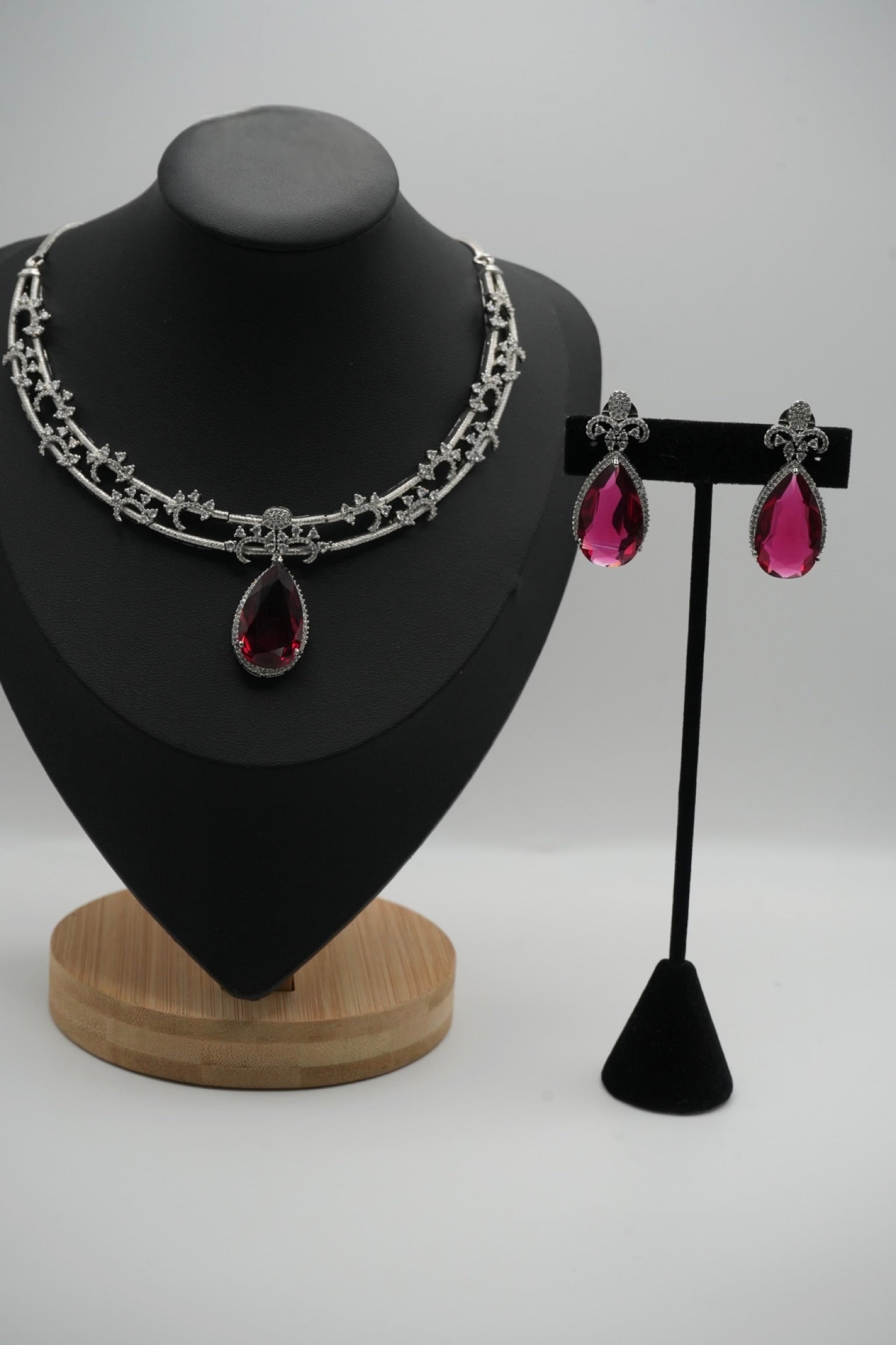 These elegant necklace and earring sets feature a silver-tone, intricately detailed chain with a central teardrop pendant and matching dangle earrings, available in four captivating colors: deep ruby red, soft blush pink, vibrant emerald green, and rich sapphire blue.