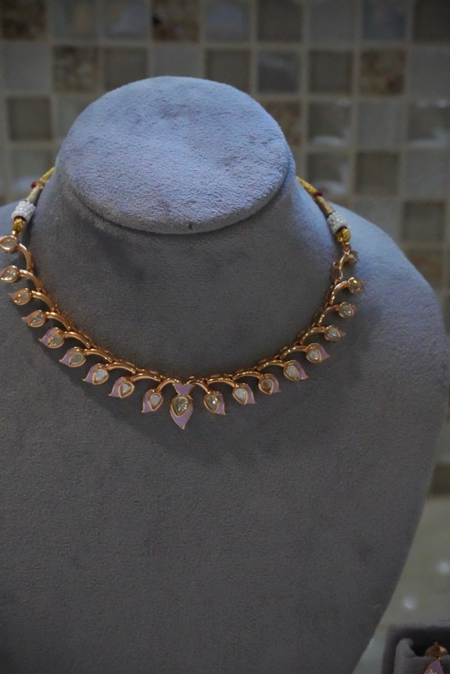 This charming jewelry set features a gold-tone necklace adorned with graceful, petal-shaped accents in a delicate pale pink or cream hue, each tipped with a small, shimmering detail. The design evokes a natural, organic feel, perfect for adding a subtle touch of elegance. Complementing the necklace are matching dangle earrings that echo the same intricate petal motif, creating a cohesive and refined look. The set is displayed on a grey jewelry bust, showcasing its delicate craftsmanship and ideal drape.