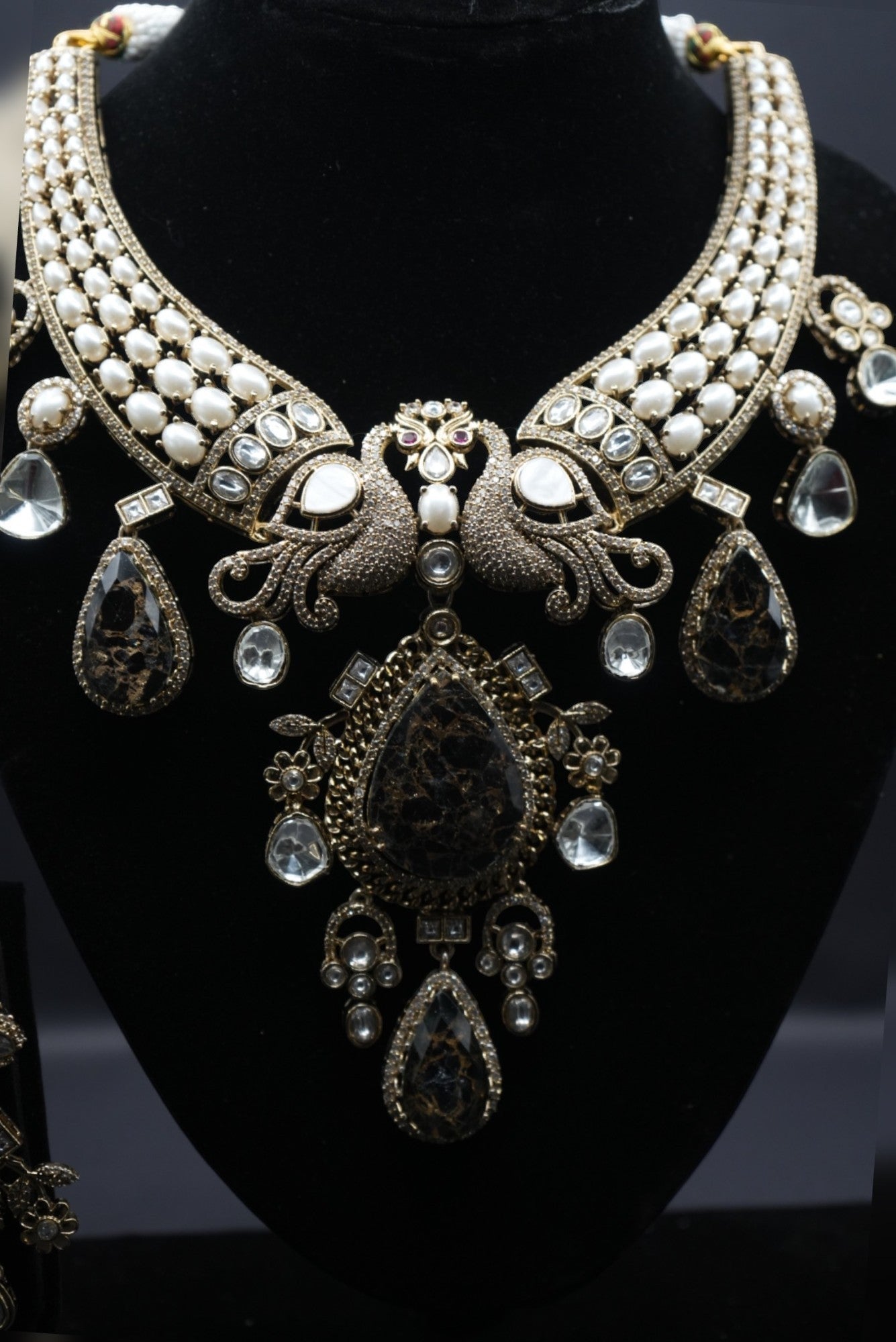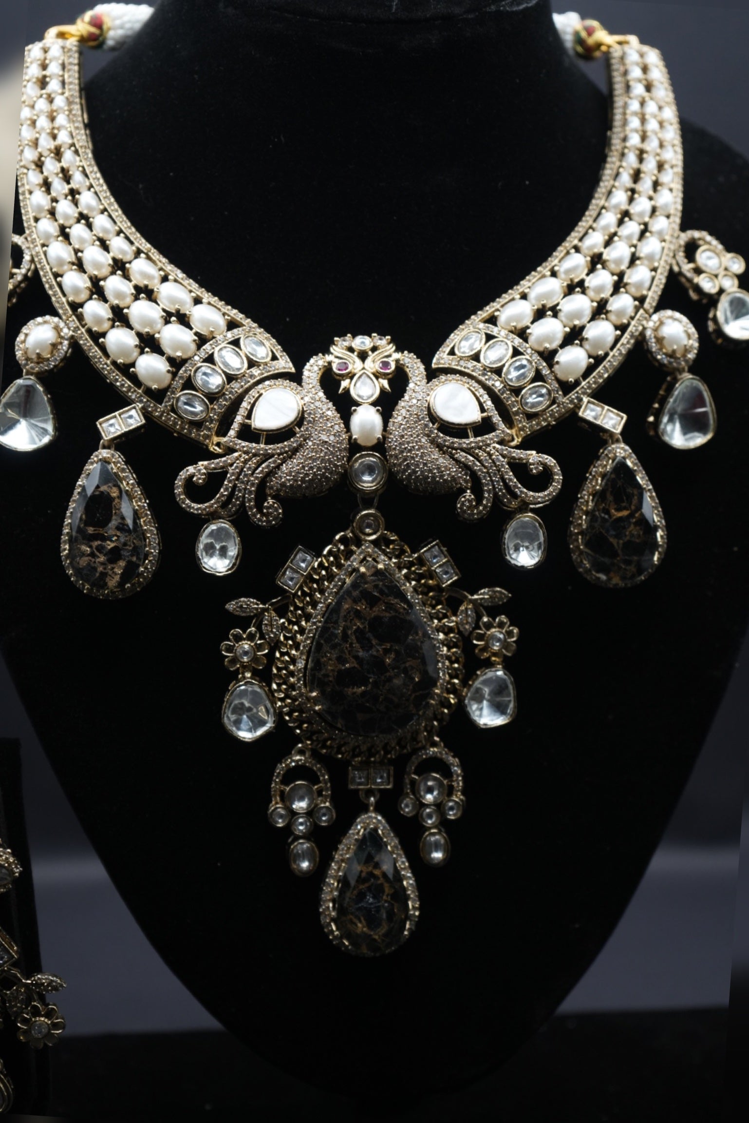 This exquisite two-tiered choker showcases an intricate arrangement of teardrop and square-cut stones, interlinked with a delicate rose gold framework. The geometric and floral-inspired pattern offers a blend of symmetry and elegance, creating a bold yet refined statement piece.