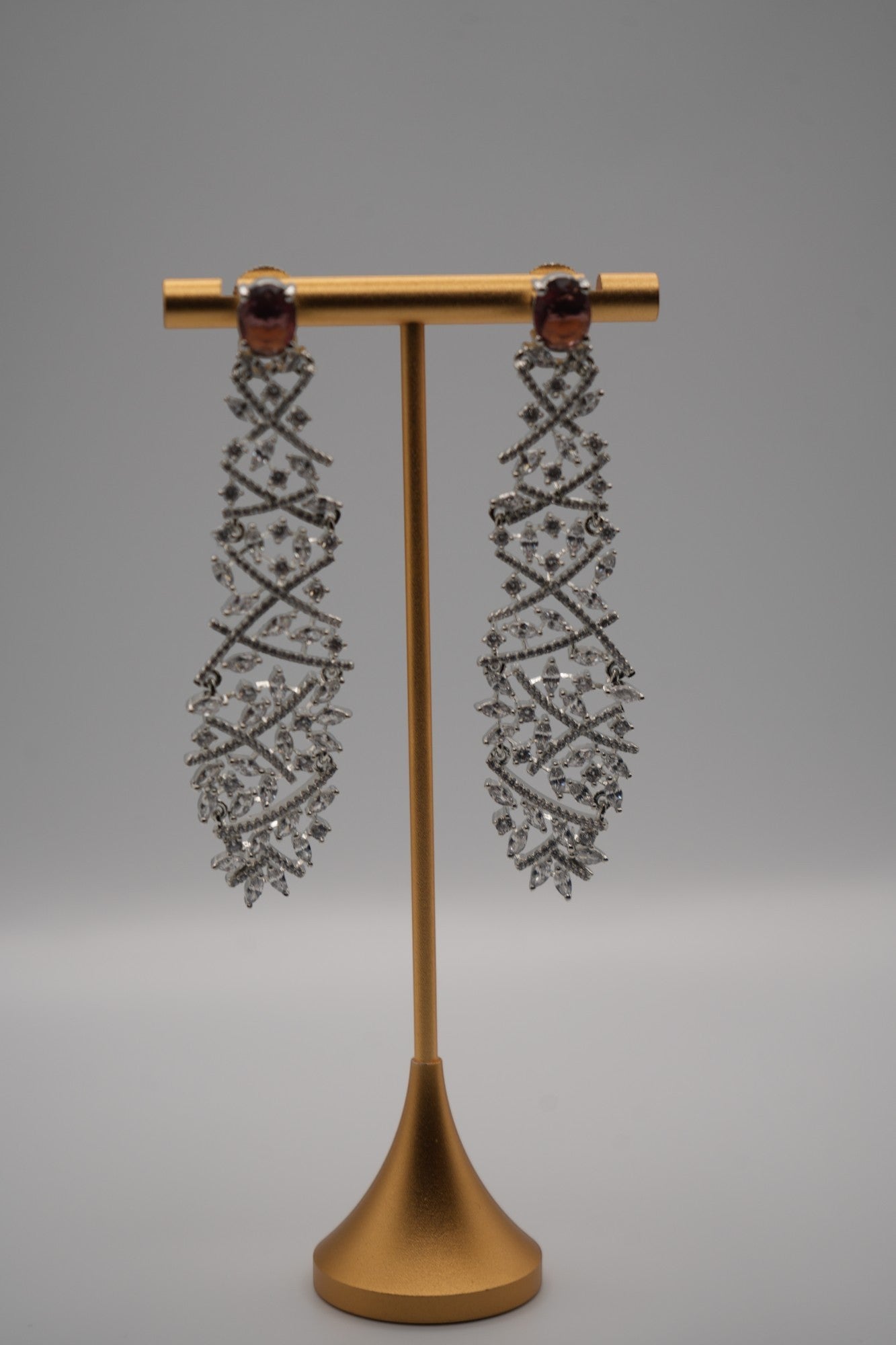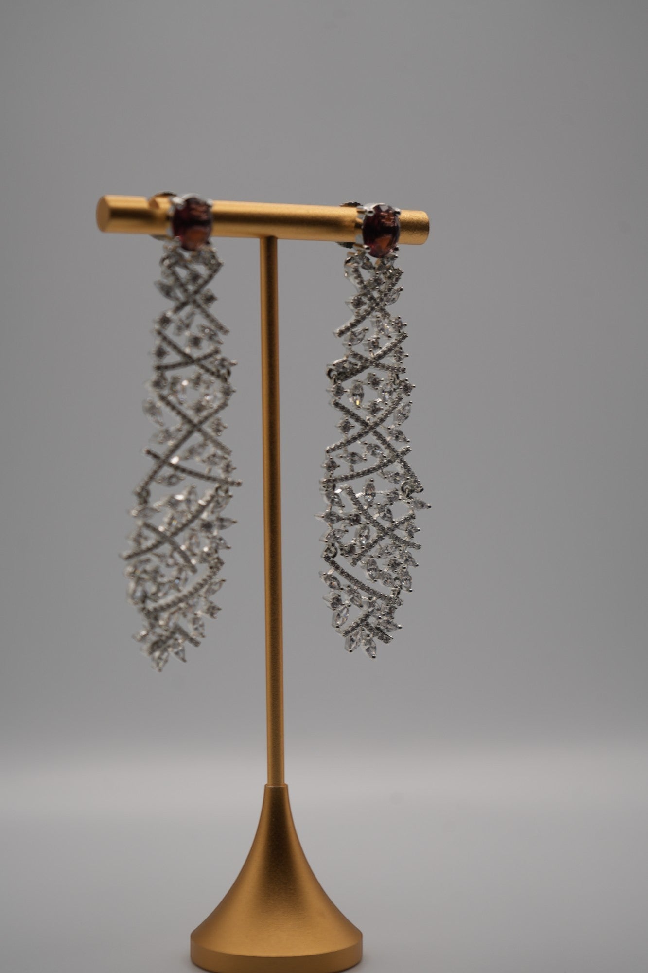 Steal the show with these dramatic ruby red and crystal cascade earrings. These earrings are a bold statement piece, featuring a rich ruby red stone at the stud and a stunning cascade of clear crystals in an intricate, textured design. Perfect for adding a touch of high-octane glamour to evening events, galas, or any occasion where you want to turn heads.