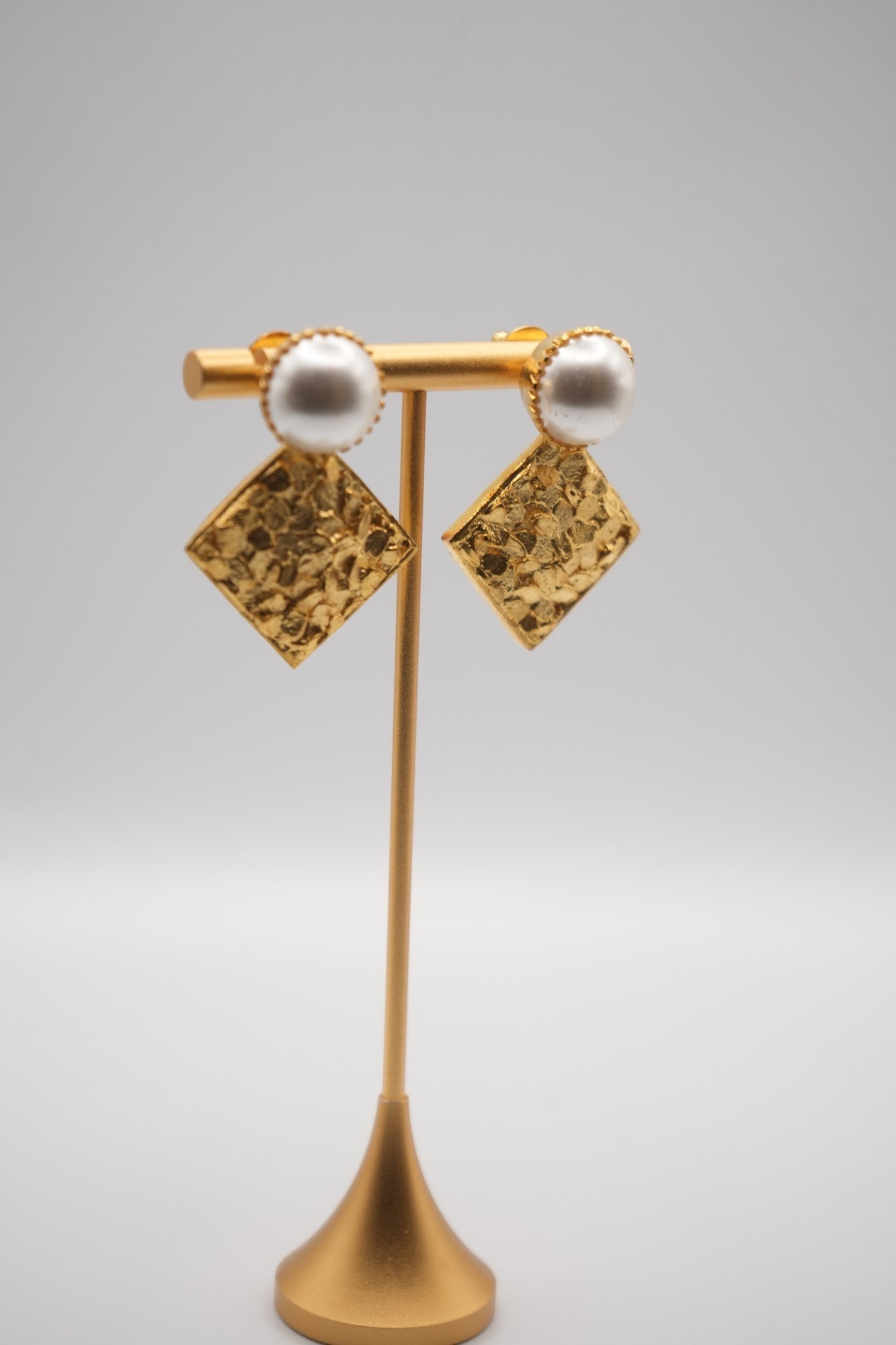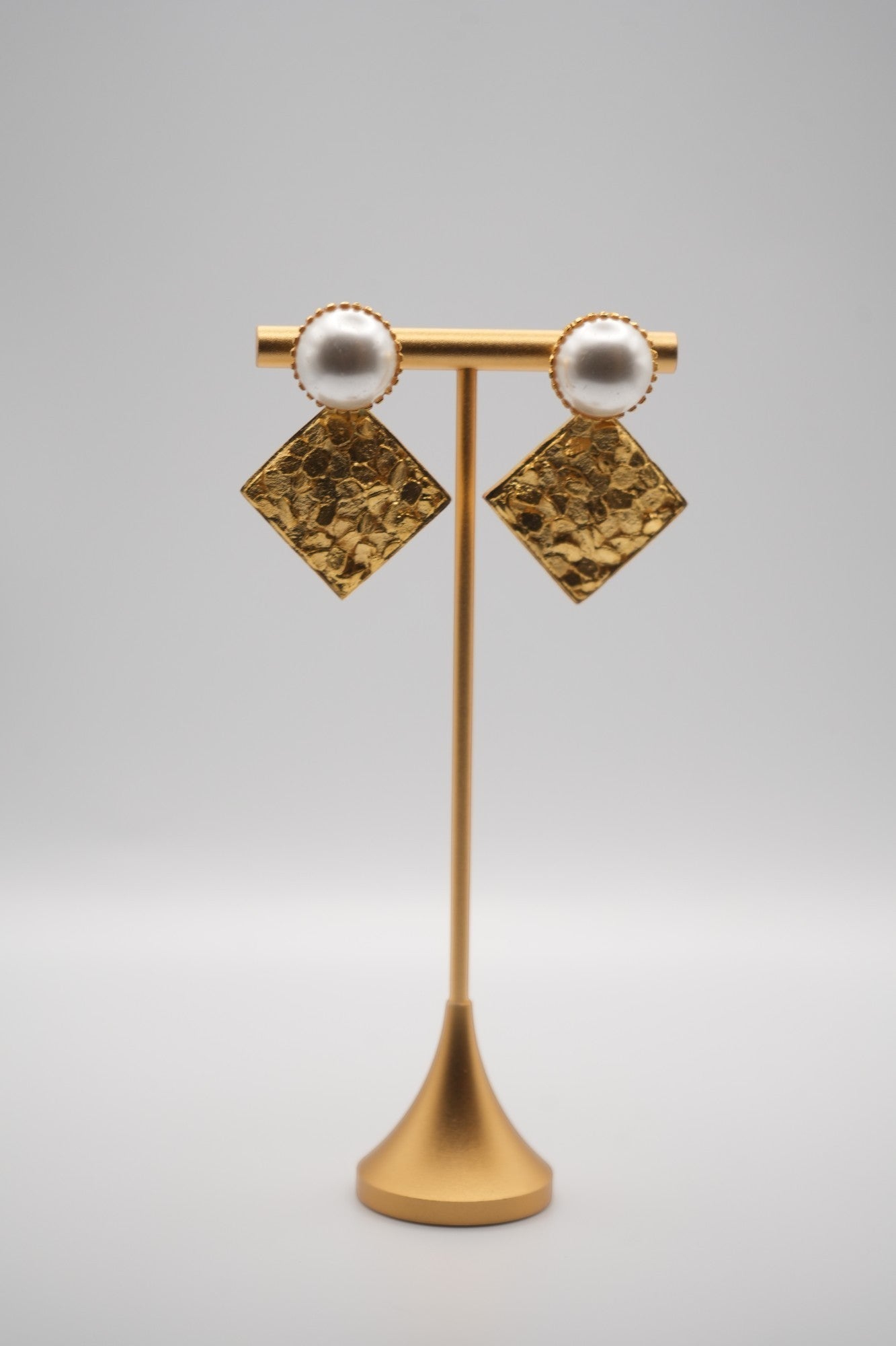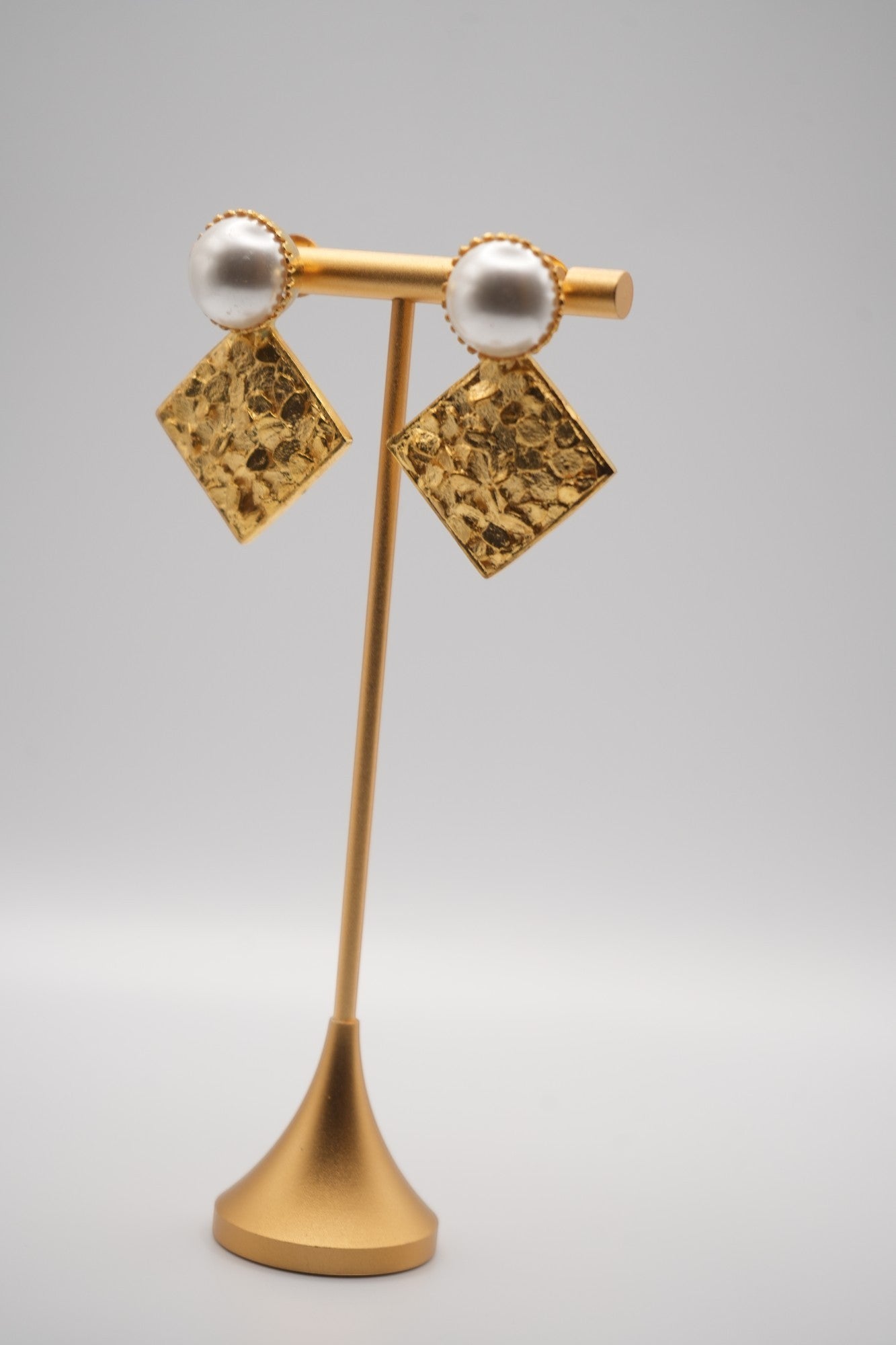 Indulge in the timeless elegance of our handcrafted earrings, meticulously designed for those who appreciate the blend of classic and contemporary styles. Each earring features a lustrous, round pearl set within a delicately beaded gold-tone bezel, leading to an exquisitely detailed square drop. The drop showcases a raised floral relief pattern, reminiscent of opulent carvings from a bygone era, enhancing the luxurious feel.