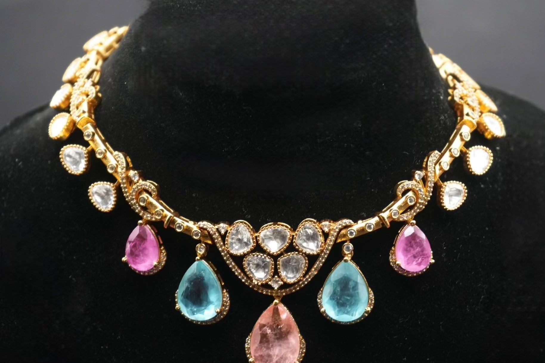 Elevate your style with this exquisite Multi color necklace and earring set, featuring a sophisticated design adorned with shimmering Multi color stones and elegant emerald drops. Perfect for formal occasions, this jewelry set combines timeless elegance with a modern twist.