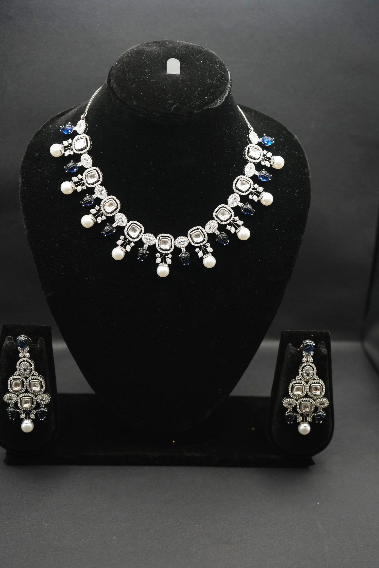 This elegant jewelry set features a necklace, matching earrings, pearl drops, and sparkling cubic zirconia (CZ) stones with Purple Stones. This set offers a blend of classic and modern elegance, perfect for formal events or special occasions.
