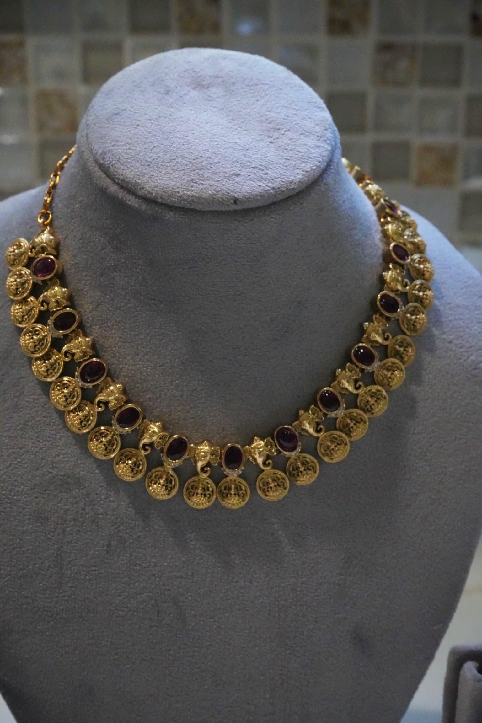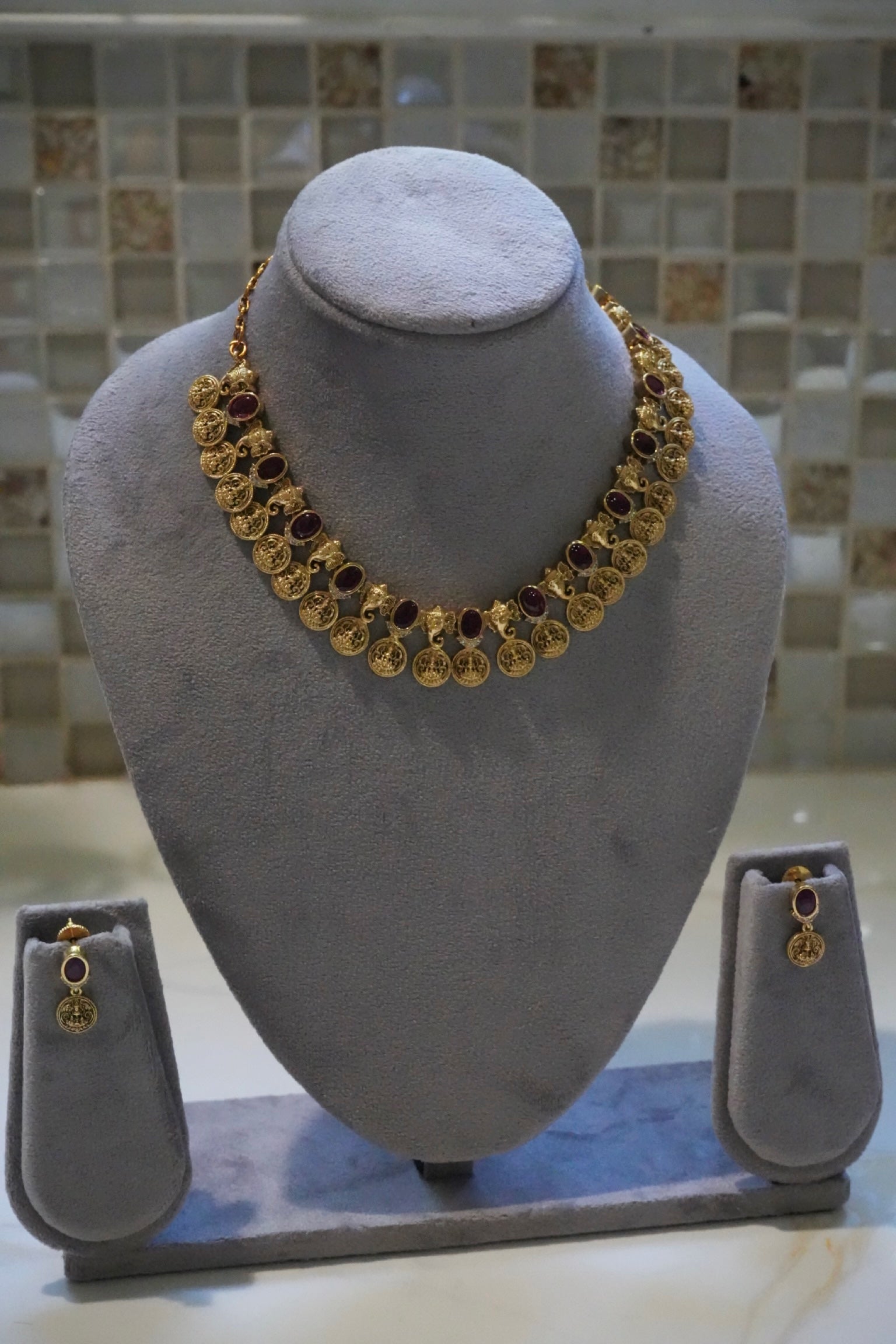 This exquisite jewelry set features a stunning gold-tone necklace adorned with richly colored ruby-like stones, each framed by intricate detailing. Completing the ensemble are matching drop earrings, making this a perfect accessory for special occasions or adding a touch of traditional elegance to any outfit. The necklace is displayed on a grey bust, highlighting its graceful curve and design.