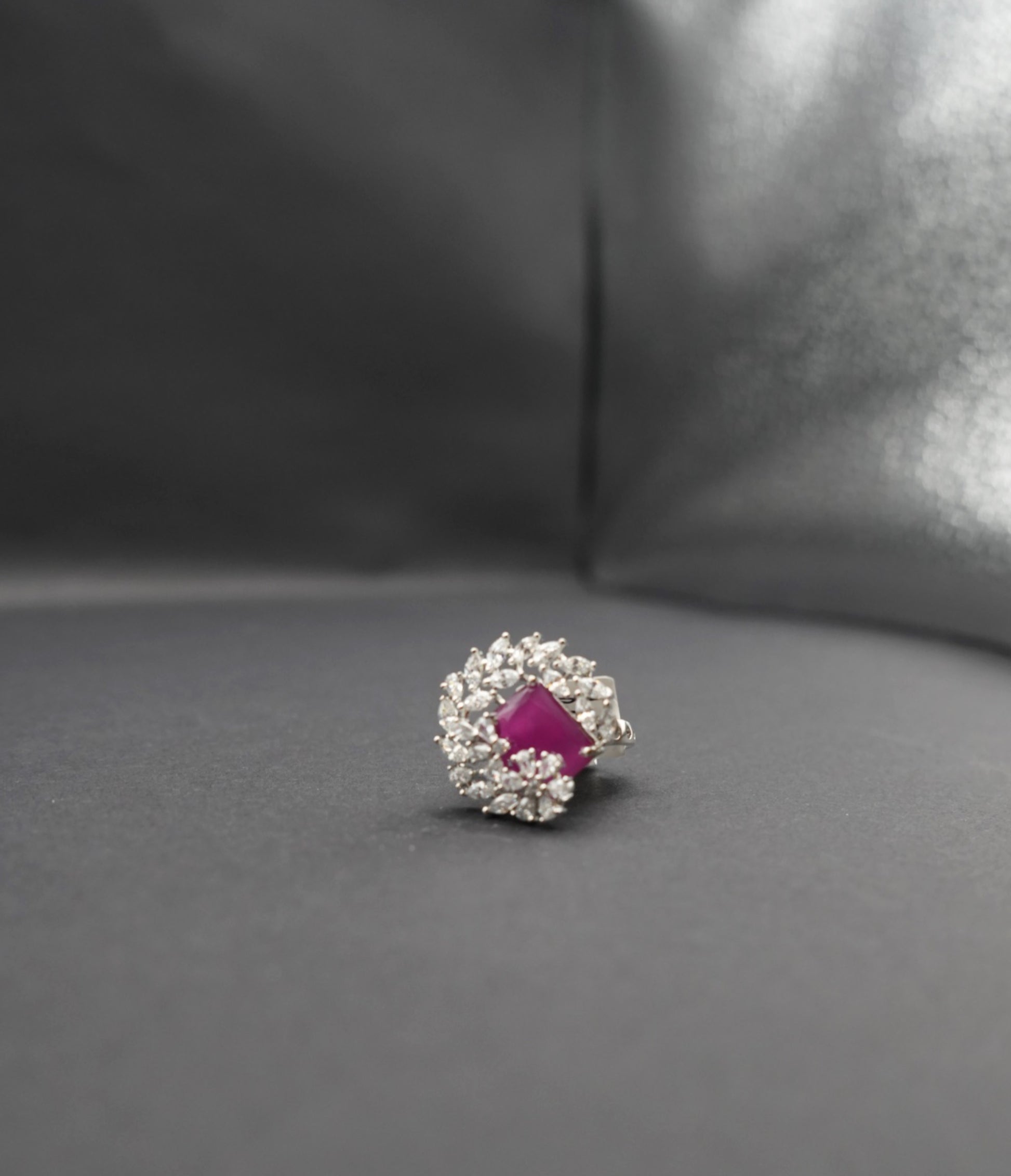 Add a touch of classic glamour to your hand with this elegant ruby red and crystal cocktail ring. This ring features a striking ruby red stone at its center, surrounded by a halo of sparkling clear crystals, creating a sophisticated and eye-catching accessory. Perfect for adding a pop of color and sparkle to both special occasions and everyday wear.