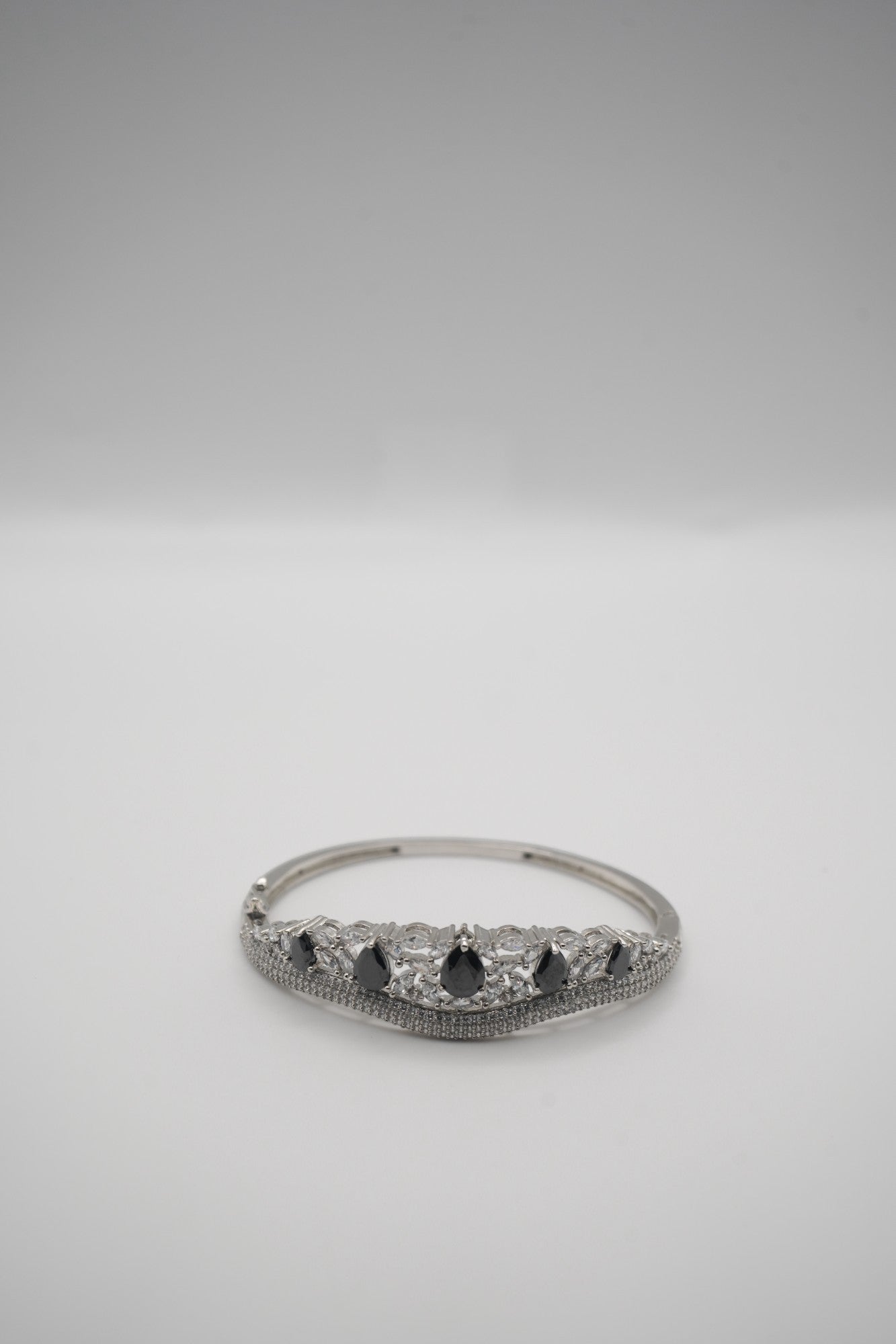 - Clear Crystal Accents: Surrounding each black teardrop stone is a cluster of clear cubic zirconia crystals, arranged in a floral-like pattern. These crystals enhance the bangle's overall sparkle and provide a beautiful balance between the dark and light elements.