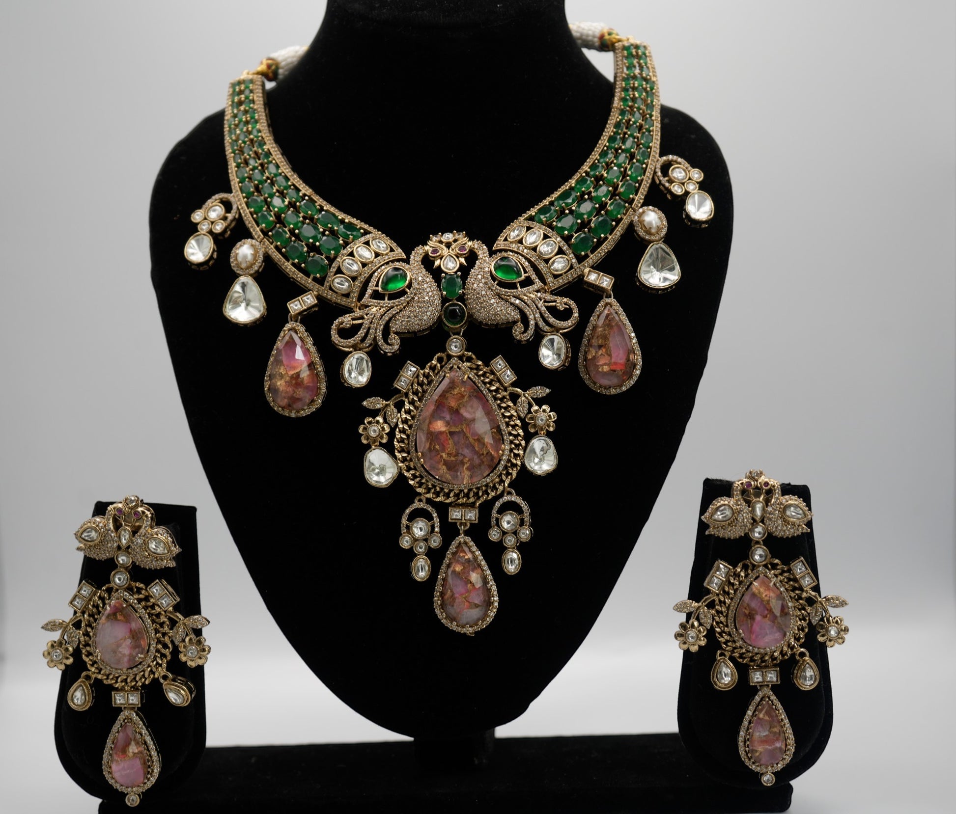 Elevate your elegance with this regal peacock-inspired antique necklace and earring set, meticulously crafted with intricate details, vibrant stones, and traditional motifs. Designed for grand occasions, this set combines vintage artistry with contemporary appeal.