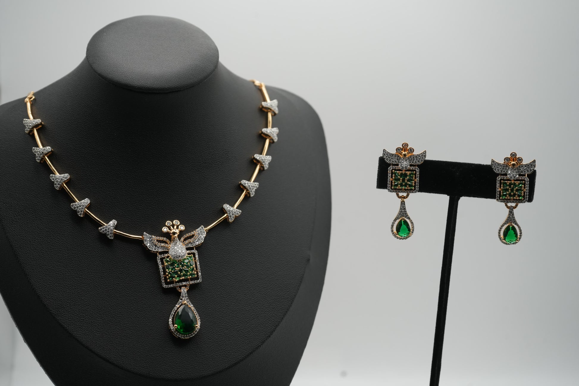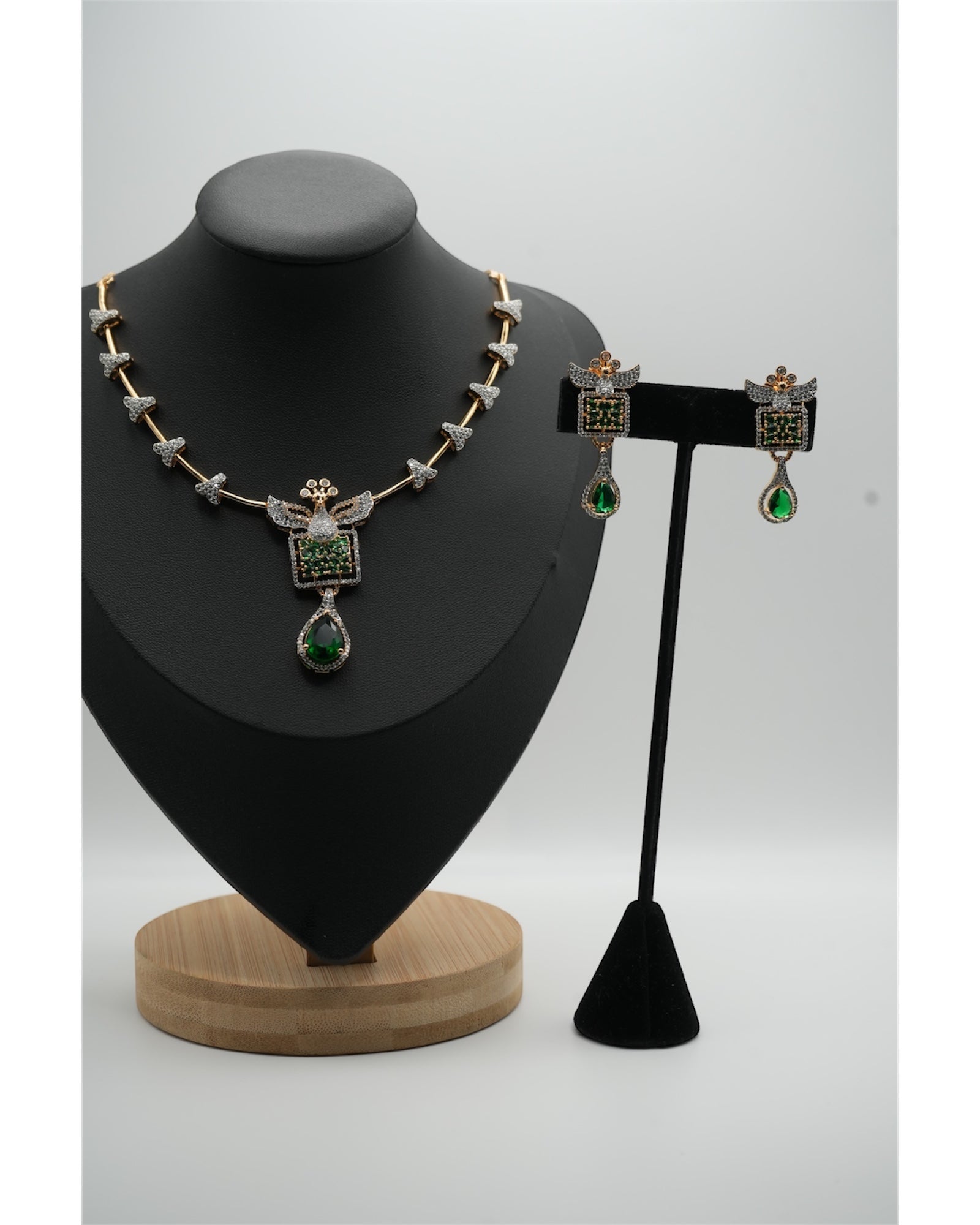 This stunning set features a golden chain adorned with delicate bow accents, leading to a majestic green emerald and clear stone pendant. Matching dangle earrings echo the intricate design, featuring prominent green emeralds. Exuding regal charm, this set is perfect for adding a touch of vibrant elegance to any ensemble.