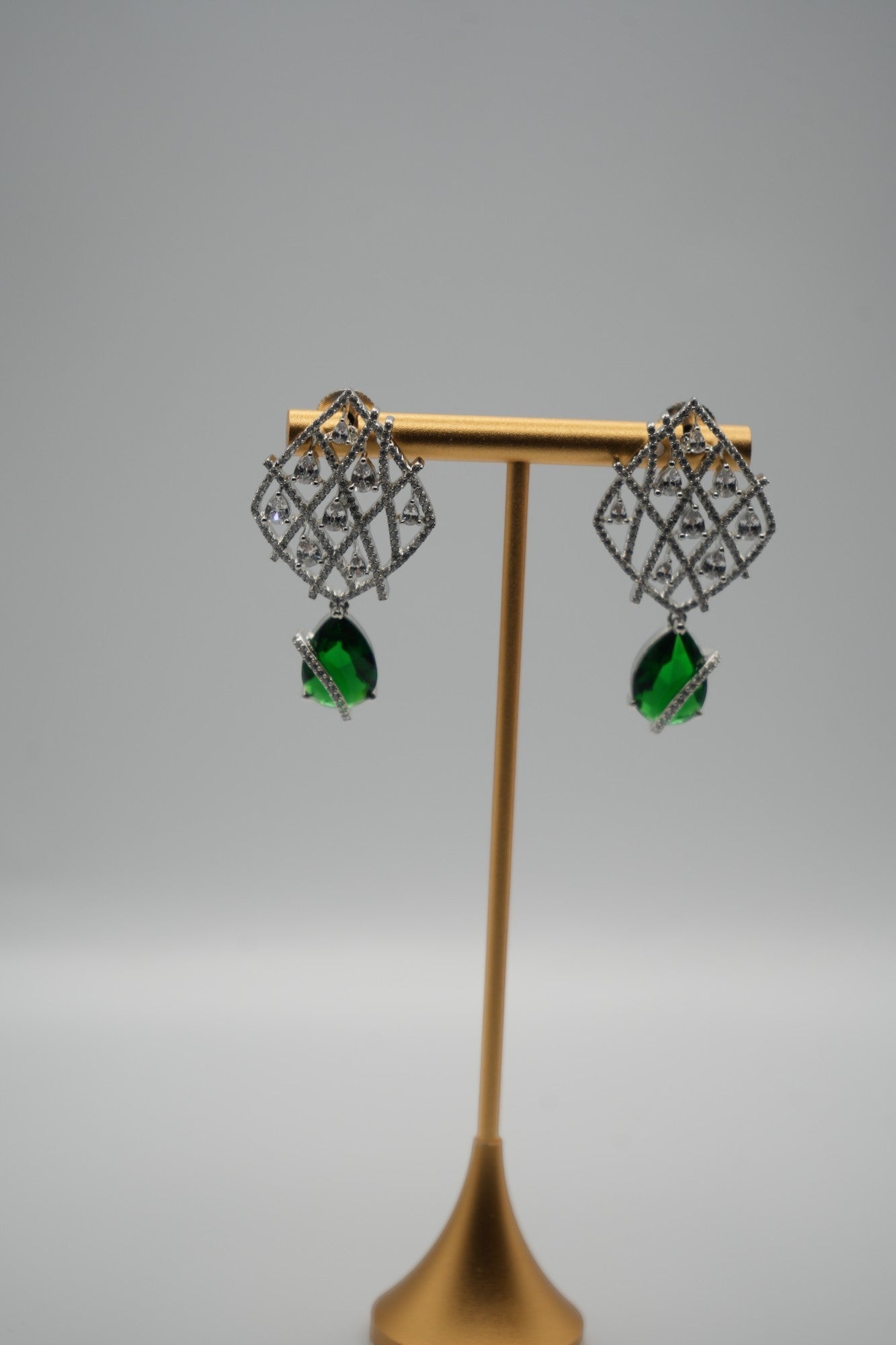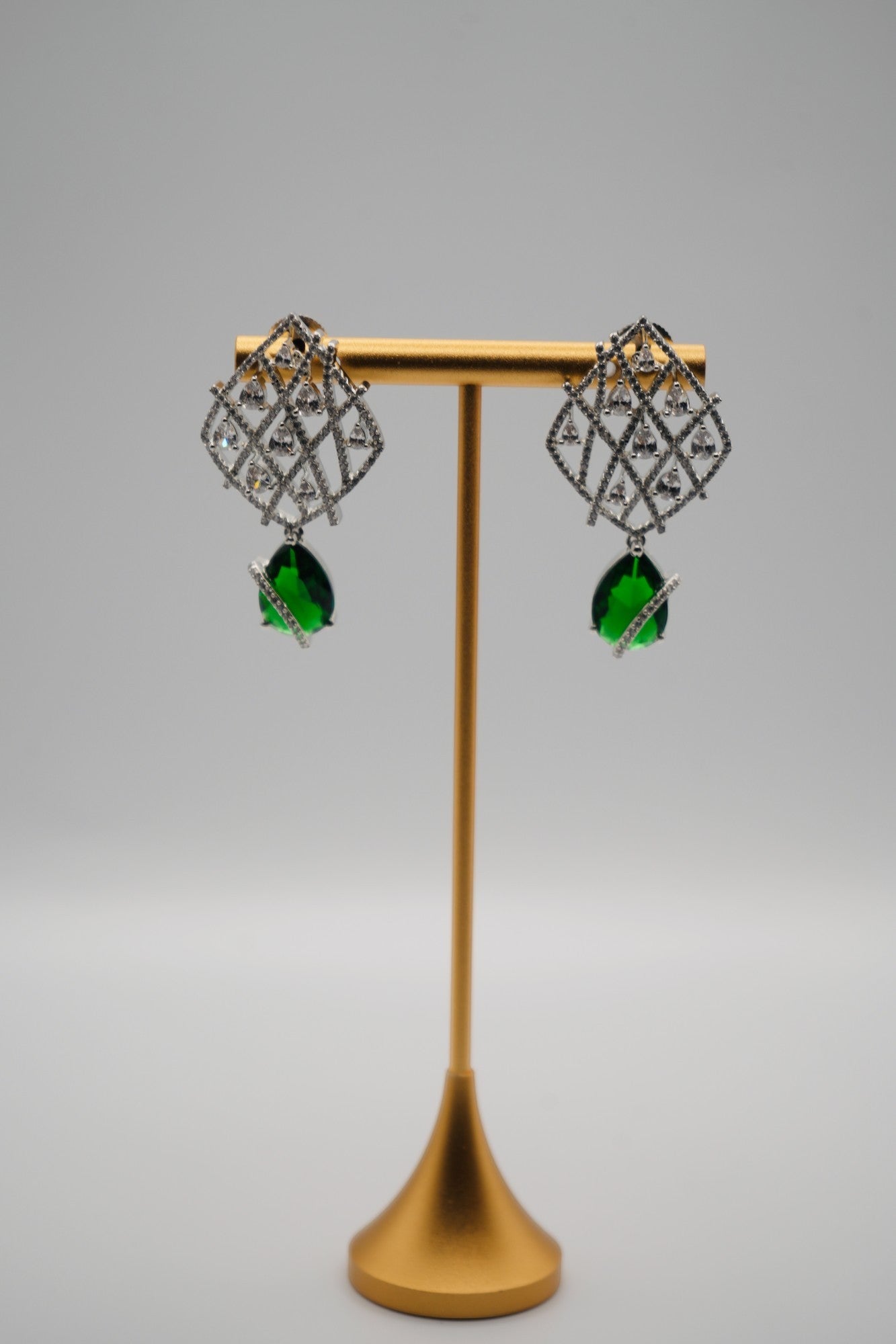 Add a touch of sophisticated sparkle and vibrant color with the "Emerald Lattice" Drop Earrings. These elegant earrings feature an intricate, diamond-shaped lattice design paved with shimmering crystals, suspending a captivating, emerald-green gemstone. The delicate framework and the rich hue of the gemstone create a striking contrast, making these earrings a perfect accessory for adding a touch of refined glamour to any ensemble.