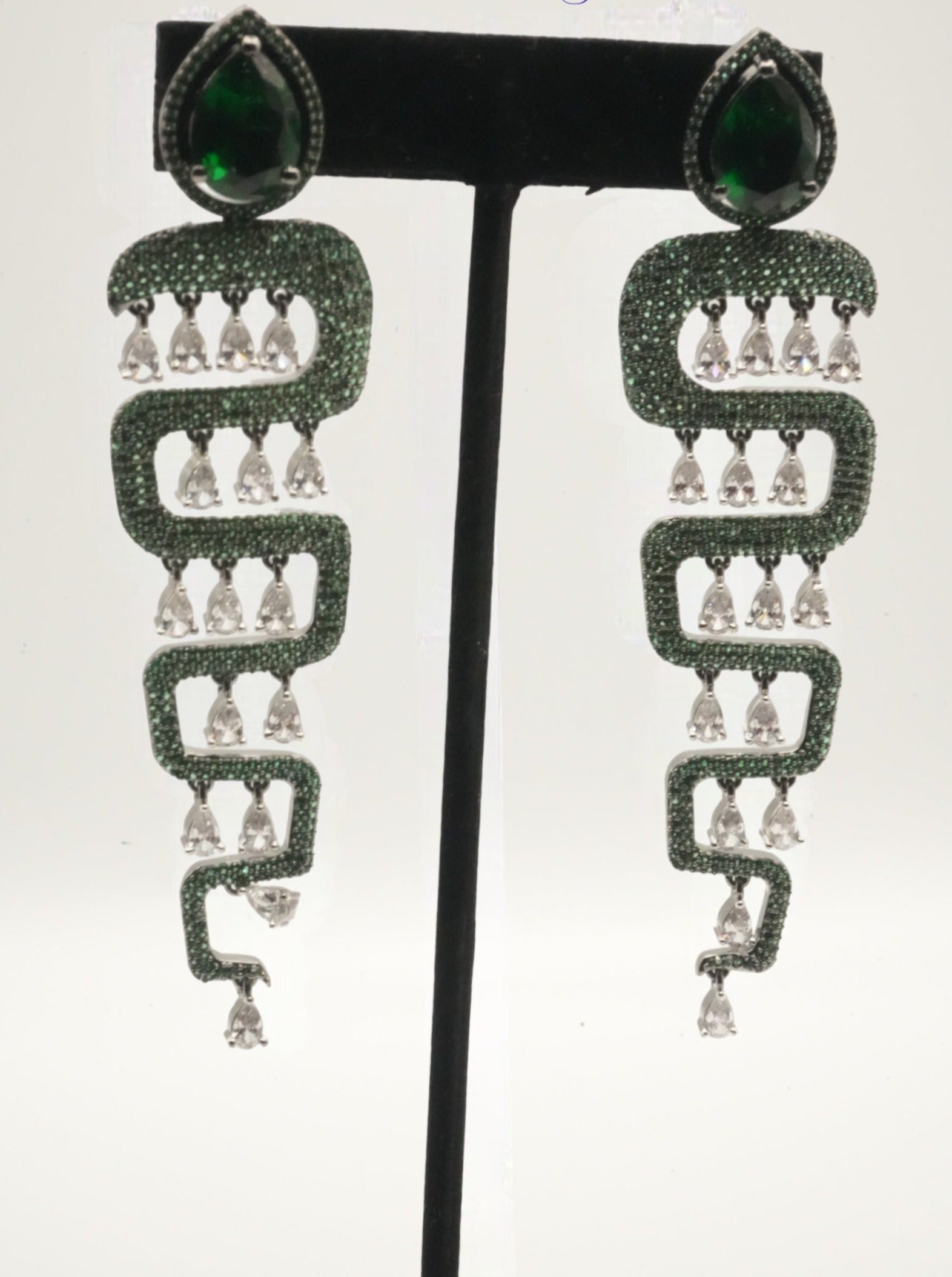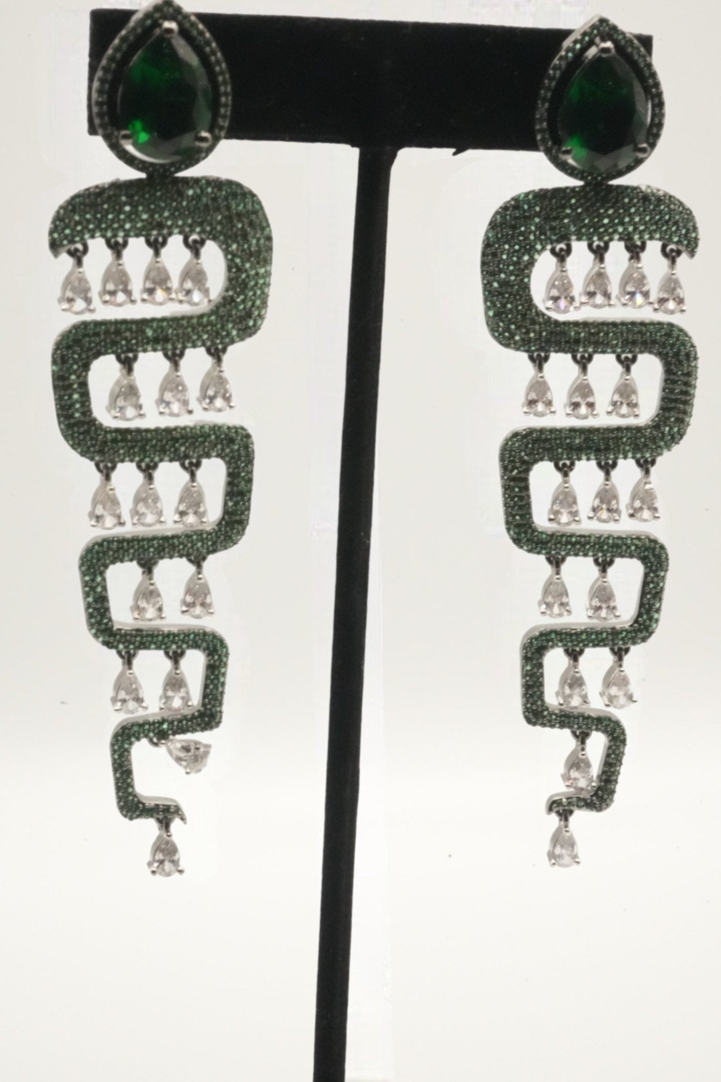 These Lustrous Jewels earrings showcase a serpentine design with shimmering green stones and a prominent teardrop-shaped green gemstone at the top. They feature dangling rows of sparkling white teardrop crystals, blending modern design with classic elegance.