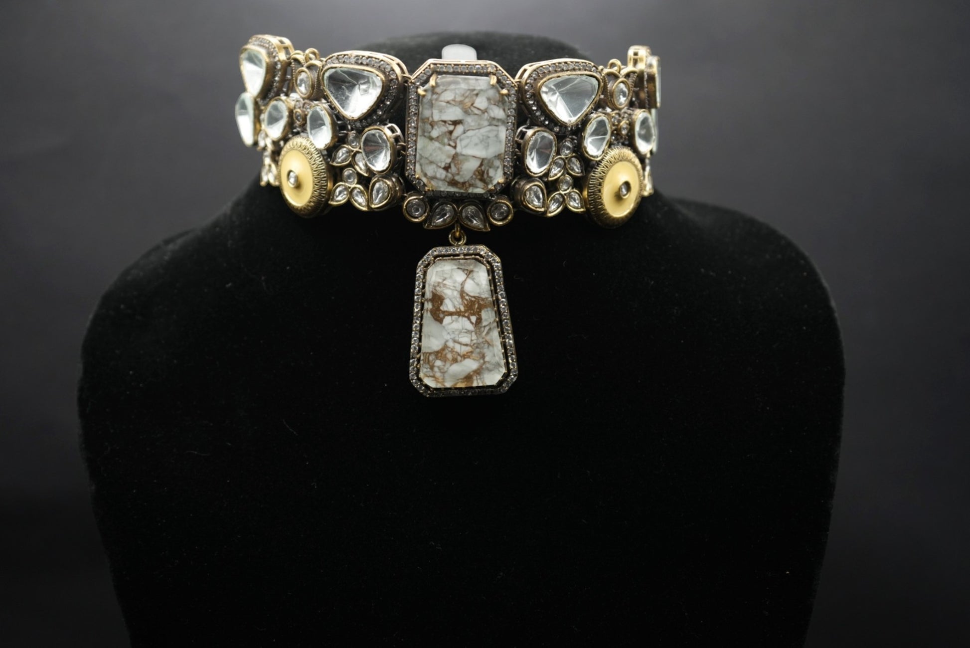 Introducing the "Artisan Heritage" choker and earring set, a stunning ensemble that captures the timeless beauty of traditional Indian jewelry with a touch of contemporary flair. This set features intricate Kundan-inspired craftsmanship, showcasing unique stones and a blend of antique gold tones, making it a perfect statement piece for special occasions.