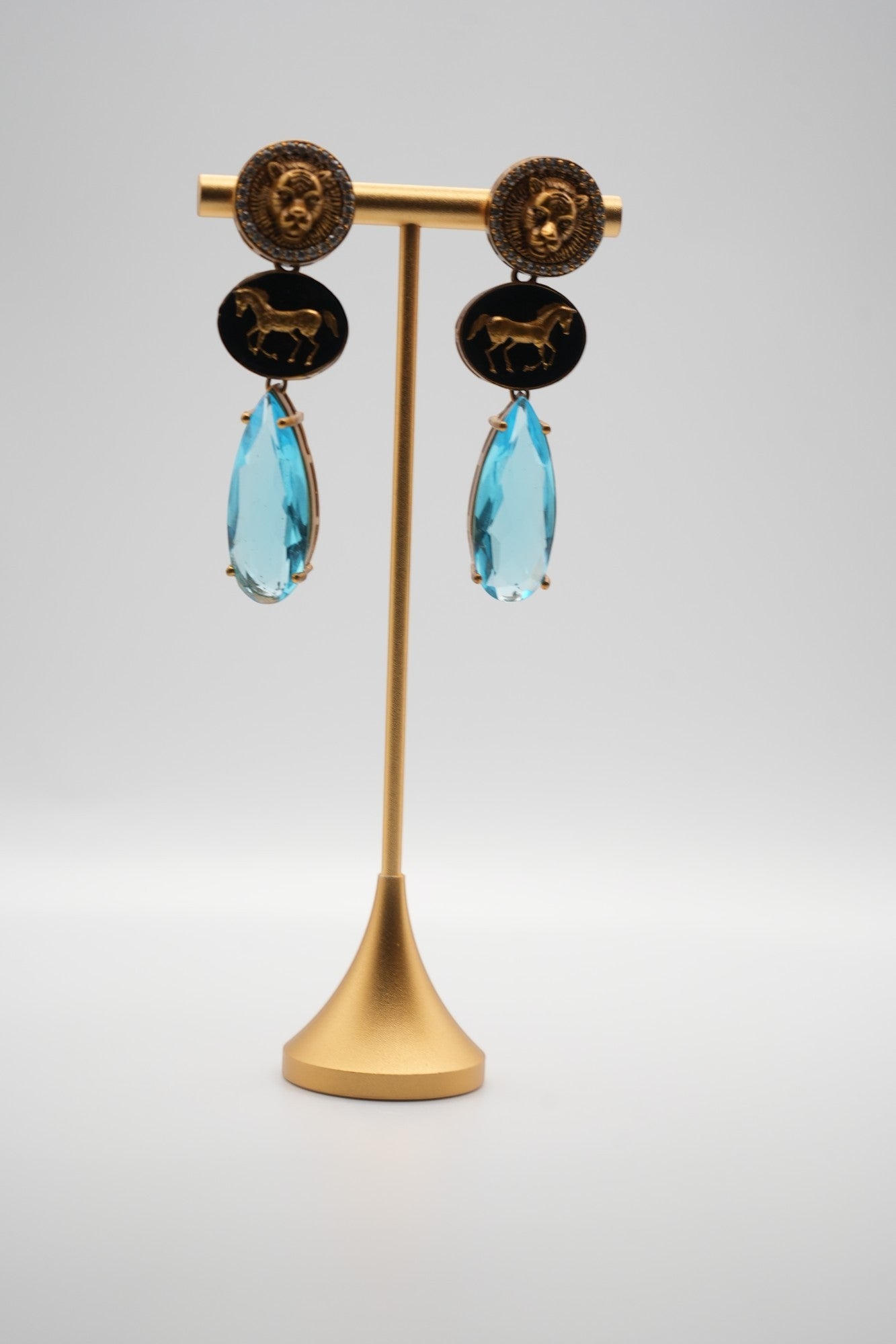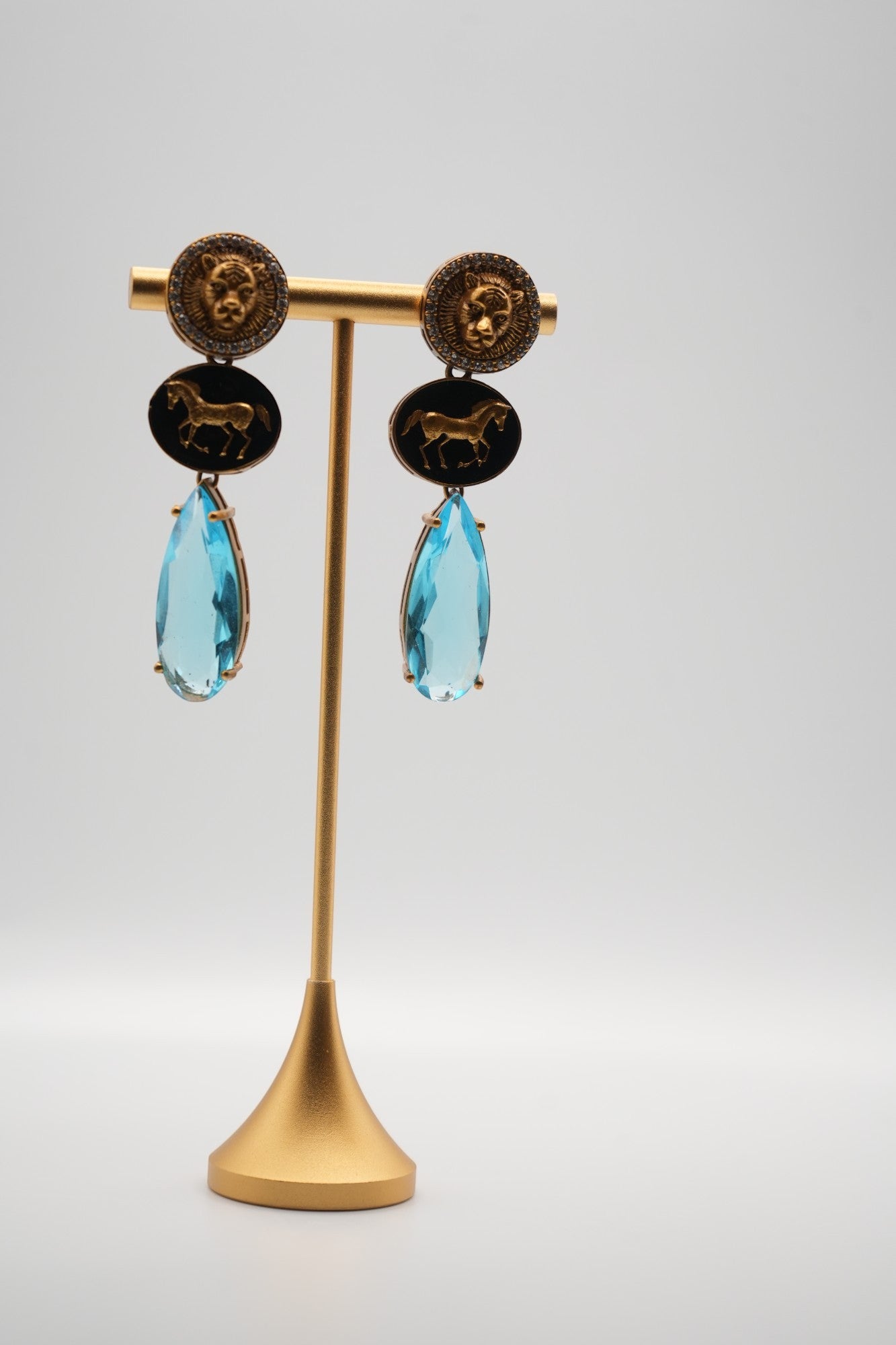 Equestrian Majesty: Lion, Horse, and Aqua Gem Drop Earrings