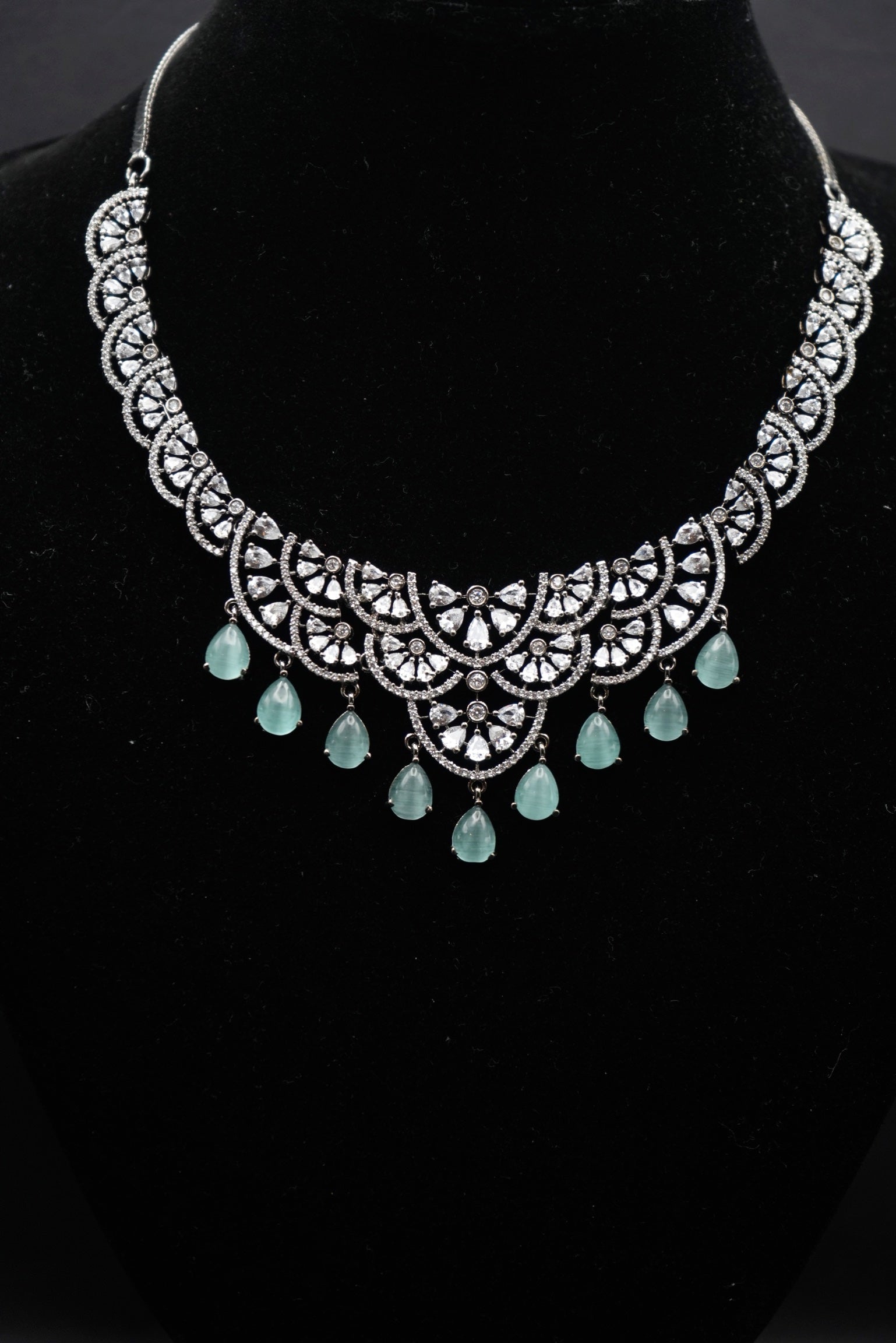 A crescent-inspired pattern with interlocking half-moon shapes adorned with crystal accents. The necklace is embellished with sparkling round and teardrop-shaped crystals arranged symmetrically for a refined look. Dangling aqua droplet charms add a pop of color and fluidity to the design.