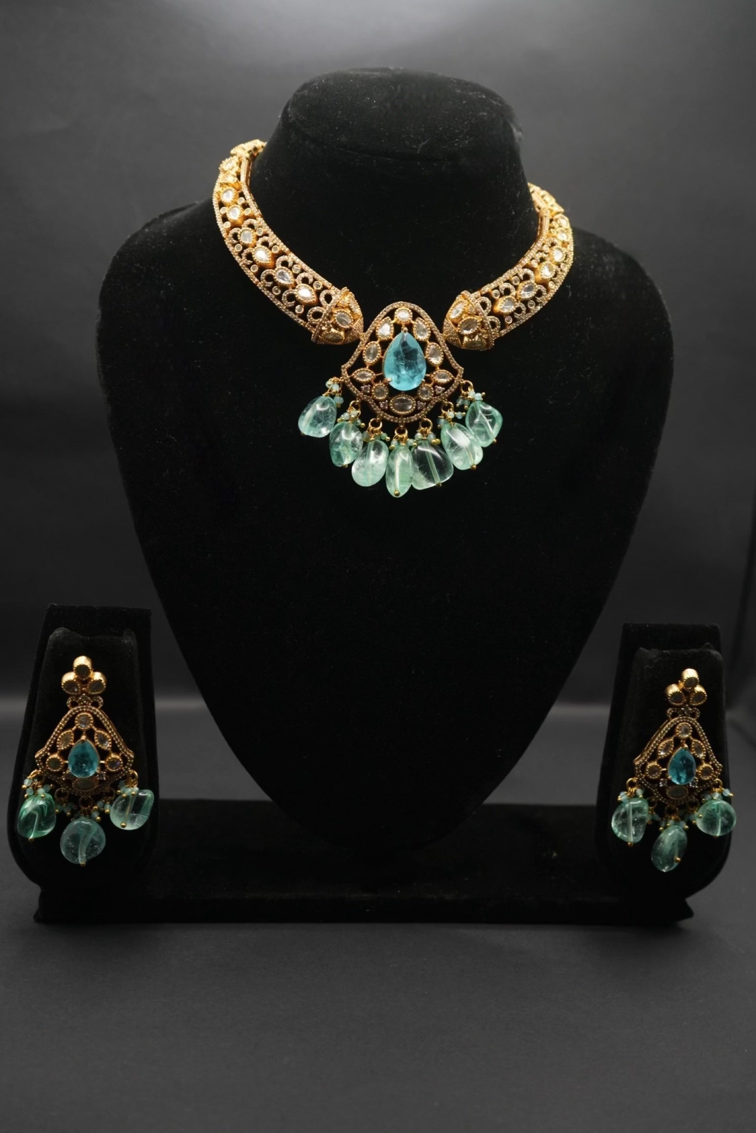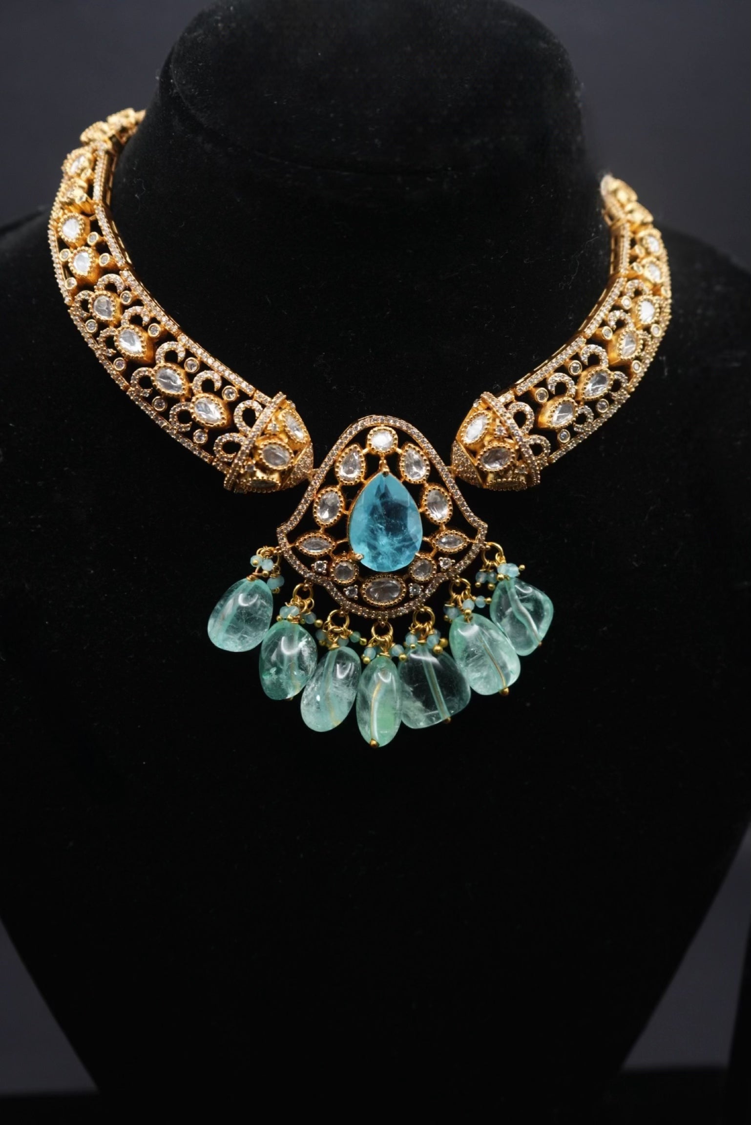 Make a bold statement with this luxurious gold-plated necklace and matching earring set. Designed with intricate craftsmanship and adorned with stunning aqua-toned embellishments, this set is perfect for weddings, festive occasions, or elegant evening events.Premium-quality gold-plated alloy with a textured antique finish.