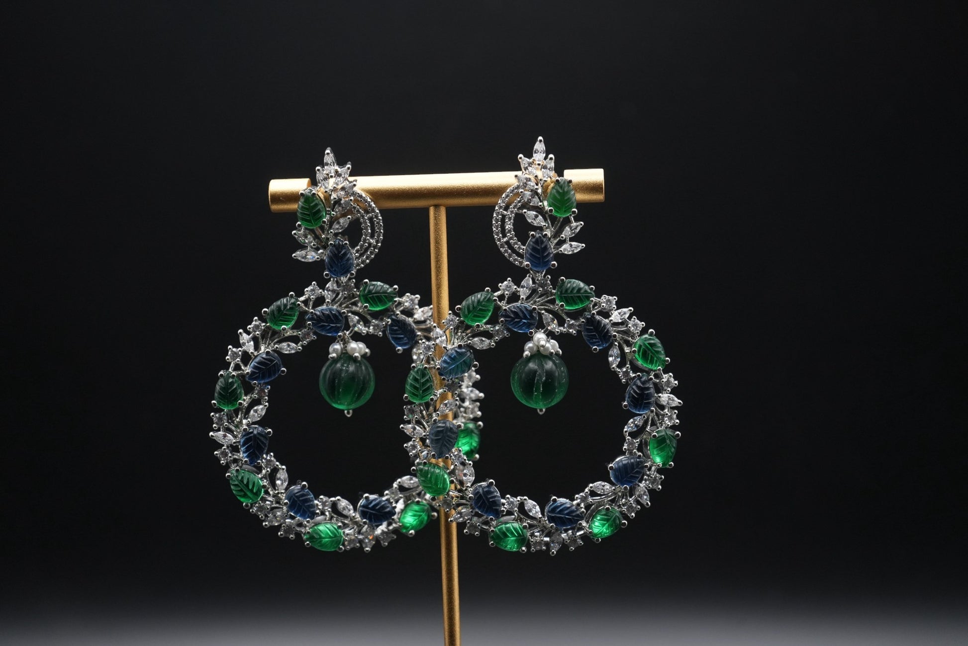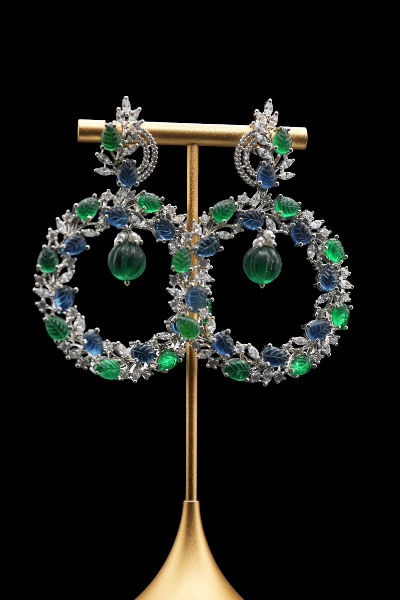 Step into a lush forest with these exquisite "Forest Canopy" Hoop Earrings. These magnificent earrings feature a large, circular hoop design intricately adorned with sparkling clear crystals and a vibrant array of green and blue leaf-shaped gemstones. Perfect for adding a touch of nature-inspired elegance and dazzling sparkle to any special occasion.