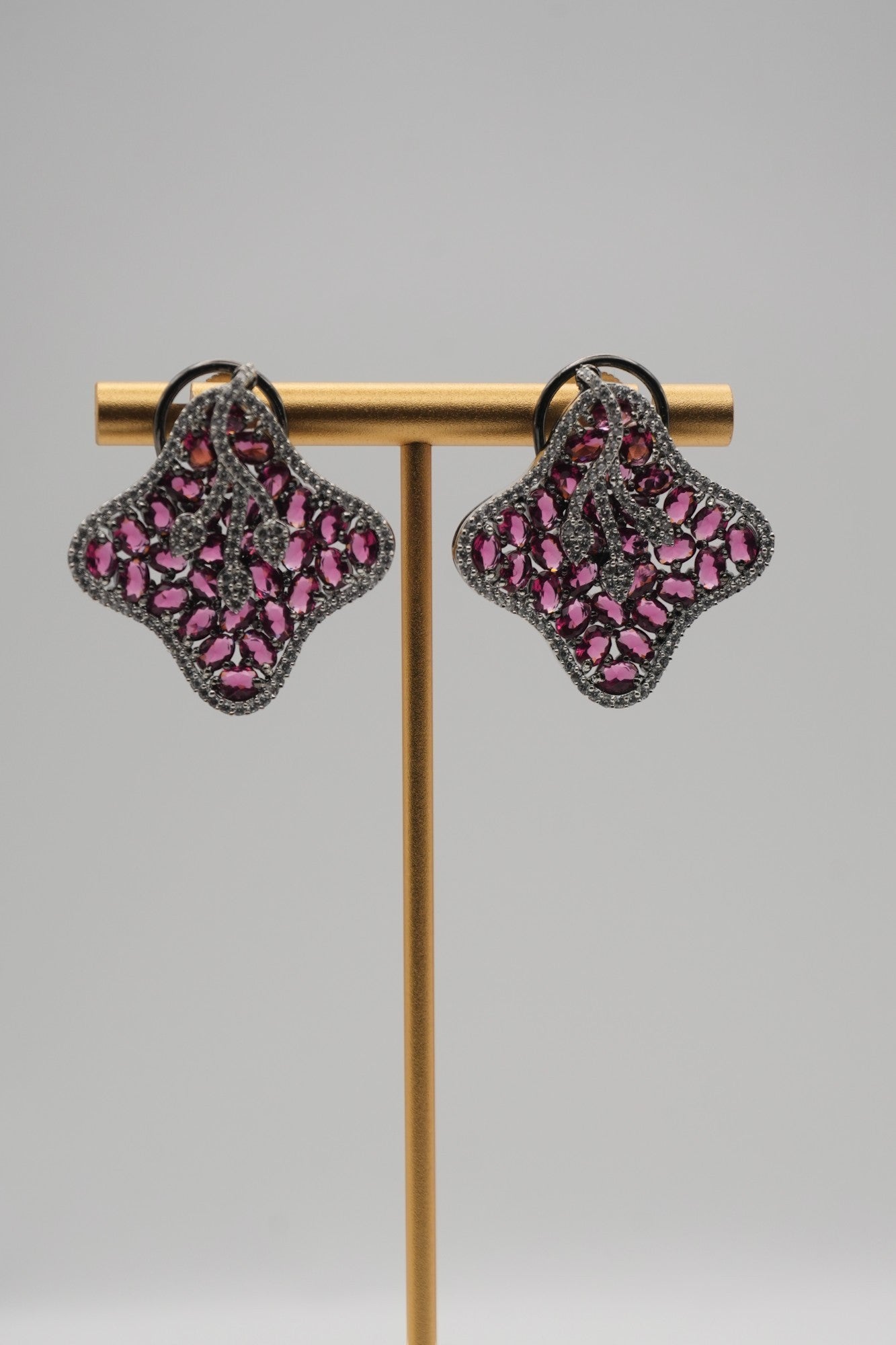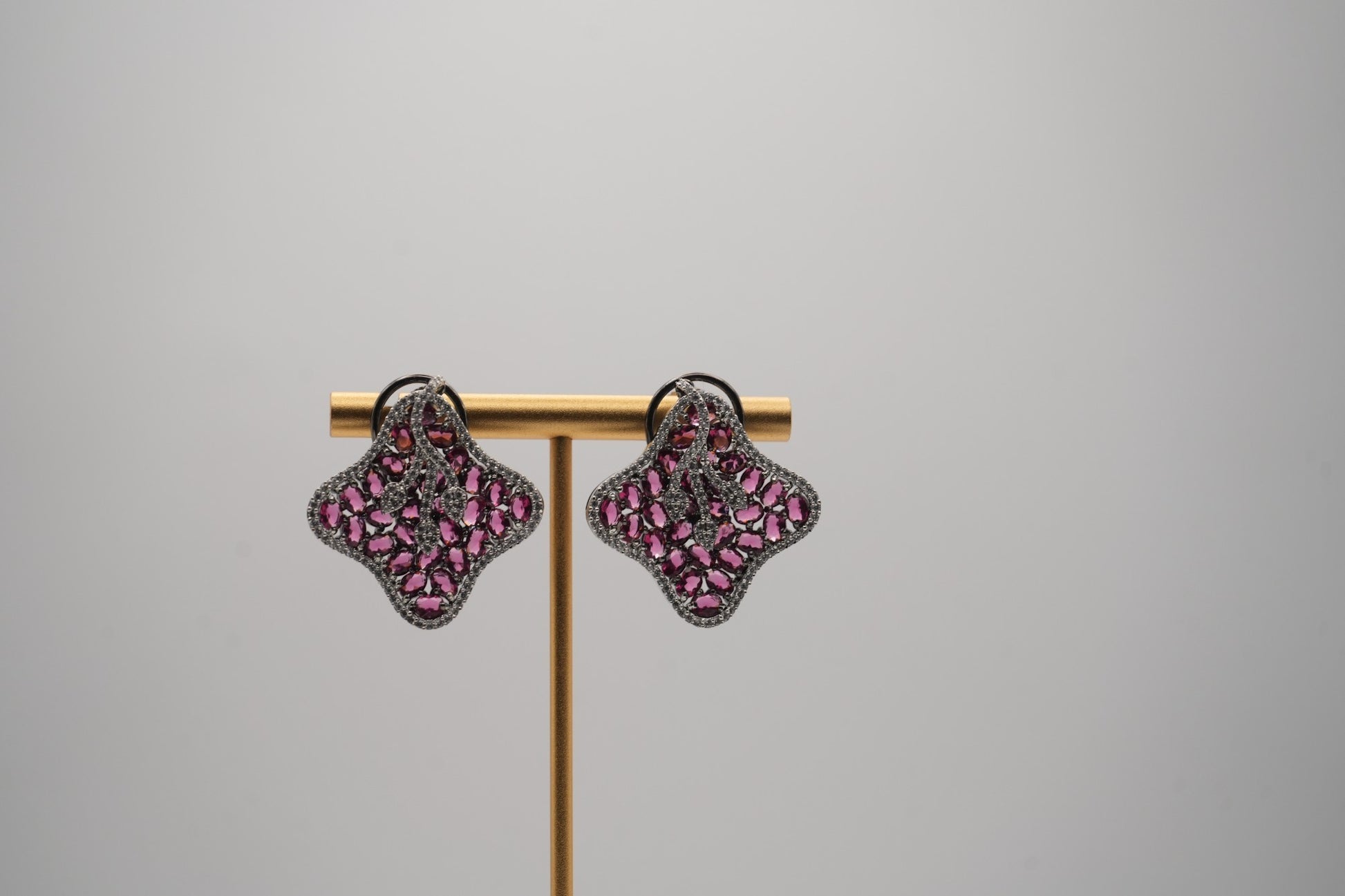 Make a vibrant statement with the "Fuchsia Bloom" Quatrefoil Stud Earrings. These striking earrings feature a unique quatrefoil (four-lobed) shape, densely paved with numerous small, faceted fuchsia-pink gemstones. The dark-toned metal setting provides a dramatic contrast, making the vivid color of the stones truly pop. Perfect for adding a bold and contemporary touch to any ensemble.