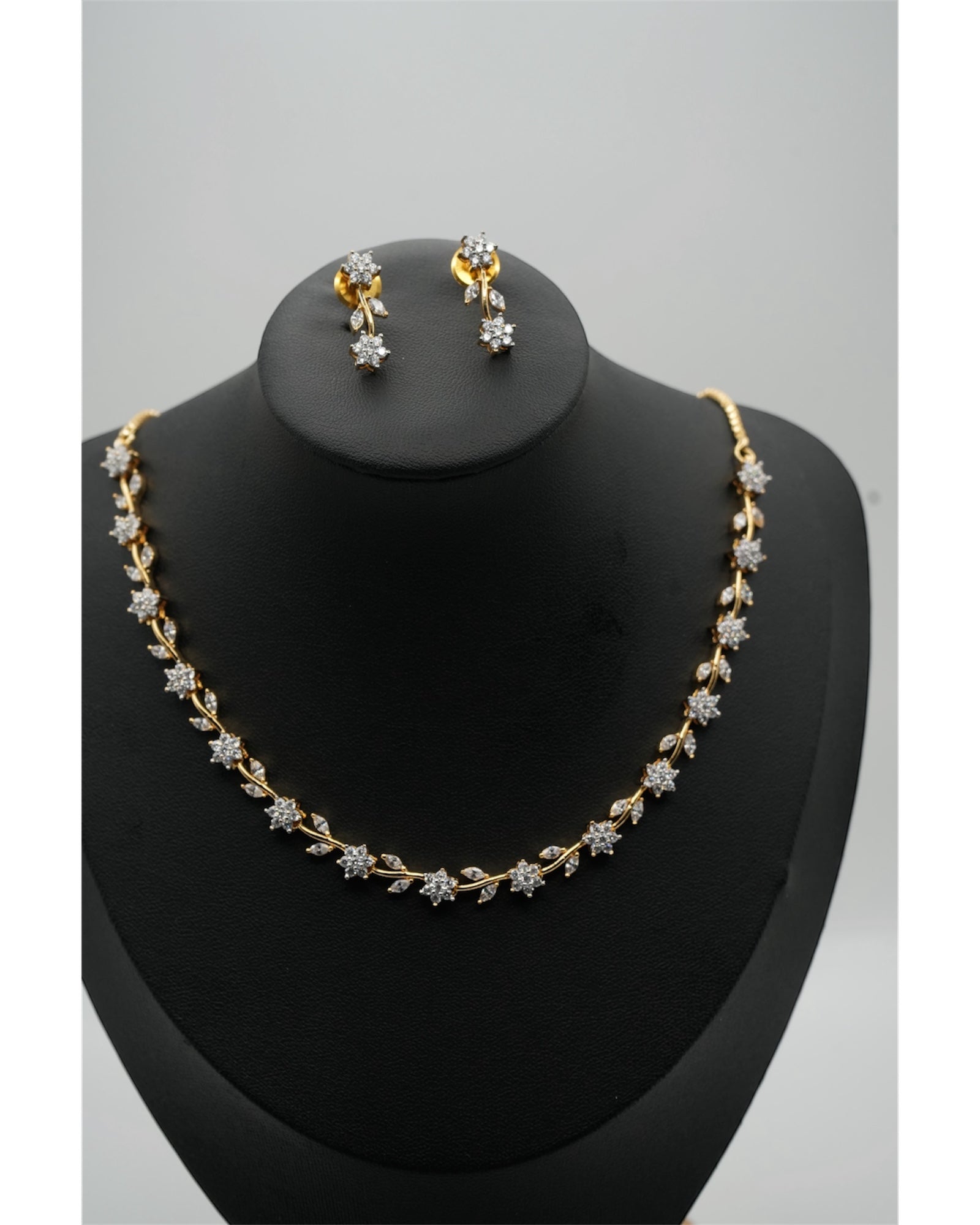 This exquisite necklace and earring set features a delicate golden vine design, intricately adorned with sparkling zircon stones. The floral-inspired clusters of stones beautifully complement the graceful flow of the necklace, creating a timeless and elegant appeal. Perfect for adding a touch of sophistication to any ensemble, this set is a radiant expression of classic beauty.