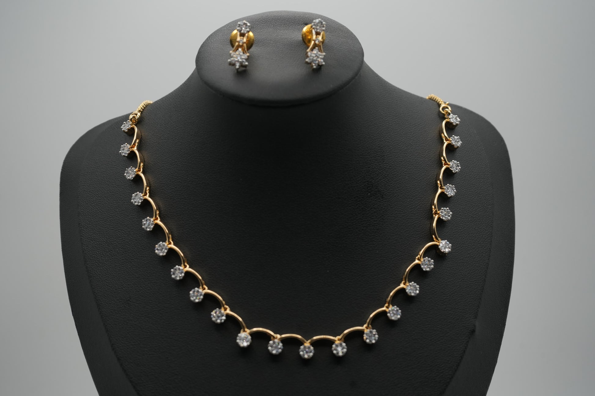 This elegant jewelry set features a gold-toned necklace with a delicate, scalloped design, each curve adorned with sparkling CZ stones. Matching gold-toned stud earrings echo the radiant CZ cluster design, providing a coordinated gleam.