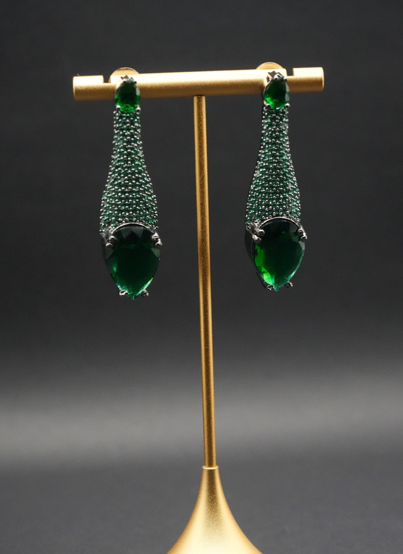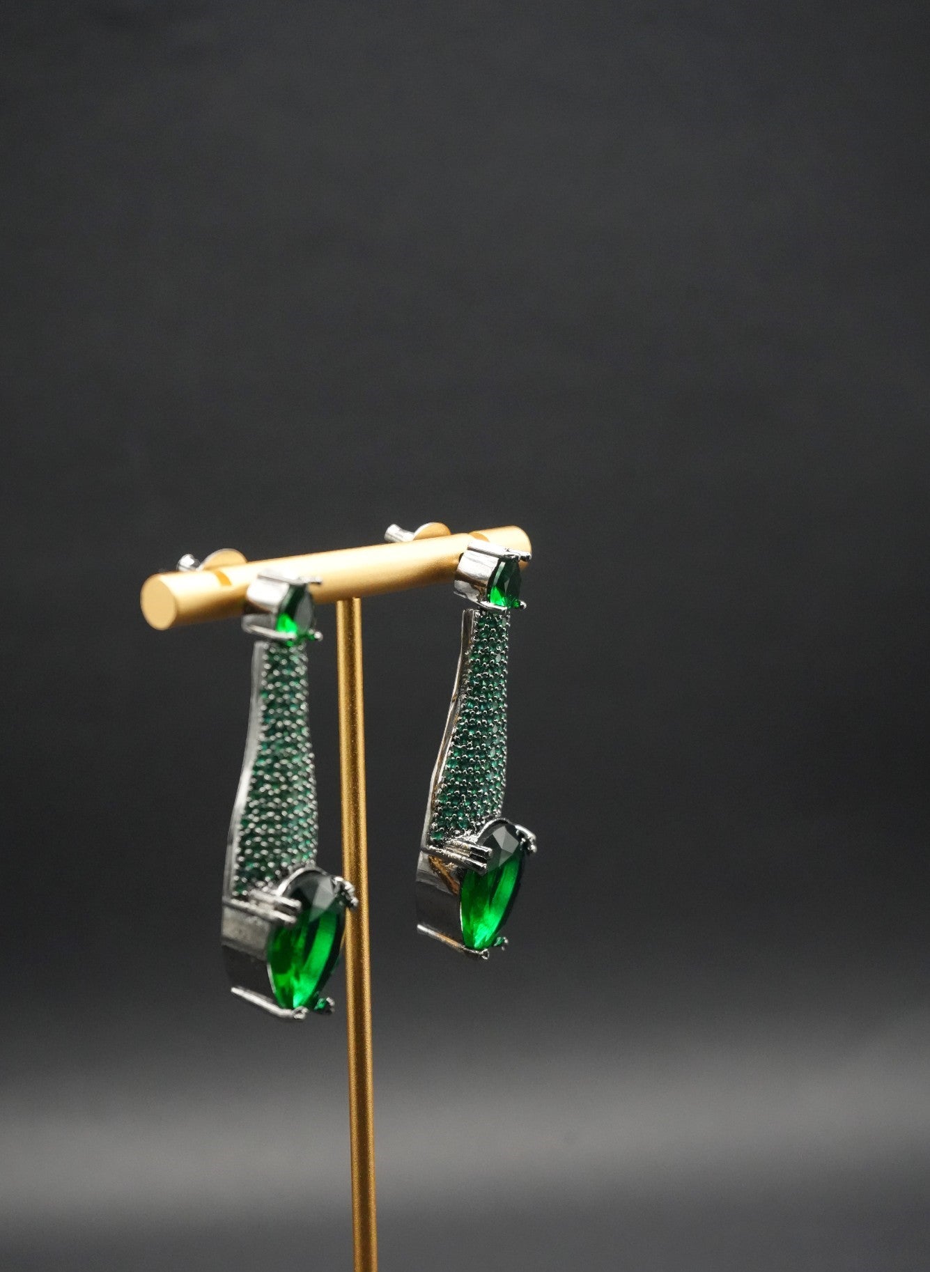 These elegant earrings from Lustrous Jewels feature deep green CZ stones in a sophisticated teardrop design. The earrings are adorned with smaller green CZ stones that create an elongated, shimmering silhouette. The larger green stone at the bottom adds a bold and luxurious touch, making these earrings perfect for special occasions where you want to make a statement. Embrace your distinctive beauty with these stunning accessories❤️