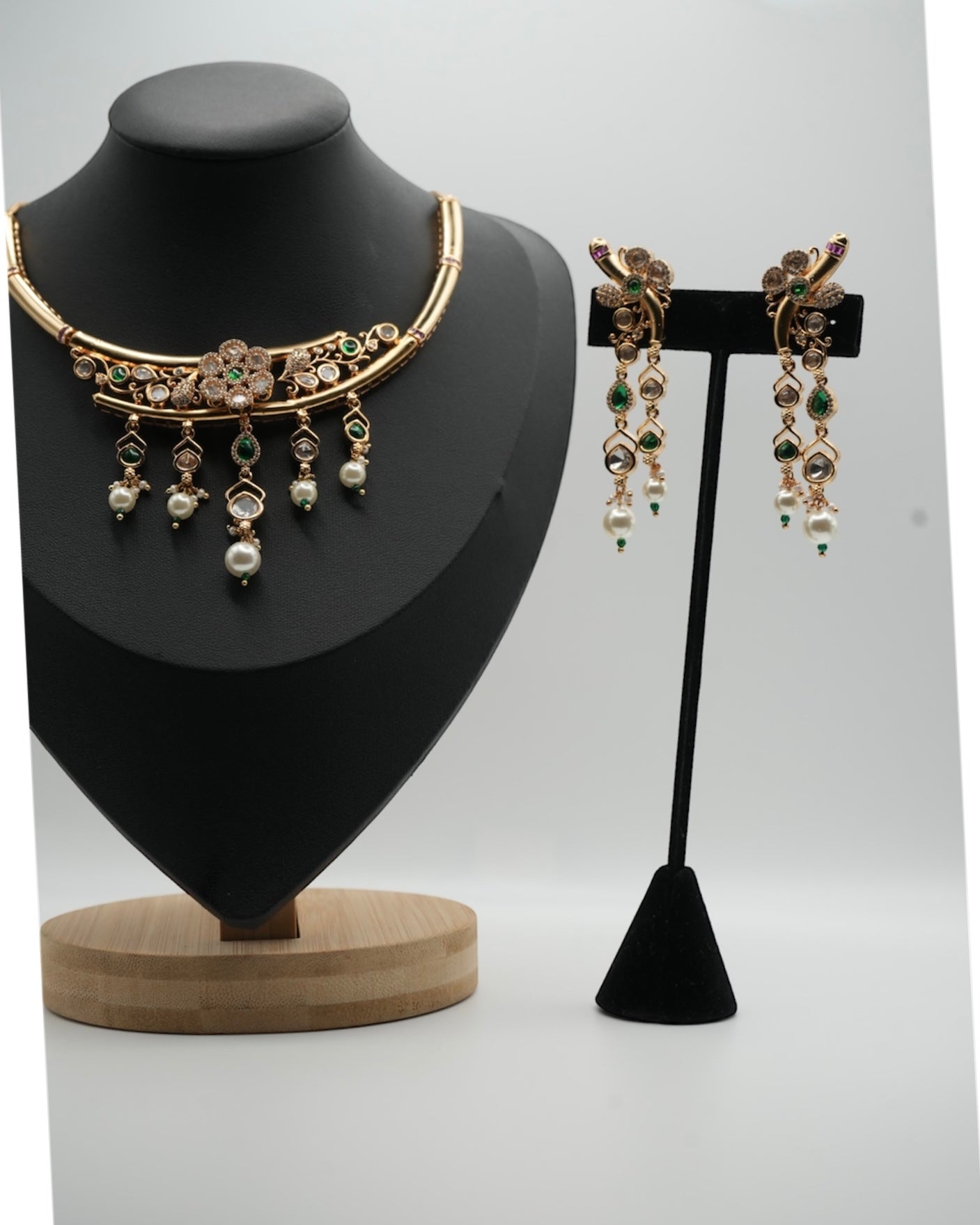 This exquisite necklace set features a rich golden choker-style design, adorned with intricate floral motifs sparkling with clear and green stones. Delicate drops of pearls and smaller green gems gracefully suspend from the central design, adding a touch of classic elegance. The ornate, coordinating chandelier earrings echo the necklace's floral pattern and pearl drops, completing this truly timeless and regal ensemble. This set is perfect for grand occasions, exuding traditional charm and refined beauty.