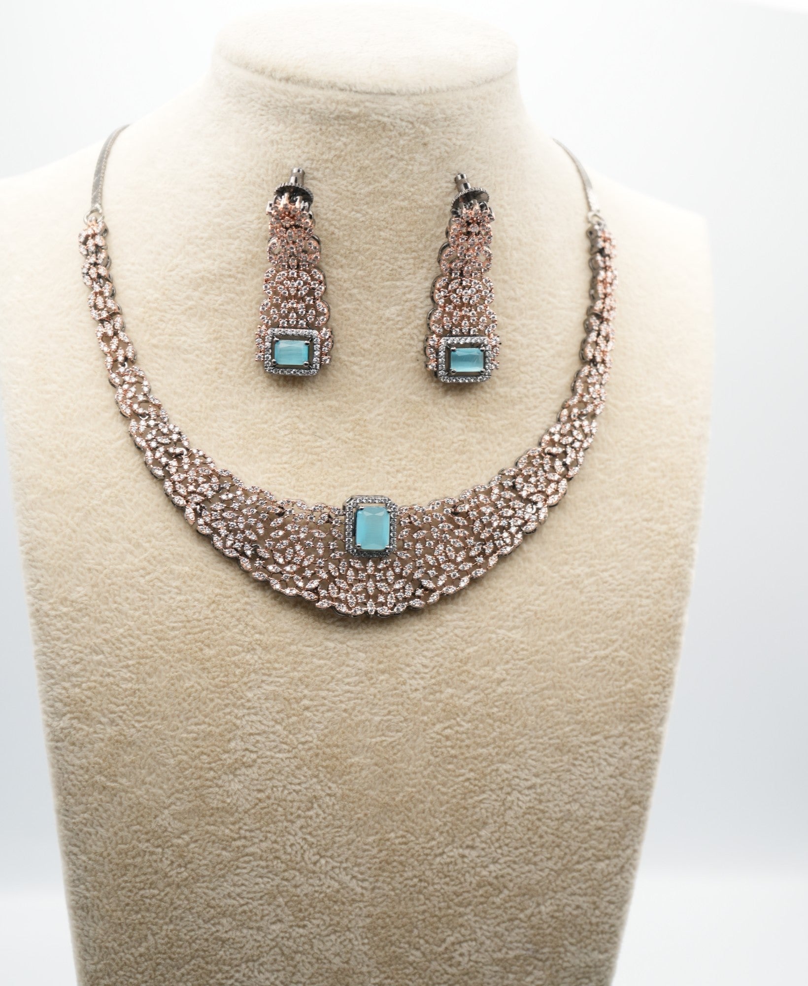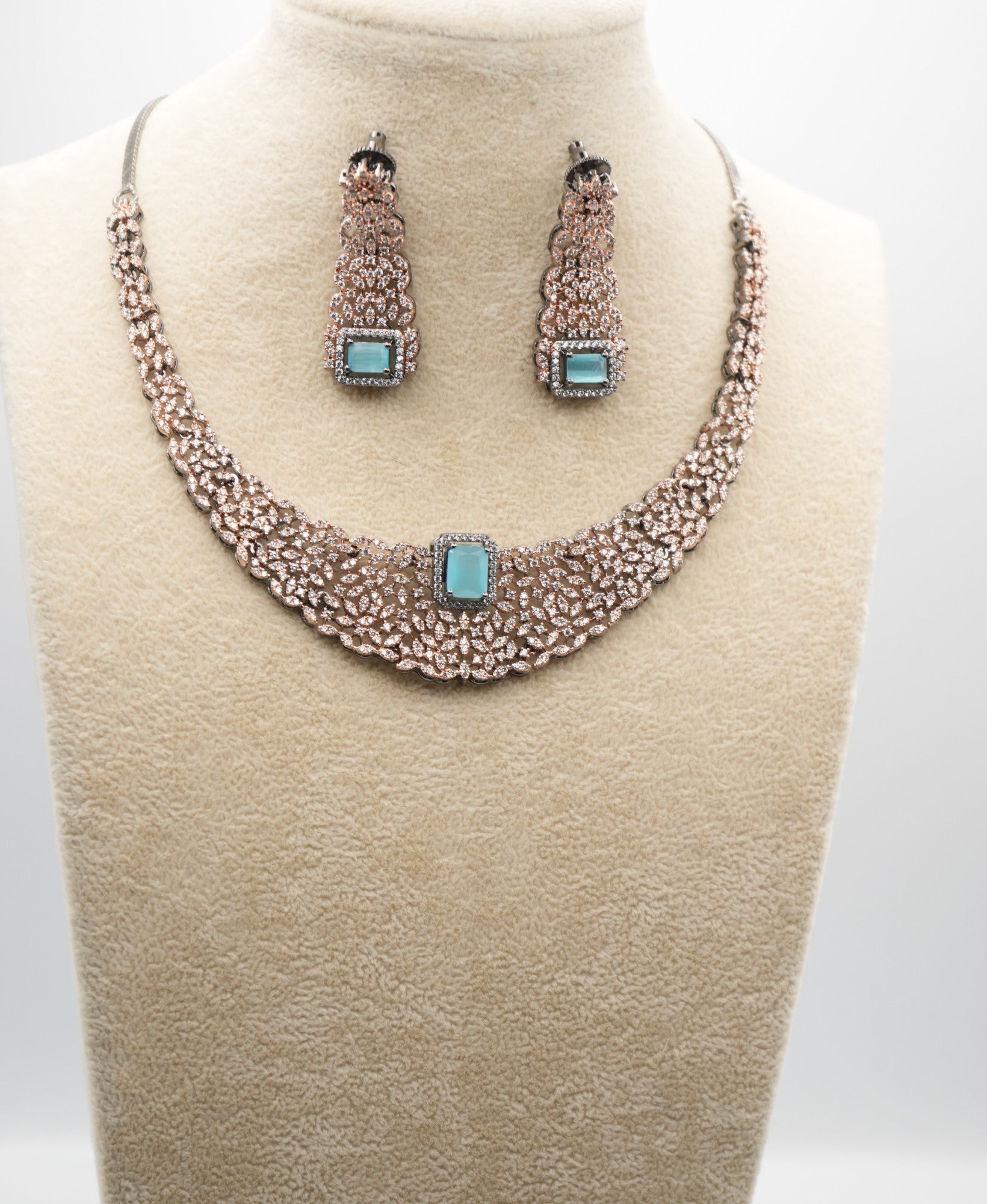 Intricate Silver-Plated Necklace With rose gold combination Set with Aquamarine Accents