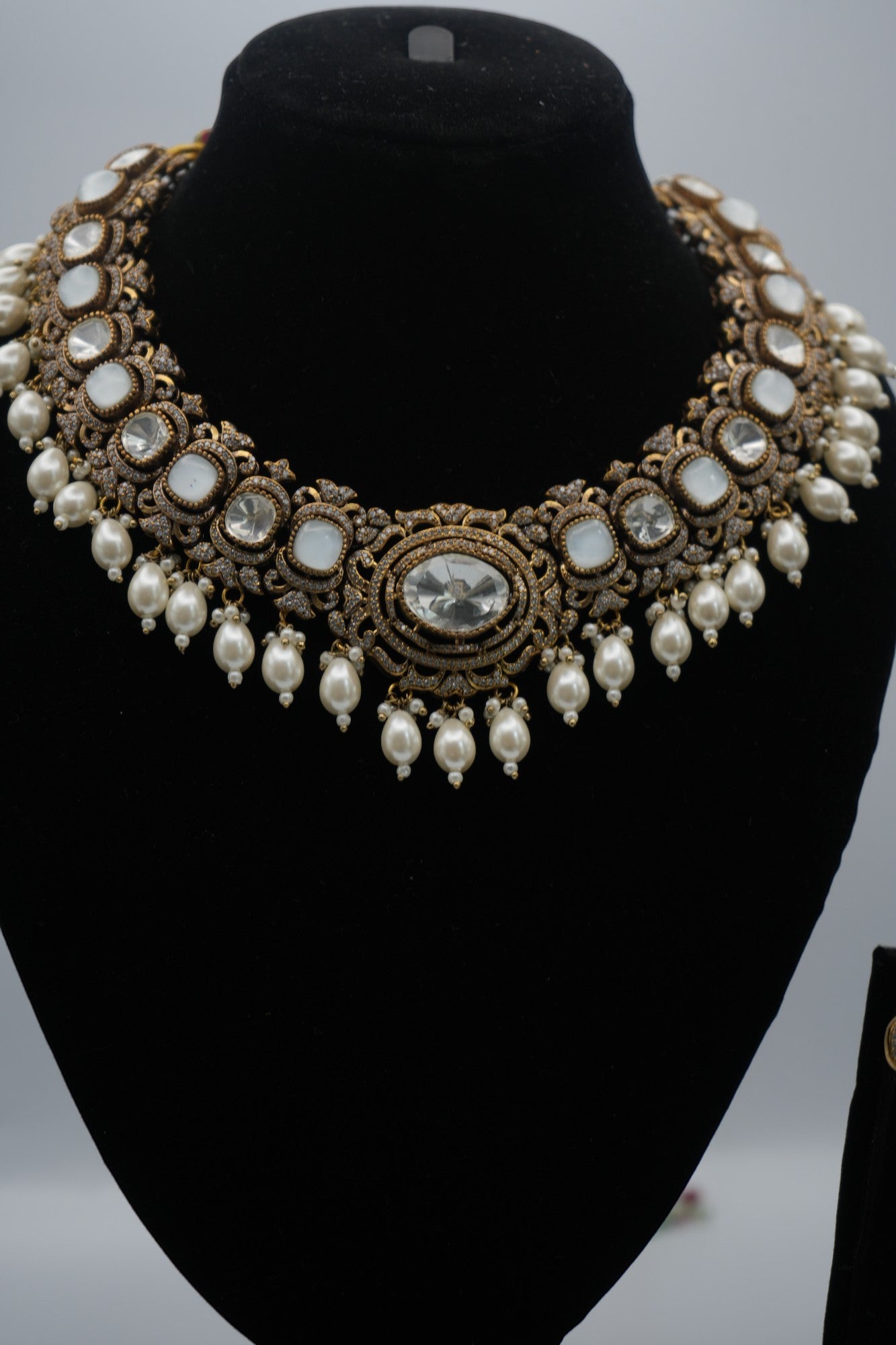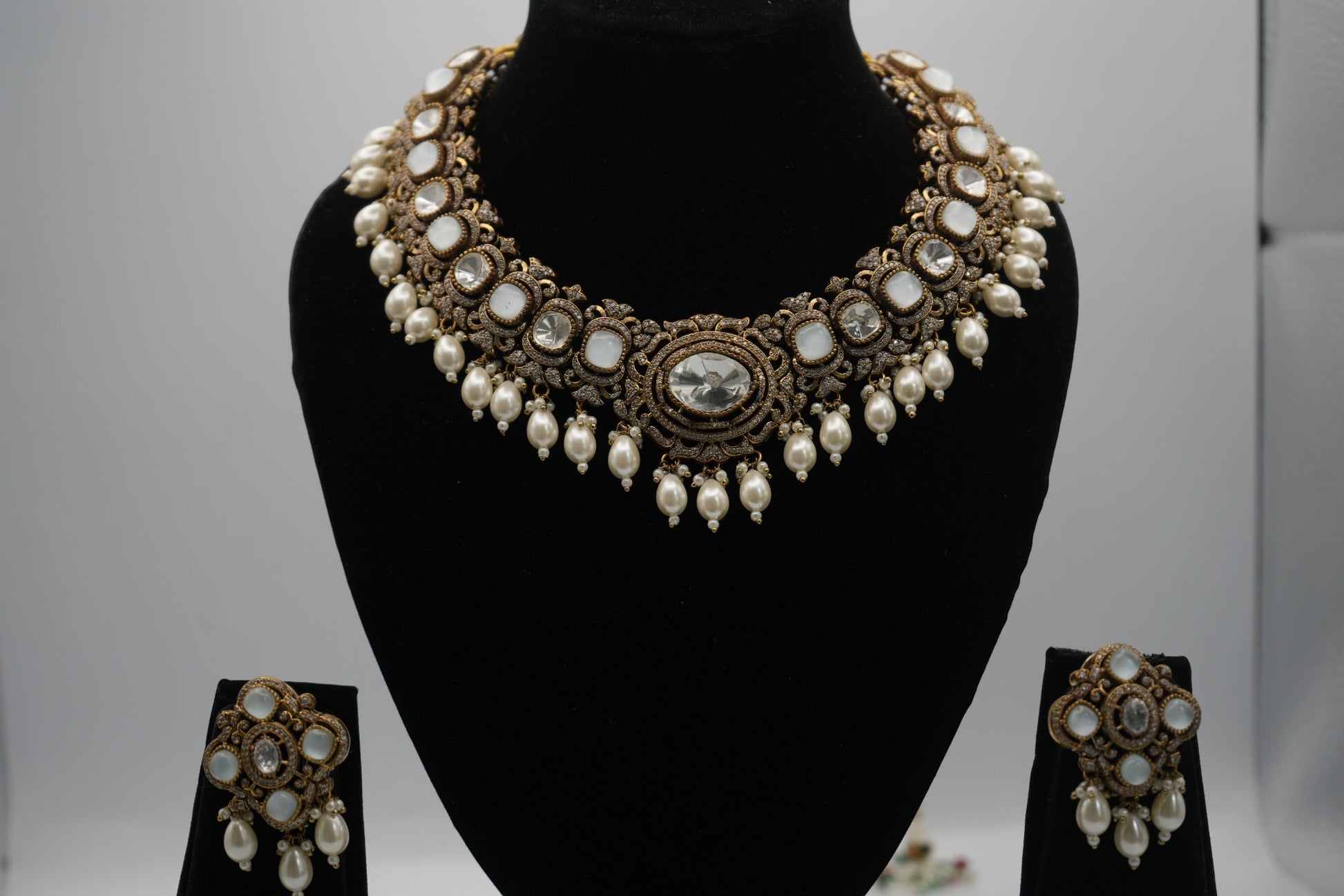 Command attention with the "Ivory Empress" Polki Kundan and Pearl Statement Necklace & Earring Set. This magnificent ensemble blends the timeless allure of uncut Polki-style stones with the delicate beauty of cascading pearls, all set within an intricately detailed, antique gold-toned framework. Perfect for brides, special occasions, and those who desire a touch of regal sophistication.