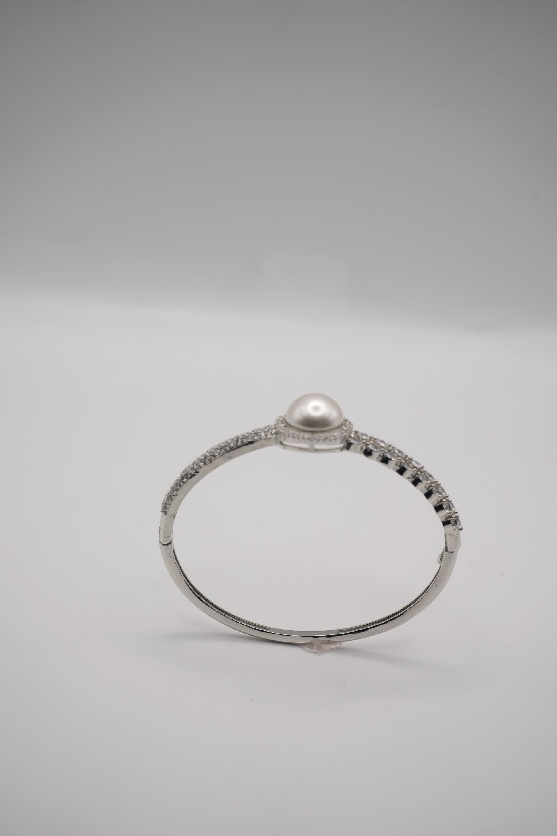 Embrace timeless elegance with the "Luminous Grace" Bangle Bracelet. This exquisite piece features a lustrous central pearl, flanked by sparkling pave-set crystals along a sleek, silver-toned band. Perfect for adding a touch of refined sophistication and understated brilliance to any outfit, from casual chic to formal attire.