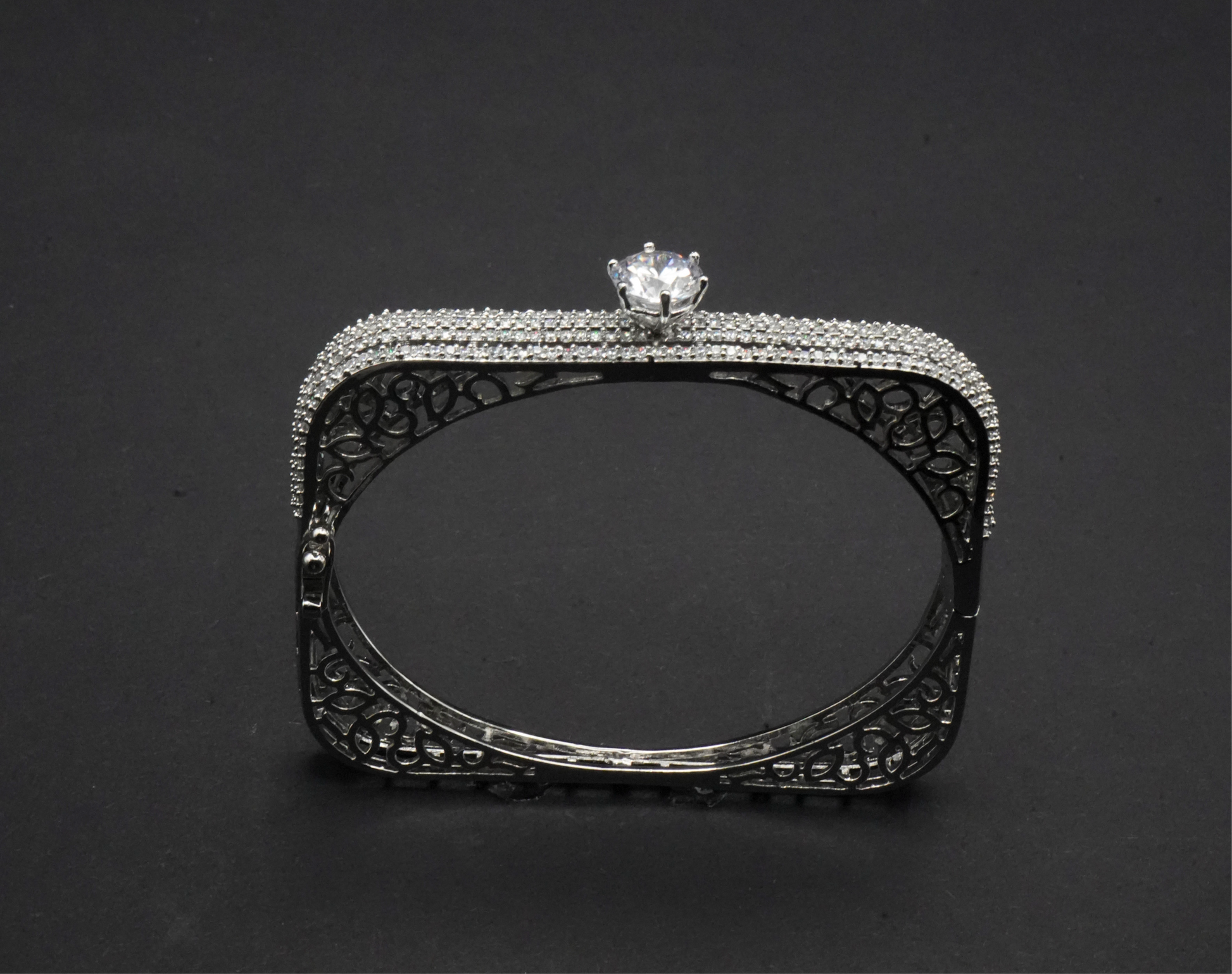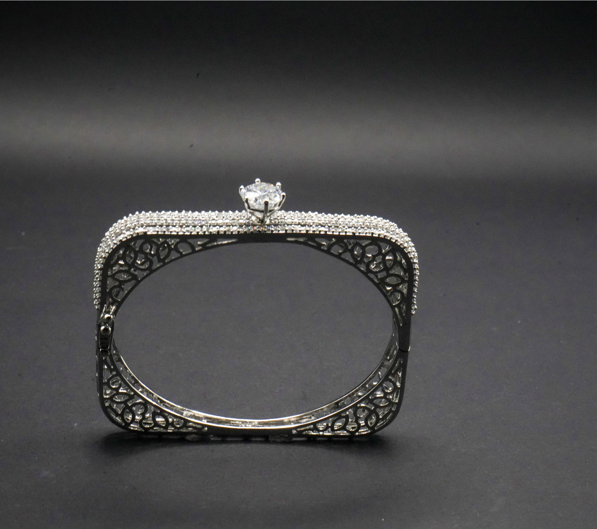 Indulge in the radiance of our Luxe Multi-Strand Bangle, a statement piece that marries timeless design with modern sophistication. This bangle boasts a multi-strand band encrusted with sparkling stones, leading the eye to a captivating solitaire accent that sits prominently at the crest. The intricate openwork on the inner side of the bangle reveals meticulous craftsmanship, ensuring that the piece is stunning from every angle.