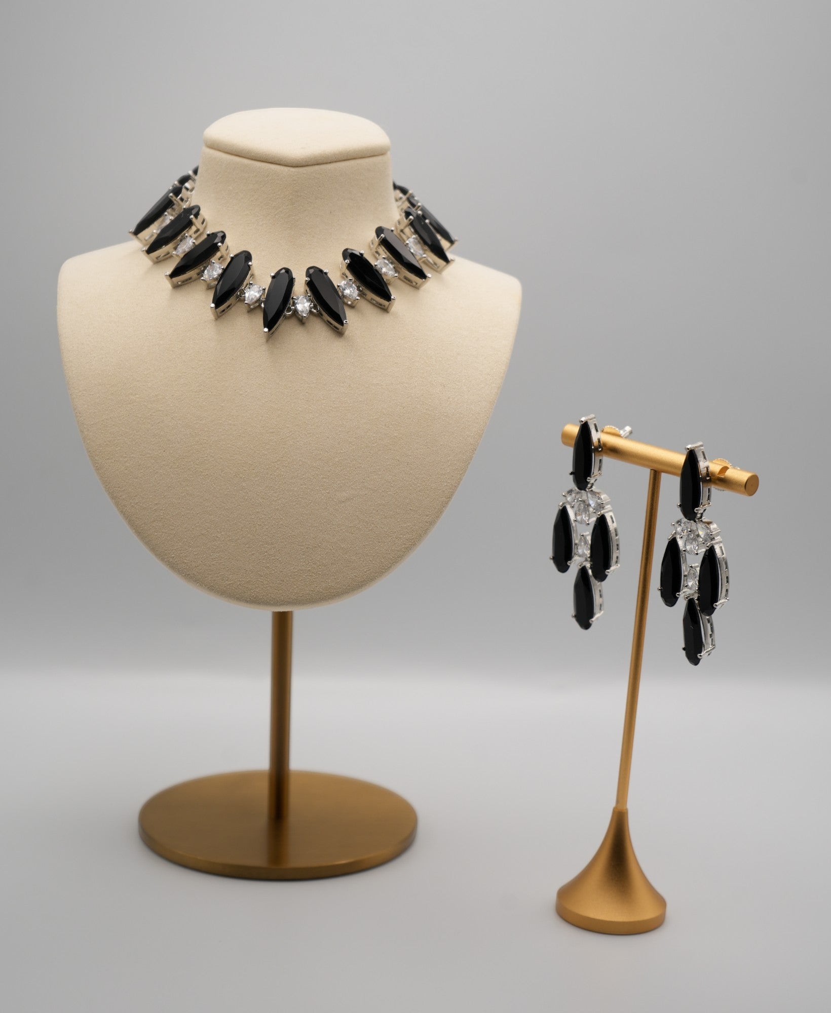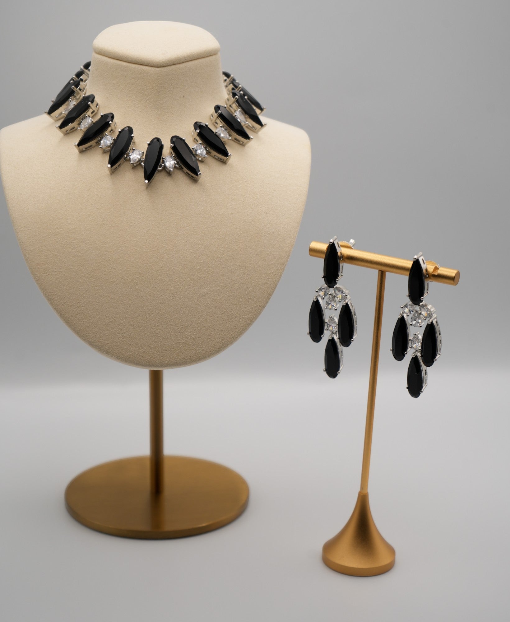 Make a bold and contemporary statement with this modern black crystal and clear crystal necklace and earring set. This striking set features a unique combination of black crystals and sparkling clear crystals, creating a look that is both edgy and glamorous. Perfect for adding a touch of drama and sophistication to evening events, special occasions, or any time you want to make a lasting impression.