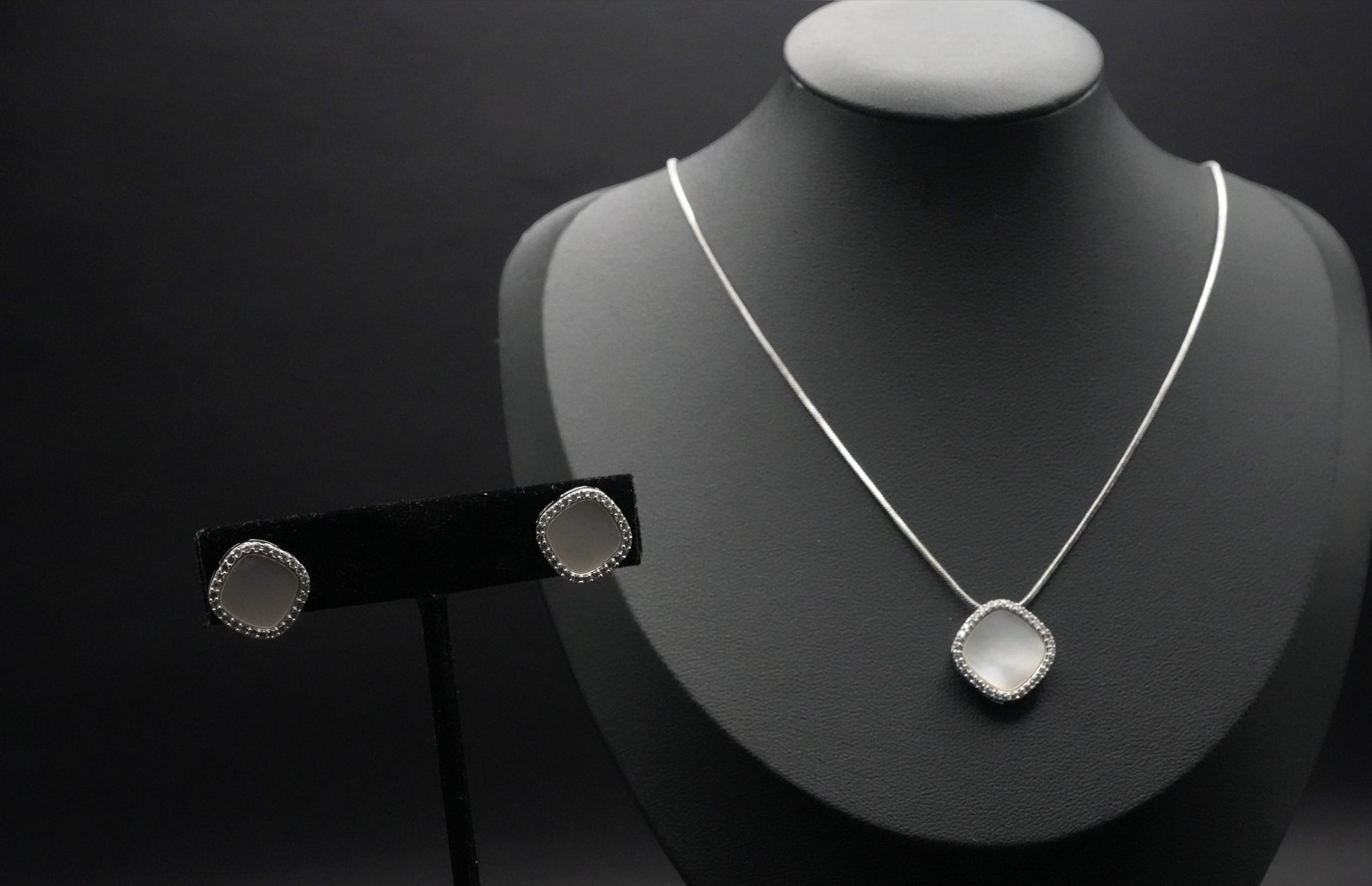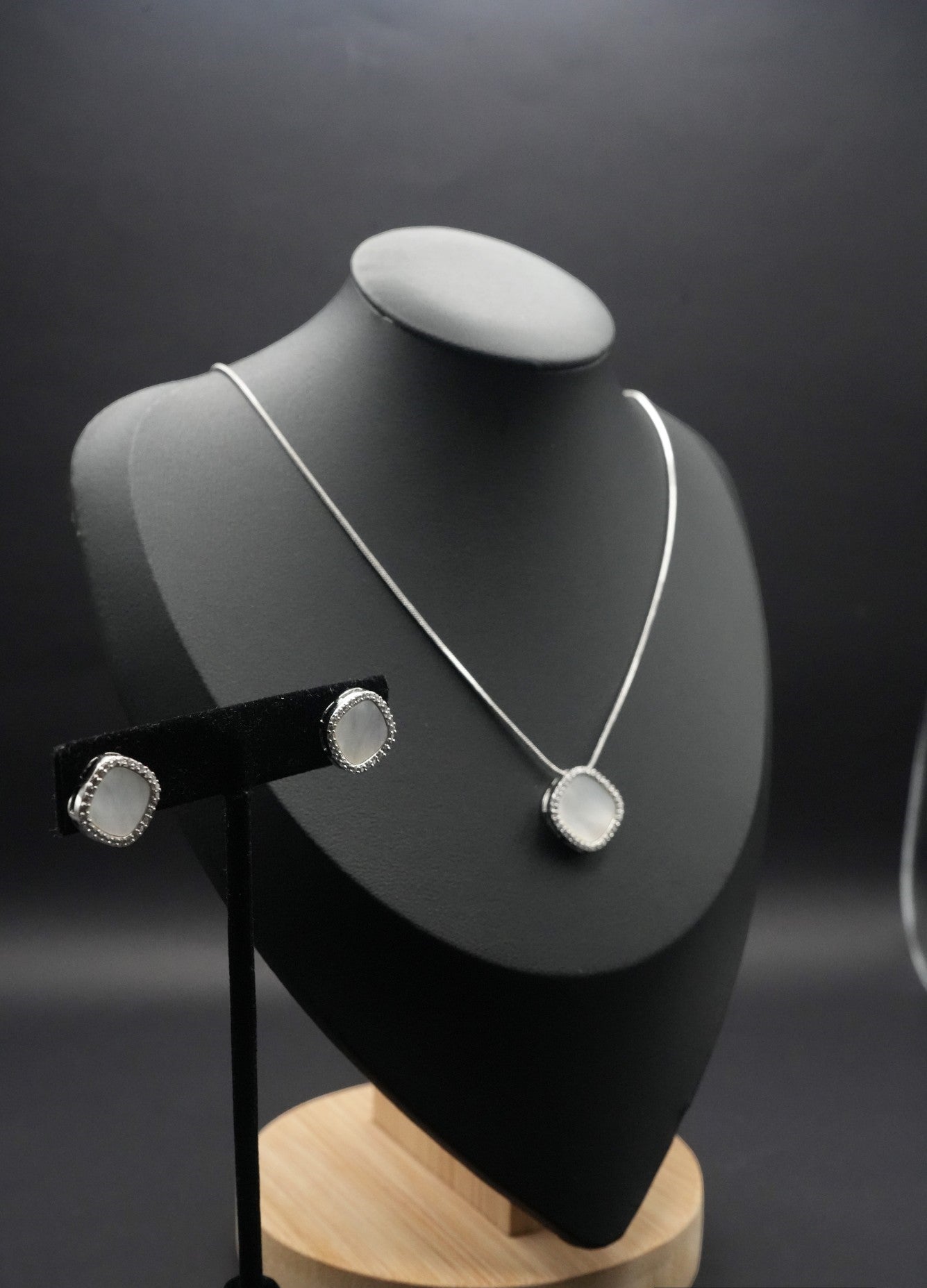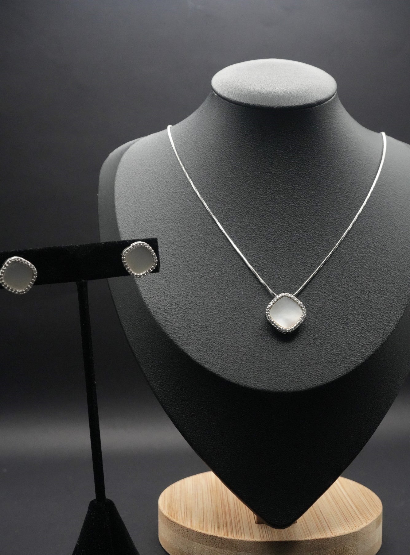 Modern Silver coated Necklace and Earring Set with Frosted Square Pendants