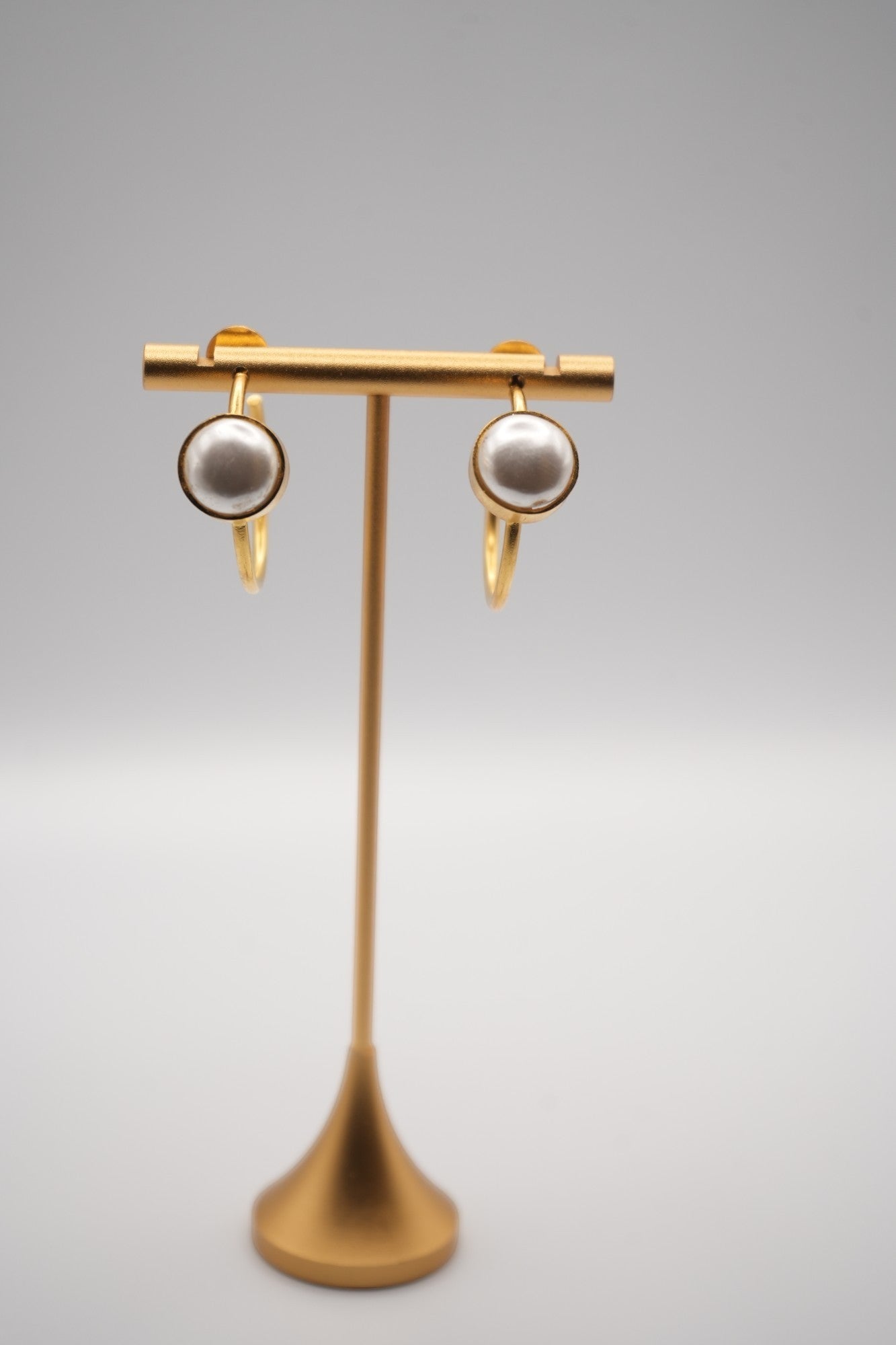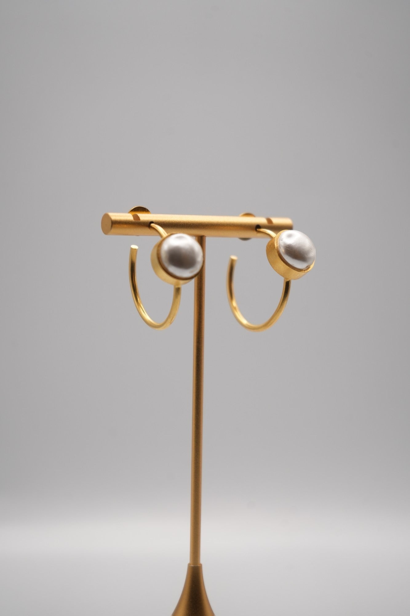 - Design: These earrings feature a modern, open hoop design in a golden hue, each cradling a single, half-encased pearl. The pearl appears to float gracefully within the golden embrace, creating an illusion of weightlessness.