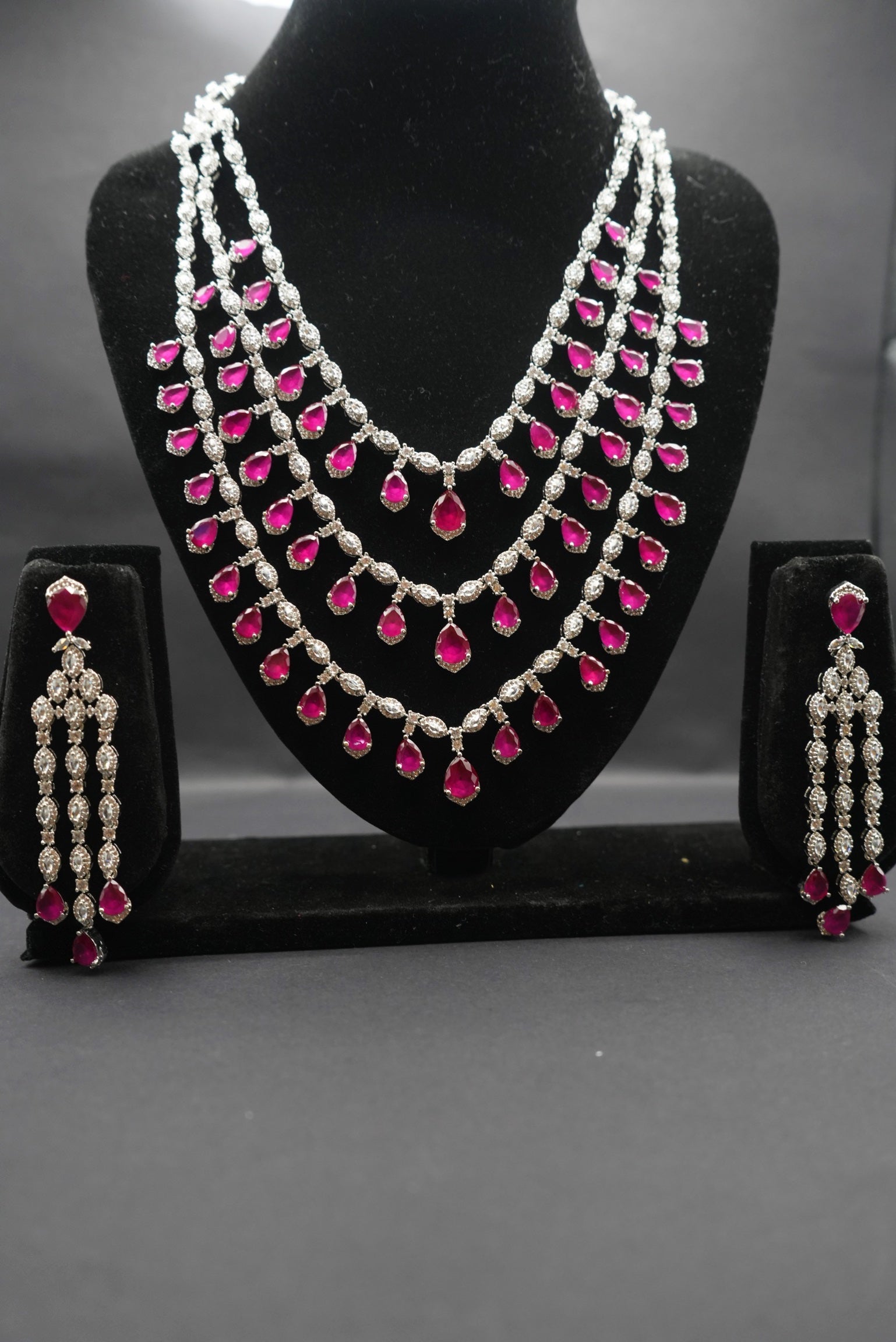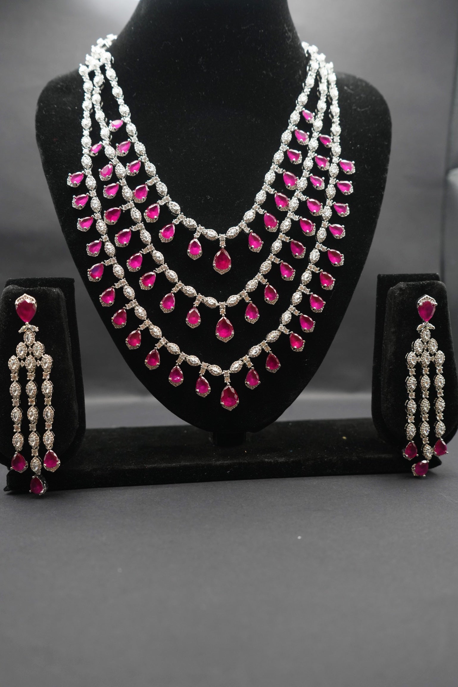Elevate your elegance with this stunning multi-tiered ruby necklace set, complemented by matching statement earrings. The luxurious combination of vibrant ruby-colored stones and sparkling clear accents creates a dramatic and timeless aesthetic, perfect for weddings, galas, or special occasions.