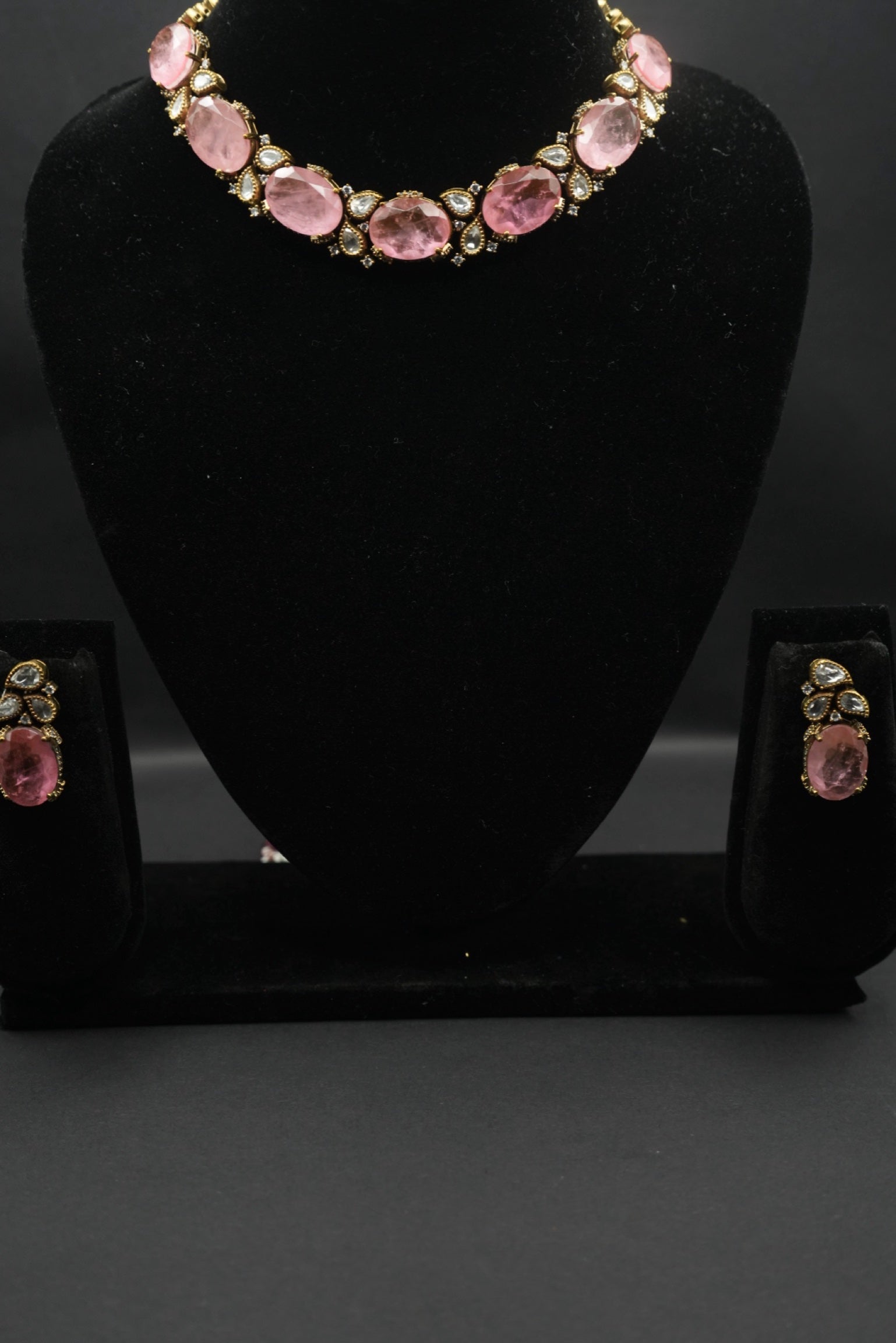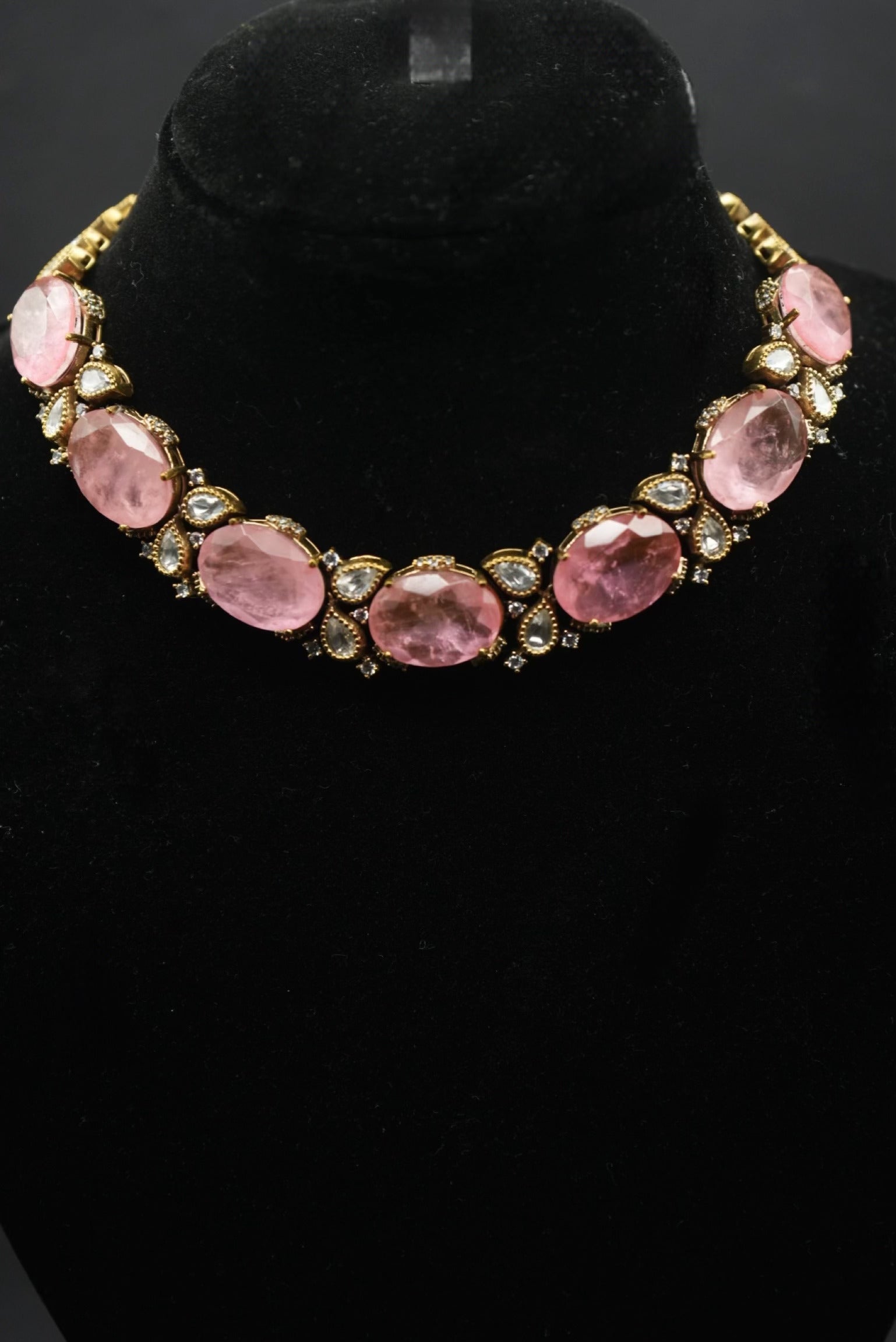 This vibrant necklace features a row of large, oval-shaped gemstones in shades of pink, , separated by delicate diamond-like accents. It’s a stunning statement piece with intricate detailing and a gold-tone setting❤️