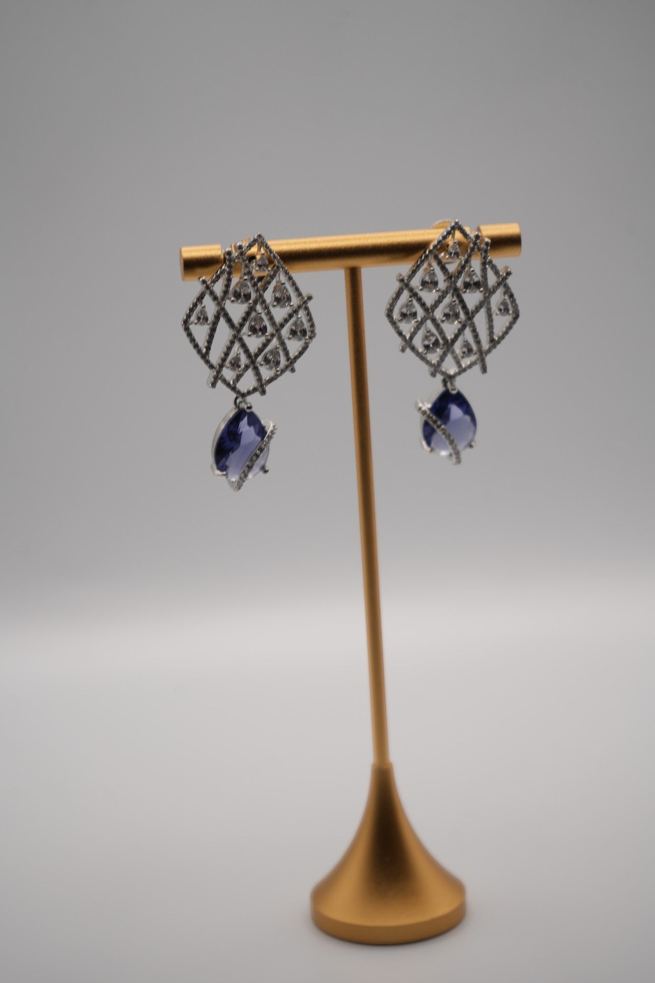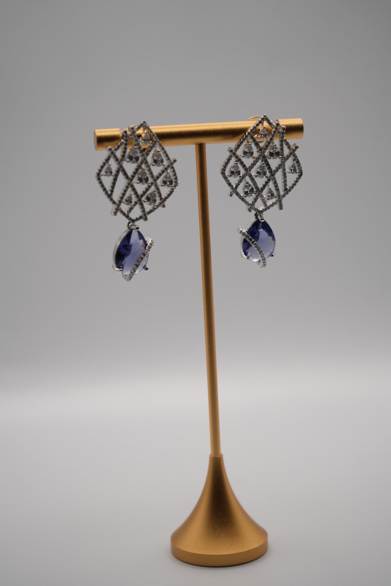 Add a touch of sophisticated sparkle and rich color with the "Indigo Lattice" Drop Earrings. These elegant earrings feature an intricate, diamond-shaped lattice design paved with shimmering crystals, suspending a captivating, indigo-blue gemstone. The delicate framework and the deep hue of the gemstone create a striking contrast, making these earrings a perfect accessory for adding a touch of refined glamour to any ensemble.