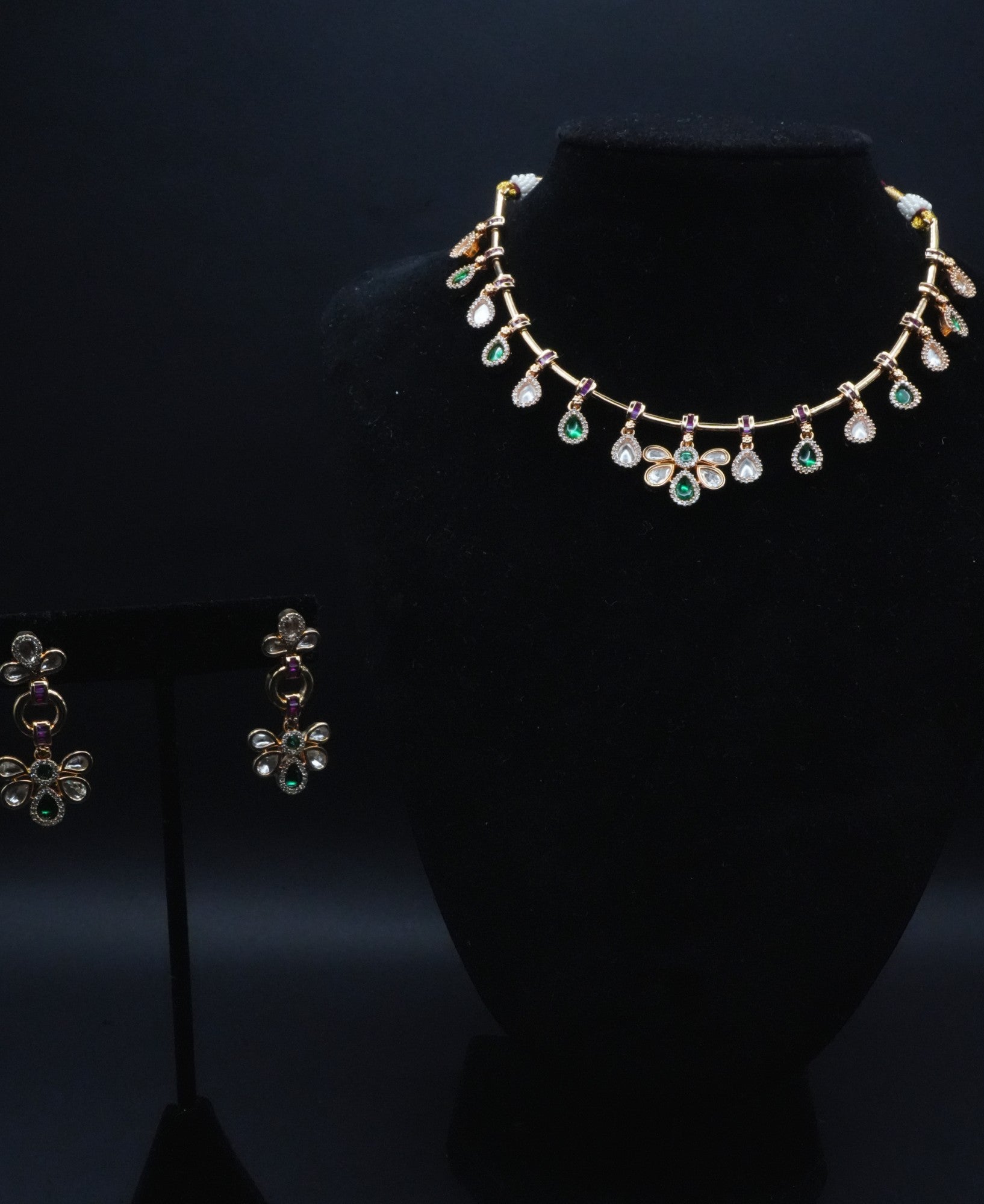 - Floral Design Elements: The necklace features a series of floral motifs crafted with precision, each adorned with a central emerald surrounded by petals made of pear-shaped CZ Stones. The combination of green emeralds and sparkling CZ Stonescreates a mesmerizing effect.