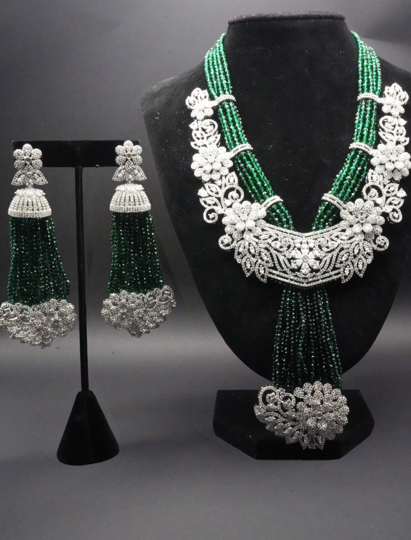 - Matching Chandelier Earrings: The set includes a pair of matching chandelier earrings, each featuring a similar design with green bead tassels and diamond floral motifs. The earrings complement the necklace perfectly, adding to the overall elegance and charm of the set.