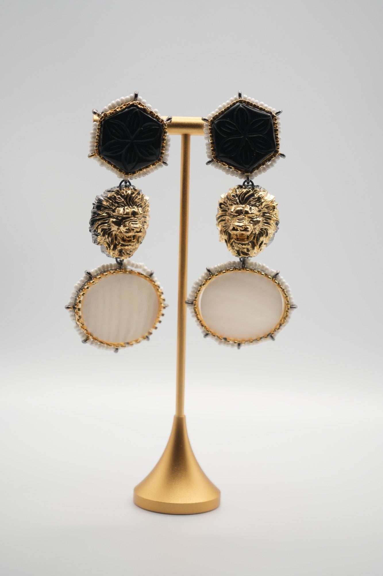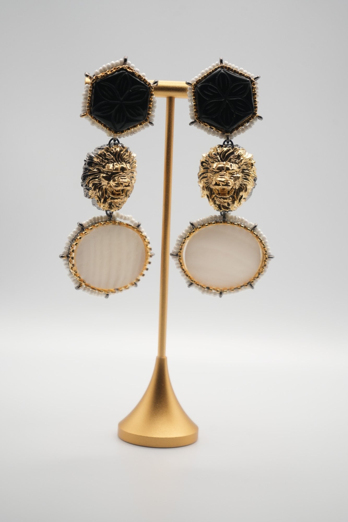 Regal Majesty: Onyx, Lion, and Mother-of-Pearl Statement Earrings