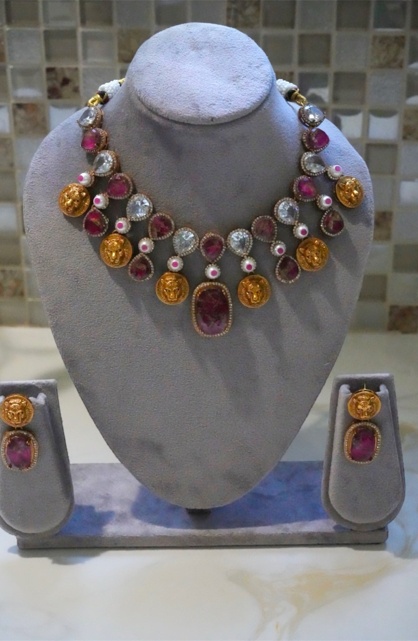 This striking necklace set features rich ruby-hued stones, sparkling clear accents, and unique gold-toned lion head medallions. It comes complete with matching earrings, perfect for a luxurious and distinctive look.
