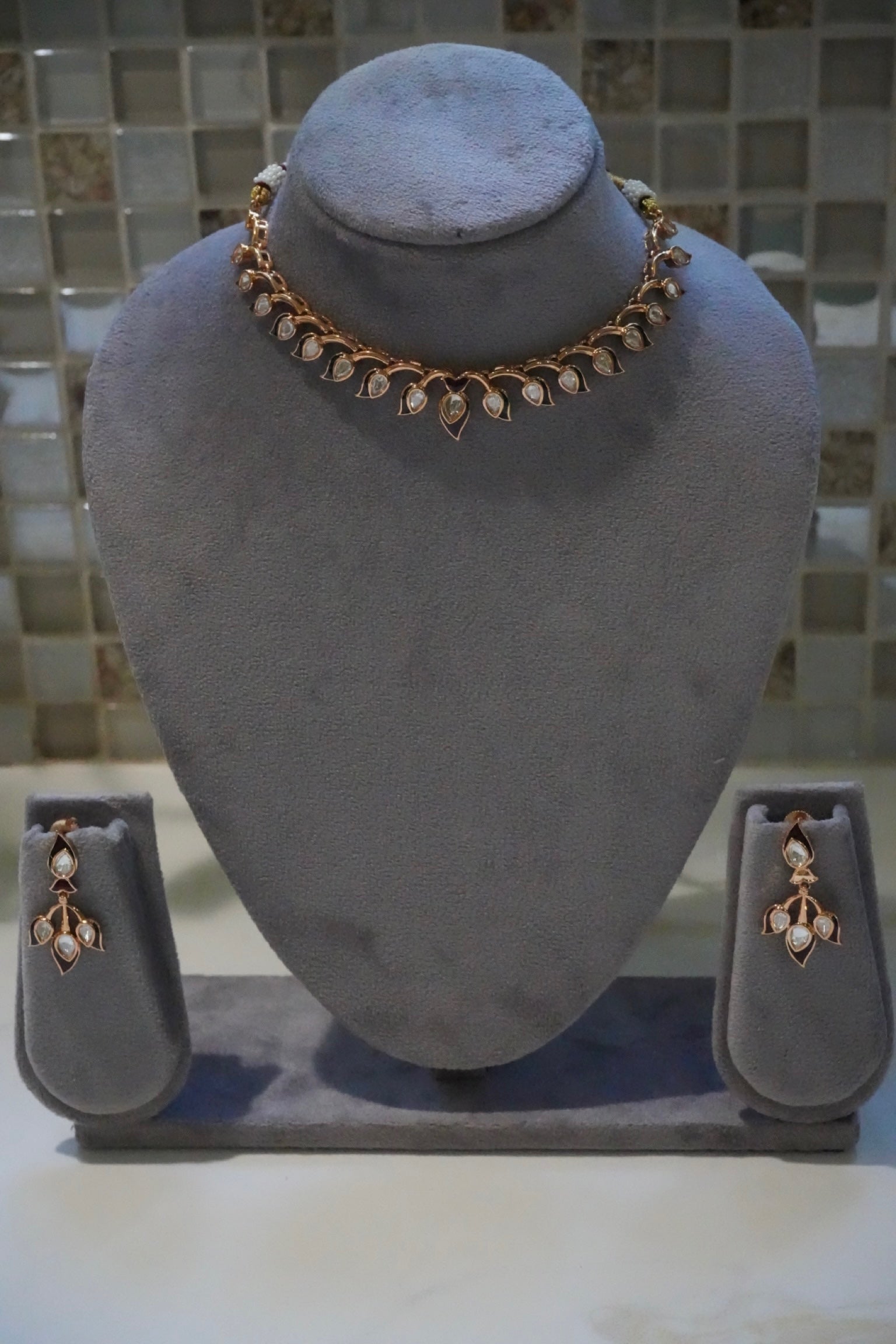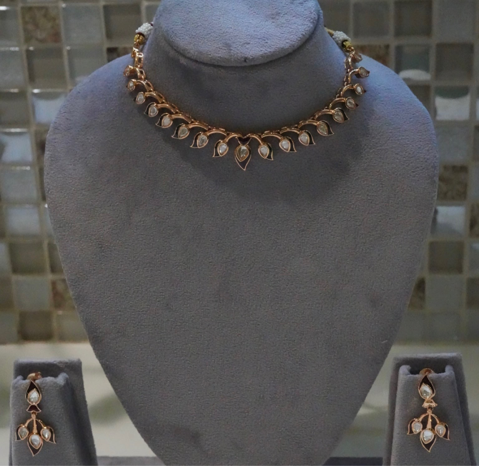 This elegant jewelry set features a beautiful rose gold-tone necklace adorned with delicate leaf-shaped charms, each shimmering with embedded clear stones or enamel. The design offers a sophisticated blend of natural inspiration and subtle sparkle. Completing the set are matching dangle earrings that echo the same refined leaf motif, creating a cohesive and graceful look. The ensemble is presented on a grey jewelry bust, highlighting its intricate details and polished finish.